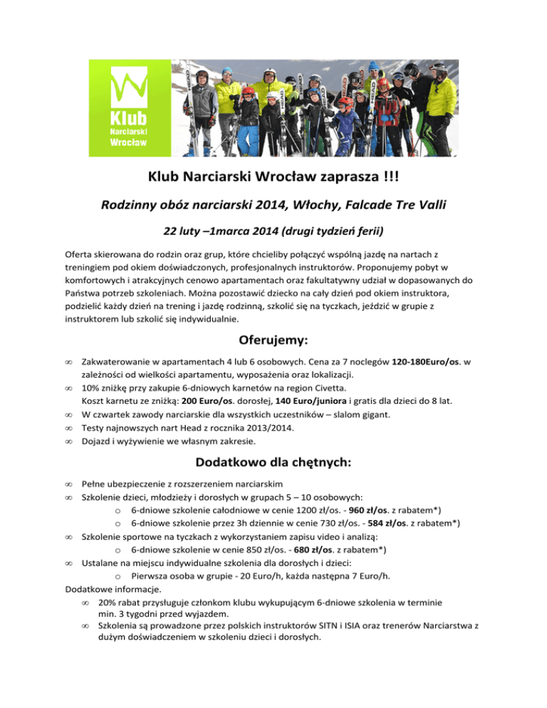 Klub Narciarski Wrocław zaprasza !!! Rodzinny obóz narciarski 2014, Włochy, Falcade Tre Valli 22 luty –1marca 2014 (drugi tydzień ferii) Oferta skierowana do rodzin oraz grup, które chcieliby połączyć wspólną jazdę na nartach z treningiem pod okiem doświadczonych, profesjonalnych instruktorów. Proponujemy pobyt w komfortowych i atrakcyjnych cenowo apartamentach oraz fakultatywny udział w dopasowanych do Państwa potrzeb szkoleniach. Można pozostawić dziecko na cały dzień pod okiem instruktora, podzielić każdy dzień na trening i jazdę rodzinną, szkolić się na tyczkach, jeździć w grupie z instruktorem lub szkolić się indywidualnie. Oferujemy: • • • • • Zakwaterowanie w apartamentach 4 lub 6 osobowych. Cena za 7 noclegów 120-180Euro/os. w zależności od wielkości apartamentu, wyposażenia oraz lokalizacji. 10% zniżkę przy zakupie 6-dniowych karnetów na region Civetta. Koszt karnetu ze zniżką: 200 Euro/os. dorosłej, 140 Euro/juniora i gratis dla dzieci do 8 lat. W czwartek zawody narciarskie dla wszystkich uczestników – slalom gigant. Testy najnowszych nart Head z rocznika 2013/2014. Dojazd i wyżywienie we własnym zakresie. Dodatkowo dla chętnych: • • Pełne ubezpieczenie z rozszerzeniem narciarskim Szkolenie dzieci, młodzieży i dorosłych w grupach 5 – 10 osobowych: o 6-dniowe szkolenie całodniowe w cenie 1200 zł/os. - 960 zł/os. z rabatem*) o 6-dniowe szkolenie przez 3h dziennie w cenie 730 zł/os. - 584 zł/os. z rabatem*) • Szkolenie sportowe na tyczkach z wykorzystaniem zapisu video i analizą: o 6-dniowe szkolenie w cenie 850 zł/os. - 680 zł/os. z rabatem*) • Ustalane na miejscu indywidualne szkolenia dla dorosłych i dzieci: o Pierwsza osoba w grupie - 20 Euro/h, każda następna 7 Euro/h. Dodatkowe informacje. • 20% rabat przysługuje członkom klubu wykupującym 6-dniowe szkolenia w terminie min. 3 tygodni przed wyjazdem. • Szkolenia są prowadzone przez polskich instruktorów SITN i ISIA oraz trenerów Narciarstwa z dużym doświadczeniem w szkoleniu dzieci i dorosłych. Przykładowy apartament Casa Falcade (124 Euro/os.): Ośrodek Tre Valli to kompleks narciarski składający się z trzech dolin: San Pellegrino, Moena - Alpe di Lusia i Falcade, Jest to jeden z najlepszych ośrodków narciarskich w Dolomitach i we Włoszech. Ośrodek narciarski Tre Valli niejednokrotnie zdobywał pierwsze miejsce w rankingu najlepszych terenów narciarskich we Włoszech. Około 120 km świetnie przygotowanych tras, nowoczesne wyciągi, malownicze bardzo różnorodne i atrakcyjne trasy oraz przepiękne widoki. Trasy zajdują się na wysokościach od 1000 do 2800 n.p.m; 95% z nich jest dośnieżana. Najpiękniejszym szczytem jest majestatyczna i malownicza Col Margherita (2513 m) zwana "tarasem Dolomitów". Przełęcz San Pellegrino jest jedną z najpiękniejszych przełęczy w Alpach. Zima ze Szkołą Narciarską Wrocław to gwarancja skutecznej nauki i doskonalenia jazdy, ale także świetnej, zdrowej zabawy w sportowym duchu. Zapraszamy! Cena – w zależności od wybranego wariantu w tym opłacone składki członkowskie w Klubie Narciarskim Wrocław Zgłoszenia i pytania prosimy przesyłać na adres: [email protected] Lepsze lokalizacje sprzedają się już teraz – prosimy o pilne składanie deklaracji!