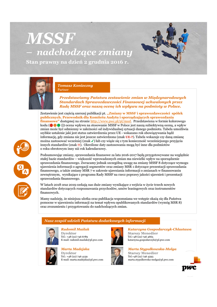 MSSF – nadchodzące zmiany Stan prawny na dzień 2 grudnia 2016 r. Tomasz Konieczny Partner Przedstawiamy Państwu zestawienie zmian w Międzynarodowych Standardach Sprawozdawczości Finansowej uchwalonych przez Radę MSSF oraz naszą ocenę ich wpływu na podmioty w Polsce. Zestawienie jest częścią szerszej publikacji pt. ,,Zmiany w MSSF i sprawozdawczości spółek publicznych. Przewodnik dla Komitetu Audytu i sporządzających sprawozdania finansowe” dostępnej na stronie http://www.pwc.pl/pl/mssf. Przedstawiona w formie kolorowego kodu ( ) ocena wpływu na stosowanie MSSF w Polsce jest naszą subiektywną oceną, a wpływ zmian może być odmienny w zależności od indywidualnej sytuacji danego podmiotu. Tabela umożliwia szybkie ustalenie jaki jest status zatwierdzenia przez UE - wskazano rok obowiązywania bądź informację, gdy zmiana nie jest jeszcze zatwierdzona (znak UE-?). Tabela wskazuje czy daną zmianę można zastosować wcześniej (znak ✔) lub czy wiąże się z tym konieczność wcześniejszego przyjęcia innych standardów (znak !!!). Określone daty zastosowania mogą być inne dla podmiotów o roku obrotowym inny niż rok kalendarzowy. Podsumowując zmiany, sprawozdania finansowe za lata 2016-2017 będą przygotowywane na względnie stałej bazie standardów – większość wprowadzonych zmian ma niewielki wpływ na sporządzenie sprawozdania finansowego. Zwracamy jednak szczególną uwagę na zmiany MSSF 8 dotyczące wymogu ujawnienia informacji o agregacji segmentów oraz zmiany MSR 1 dotyczące prezentacji sprawozdania finansowego, a także zmiany MSR 7 w zakresie ujawniania informacji o zmianach w finansowaniu zewnętrznym, wynikające z programu Rady MSSF na rzecz poprawy jakości ujawnień i prezentacji sprawozdania finansowego. W latach 2018 oraz 2019 czekają nas duże zmiany wynikające z wejścia w życie trzech nowych standardów dotyczących rozpoznawania przychodów, umów leasingowych oraz instrumentów finansowych. Mamy nadzieję, że niniejsza ulotka oraz publikacja wspomniana we wstępie okażą się dla Państwa pomocne w ujawnieniu informacji na temat wpływu opublikowanych standardów (wymóg MSR 8) oraz zrozumieniu i przygotowaniu do nadchodzących zmian. Nasz zespół udzieli Państwu dodatkowych informacji Radomił Maślak Dyrektor Katarzyna Gospodarczyk-Chlastawa Starszy Menedżer Tel.: +48 (22) 746 6789 E-mail: [email protected] Tel.+48 (22) 746 4665 [email protected] Marta Madejska Dyrektor Marta Stypułkowska-Molga Starszy Menedżer Tel.: +48 (22) 746 4139 E-mail: [email protected] Tel.+48 (22) 746 4593 [email protected] WYKAZ OPUBLIKOWANYCH ZMIAN W MSSF Charakter zmiany Nowy standard lub nowa interpretacja Zmiana istniejącego standardu lub interpretacji Zmiana standardu w ramach programu ulepszeń MSSF Rok obowiązywania w UE 2015 – Rok od którego w Unia Europejska wymaga stosowania danej zmiany (dla rok finansowy = rok kalendarzowy); UE-? – oznacza, że dana zmiana nie została jeszcze zatwierdzona, a ND, że nie wymaga zatwierdzenia lub została odrzucona przez UE. Ocena wpływu znaczący wpływ na wiele podmiotów działających w Polsce, znaczący wpływ na niewielką grupę podmiotów działających w Polsce, niewiele podmiotów w Polsce dotyczy dana problematyka lub niewielki wpływ zmian lub zmiany wprowadzają dodatkowe opcje czy uproszczenia, ale nie nakładają dodatkowych obowiązków, zasadniczo bez wpływu na podmioty działające w Polsce, ewentualny wpływ może pojawić się w spółkach zagranicznych podlegających konsolidacji bądź dla podmiotów stosujących MSSF po raz pierwszy. Wcześniejsze zastosowanie Czy dany standard lub jego zmiana mogą, po zatwierdzeniu przez UE, być zastosowane do okresów wcześniejszych (✔ =Tak, ✖ = Nie, !!! – tak, ale wymaga jednocześnie zastosowania wcześniejszego innych standardów). Zatwierdzone przez RMSR do stosowania przed 1 stycznia 2016 r. i obowiązujące w UE od 2016 r. 2016 ✔ MSSF 2 „Płatności oparte na akcjach” – definicja warunku nabycia uprawnień 2016 ✔ MSSF 3 „Połączenia przedsięwzięć” – wyjaśnienie obowiązku uiszczenia zapłaty warunkowej 2016 ✔ MSSF 8 „Segmenty operacyjne” – ujawnienie subiektywnego osądu przy agregowaniu 2016 ✔ Zmiany do MSR 19 „Świadczenia pracownicze” dotyczące programów określonych świadczeń Roczny program poprawek 2010-2012 ND ✔ MSR 16 „Rzeczowe aktywa trwałe” i MSR 38 „Wartości niematerialne” – sposób ujęcia wartości bilansowej brutto i amortyzacji przy zastosowaniu modelu opartego na wartości przeszacowanej 2016 ✔ MSR 24 „Ujawnianie informacji na temat podmiotów powiązanych” – ujawnianie informacji przez jednostkę sprawozdawczą 2016 ✔ Zmiany do MSSF 11 „Wspólne porozumienia umowne” w zakresie rachunkowości nabycia udziału we wspólnej działalności 2016 ✔ Zmiany do MSR 16 „Rzeczowe aktywa trwałe” i do MSR 41 „Rolnictwo” – Rolnictwo: Rośliny produkcyjne 2016 ✔ Zmiany do MSR 16 „Rzeczowe aktywa trwałe” oraz do MSR 38 „Wartości niematerialne” w zakresie wyjaśnienia dopuszczalnych metod amortyzacji 2016 ✔ Zmiany do MSR 27 „Jednostkowe sprawozdania finansowe” w zakresie stosowania metody praw własności w jednostkowych sprawozdaniach finansowych 2016 ✔ Zmiany do MSSF 10 „Skonsolidowane sprawozdania finansowe”, MSSF 12 „Ujawnienia udziałów w innych jednostkach” i do MSR 28 „Inwestycje w jednostkach stowarzyszonych” – Spółki inwestycyjne: Stosowanie zwolnienia z konsolidacji UE-? ✔ ND ✔ 2016 ✔ MSSF 5 „Aktywa trwałe przeznaczone do sprzedaży oraz działalność zaniechana” – metody zbycia 2016 ✔ MSSF 7 „Instrumenty finansowe: Informacje do ujawnienia” – umowy o obsługę i śródroczne sprawozdania finansowe 2016 ✔ MSR 19 „Świadczenia pracownicze” – ustalanie stóp dyskonta dla obowiązków z tytułu świadczeń po okresie zatrudnienia 2016 ✔ MSR 34 „Śródro