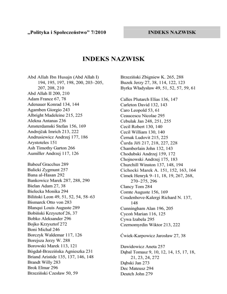 „Polityka i Społeczeństwo” 7/2010 INDEKS NAZWISK INDEKS NAZWISK Abd Allah Ibn Husajn (Abd Allah I) 194, 195, 197, 198, 200, 203–205, 207, 208, 210 Abd Allah II 200, 210 Adam France 67, 78 Adenauer Konrad 134, 144 Agamben Giorgio 243 Albright Madeleine 215, 225 Alekna Antanas 236 Amsterdamski Stefan 156, 169 Andrejčak Imrich 213, 222 Andrusiewicz Andrzej 177, 186 Arystoteles 151 Ash Timothy Garton 266 Aumiller Andrzej 117, 126 Babeuf Gracchus 289 Balicki Zygmunt 257 Bana al-Hasan 292 Bankowicz Marek 287, 288, 290 Bielan Adam 27, 38 Bielecka Monika 294 Biliński Leon 49, 51, 52, 54, 58–63 Bismarck Otto von 283 Blanqui Louis Auguste 289 Bobiński Krzysztof 26, 37 Bobko Aleksander 296 Bojko Krzysztof 272 Boni Michał 246 Borczyk Waldemar 117, 126 Borejsza Jerzy W. 288 Borowski Marek 113, 121 Bógdał-Brzezińska Agnieszka 231 Briand Aristide 135, 137, 146, 148 Brandt Willy 283 Brok Elmar 296 Brzeziński Czesław 50, 59 Brzeziński Zbigniew K. 265, 288 Buzek Jerzy 27, 38, 114, 122, 123 Byrka Władysław 49, 51, 52, 57, 59, 61 Calles Plutarch Elías 136, 147 Carleton David 132, 143 Caro Leopold 53, 61 Ceaucescu Nicolae 295 Cebulak Jan 248, 251, 255 Cecil Robert 130, 140 Cecil William 130, 140 Černak Ludovit 215, 225 Čurda Jiří 217, 218, 227, 228 Chamberlain John 132, 143 Chodubski Andrzej 159, 172 Chojnowski Andrzej 175, 183 Churchill Winston 137, 148, 194 Cichocki Marek A. 151, 152, 163, 164 Cimek Henryk 9–11, 18, 19, 267, 268, 270–275, 296 Clancy Tom 284 Comte Auguste 156, 169 Coudenhove-Kalergi Richard N. 137, 148 Cunningham Alan 196, 205 Cycoń Marian 116, 125 Cywa Izabela 295 Czernomyrdin Wiktor 213, 222 Ćwiek-Karpowicz Jarosław 27, 38 Dawidowicz Aneta 257 Dąbal Tomasz 9, 10, 12, 14, 15, 17, 18, 21, 23, 24, 272 Dąbski Jan 273 Dec Mateusz 294 Deutch John 279 298 INDEKS NAZWISK Devereux Robert 130, 140 Dmowski Roman 14, 23, 237–239, 272 Dudek Antoni 262, 265 Duleba Alexander 213, 223 Dymek Benon 135, 146 Dzielski Mirosław 264 Dzierzgowski Wacław 51, 60 Dzikowski Waldy 117, 126 Dzurinda Mikulaš 215, 218, 224, 227 Eberhardt Piotr 237 Edward Seymour 130, 141 Edward VI 130, 141 Ekiert Jan 67, 78 Elżbieta I Tudor 129–131, 139–141 Englich Józef 49–51, 53, 58, 59, 61 Everett Margaret A. 130, 140 Fałkowski Mateusz 36, 48 Fedan Roman 253 Fijołek Marcin 294, 296 Filip II Habsburg 129, 139 Friedrich Carl J. 288 Frish Ralph 249 Friszke Andrzej 266 Fromowicz Leopold 53, 61 Furman Wojciech 294–296 Garnuszewski Henryk 178, 186 Gasperi Alcide de 134, 144 Gawin Dariusz 151, 163 Gawlikowski Krzysztof 265 Gawrycki Marcin Florian 231 Gąsior-Niemiec Anna 67, 69, 72, 74, 78, 80, 83, 84, 86 Gebethner Stanisław 264 Ghazvinian John 276–278 Gilius Paulus 237 Gliński Piotr 66–69, 72–74, 77–80, 83–86 Glubb John Bagot 195–198, 200, 204, 206–208, 210 Goliński Marian 116, 125 Góra Władysław 180, 189 Grabowska Sabina 111, 112, 119–121 Grabski Władysław 52, 54, 55, 60, 63, 64 Grygiel Paweł 253 Grzebyk Mariola 253 Grzybowski Konstanty 288 Gumkowska Marta 66, 77 Hasan al-Ban 292 Havel Vaclav 216, 225 Henryk VIII Tudor 130, 141 Herbst Jan 66, 77 Herman Maciej 213–216, 222–225 Higley John 263 Hofman Ilona 150, 162 Horn Gyula 214, 223 Hudzik Jan P. 150, 162 Husajn Ibn Ali 194, 203 Husajn Ibn Talal (Husajn I) 197, 199, 200, 207, 210 Ikonowicz Piotr 116, 125 Innocenty III 129, 139 Iwaszkiewicz Janusz 134, 135, 145 Jakub I 131, 132, 141 Jakub (James) VI Stuart 130, 131, 140, 141 Jamsheer Hasan Ali 200, 210 Jan III Sobieski 133, 143 Jan z Chociebuża (właśc. Bolesław Piasecki) 180, 188 Janion Maria 242 Janiszewski Michał 116, 124 Janke Igor 151, 163 Janowski Mieczysław 30–34, 41–44, 46, 295 Jaruzelski Wojciech 262 Jasińska-Kania Aleksandra 66, 77 Jastrzębowski Wojciech Bogumił 134–136, 144–147 Jossé Franciszek 49, 53, 57, 61 Juros Andrzej 71, 82 Kaczmarek Wiesław 116, 125 Kaczorowski Paweł 151–153, 163–165 Kalinowski Jarosław 114, 117, 123, 126 Kamiński Michał 27, 38, 117, 126 Karłowicz Dariusz 152, 164 Indeks nazwisk Karpiński Stanisław 49, 50, 51, 53, 54, 58–63 Kaźmierkiewicz Piotr 27, 38 Kiaupa Zigmantas 236 Kiaupienė Jūratė 236 Kirwel Eleonora 260 Klare Michał T. 279 Klasik Andrzej 249 Kleiber Michał 243 Knecht Zdzisław 93, 103 Kofman Jan 262 Korczak Jerzy 265 Korenik Stanisław 249 Kosman Marceli 157–159, 170–172 Kościuszko Tadeusz 14, 24 Kotler Philip 91, 101 Kotlinowski Marek 113, 117, 121, 126 Kotula Kazimierz 11, 19 Kováč Michal 213, 216, 222, 226 Kowal Paweł 294 Koziełło Tomasz 235, 236, 237, 239, 258 Kozub-Ciembroniewicz Wiesław 287, 288, 290 Krawczyk Adam 291, 293 Krzyżanowski Adam 54, 62 Kubicka Katarzyna 295 Kubicka-Czekaj Barbara 135, 146 Kubik Jan 67, 78 Kuciński Jerzy 111, 118, 119, 127 Kukan Eduard 215, 218, 225, 227 Kułakowski Jan 27, 38 Kuncevičius Albinas 236 Kurczewska Joanna 71, 82, 153, 166 Kurczewski Jacek 67, 78 Kutrzeba Mateusz 296 Kwaśniewski Aleksander 151, 163 Labuda Gerard 150, 151, 157, 159, 162, 163, 170–172 Landau Zbigniew 50, 58 Latkowska Małgorzata 282, 284, 285 Lenin Włodzimierz 289 Leśniodorski Bogusław 159, 172 Lewandowski Janusz 116, 125 Lewenstein Barbara 68, 79 299 Lewicka Joanna 97, 109 Libicki Marcin 27, 38, 116, 125 Lisowska-Magdziarz Małogorzata 285 Lissewski Piotr 231 Ljubimienko Nina 133, 143 Lubowicki Jerzy 50, 55, 58, 63 Ludwik XIV 133, 143 Lunt James 194, 195, 204 Lutak Tomasz 294–296 Łastawski Kazimierz 241–247 Łoś Robert 213, 218, 222, 228 Łoś-Nowak Tomasz 193, 202 Machiavelli Niccolo 289 Macierewicz Antoni 117, 126 Madera Andrzej Józef 216, 226 Maj Ewa 258 Maj Przemysław 231–233, 295 Makowski Bronisław 238 Malikowski Marian 253 Małgorzata I Duńska 129, 139 Mańkowski Zygmunt 176, 184 Marody Mira 66, 71, 77, 83 Marušiak Juraj 214, 224 Mazur Marian 157, 169 Mazur Zbigniew 91, 92, 101, 103 Mečiar Vladimír 213–216, 218, 222–229 Merkel Angela D. 283 Mesežnikov Grigorij 224 Metz Johann Baptist 152, 165 Mich Włodzimierz 150, 162, 25