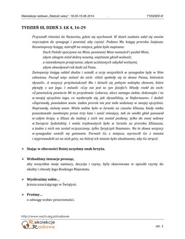Rekolekcje radiowe „Radość wiary”, 18.05-15.06.2014 . TYDZIEŃ III TYDZIEŃ III, DZIEŃ 3. ŁK 4, 16-29 Przyszedł również do Nazaretu, gdzie się wychował. W dzień szabatu udał się swoim zwyczajem do synagogi i powstał, aby czytać. Podano Mu księgę proroka Izajasza. Rozwinąwszy księgę, natrafił na miejsce, gdzie było napisane: Duch Pański spoczywa na Mnie, ponieważ Mnie namaścił i posłał Mnie, abym ubogim niósł dobrą nowinę, więźniom głosił wolność, a niewidomym przejrzenie; abym uciśnionych odsyłał wolnymi, abym obwoływał rok łaski od Pana. Zwinąwszy księgę oddał słudze i usiadł; a oczy wszystkich w synagodze były w Nim utkwione. Począł więc mówić do nich: «Dziś spełniły się te słowa Pisma, któreście słyszeli». A wszyscy przyświadczali Mu i dziwili się pełnym wdzięku słowom, które płynęły z ust Jego. I mówili: «Czy nie jest to syn Józefa?» Wtedy rzekł do nich: «Z pewnością powiecie Mi to przysłowie: Lekarzu, ulecz samego siebie; dokonajże i tu w swojej ojczyźnie tego, co wydarzyło się, jak słyszeliśmy, w Kafarnaum». I dodał: «Zaprawdę, powiadam wam: żaden prorok nie jest mile widziany w swojej ojczyźnie. Naprawdę, mówię wam: Wiele wdów było w Izraelu za czasów Eliasza, kiedy niebo pozostawało zamknięte przez trzy lata i sześć miesięcy, tak że wielki głód panował w całym kraju; a Eliasz do żadnej z nich nie został posłany, tylko do owej wdowy w Sarepcie Sydońskiej. I wielu trędowatych było w Izraelu za proroka Elizeusza, a żaden z nich nie został oczyszczony, tylko Syryjczyk Naaman». Na te słowa wszyscy w synagodze unieśli się gniewem. Porwali Go z miejsca, wyrzucili Go z miasta i wyprowadzili aż na stok góry, na której ich miasto było zbudowane, aby Go strącić. Stając w obecności Bożej uczyńmy znak krzyża. Wzbudźmy intencje prosząc, aby wszystkie moje zamiary, decyzje i czyny, były skierowane w sposób czysty do służby i chwały Jego Boskiego Majestatu. Wyobraźmy sobie… Jezusa nauczającego w Świątyni. Prośmy… o odwagę wobec przeciwności. http://www.wzch.org.pl/radiowe str. 1 Rekolekcje radiowe „Radość wiary”, 18.05-15.06.2014 . TYDZIEŃ III Rozpocznijmy rozważanie przeczytanego Słowa Bożego. Punkt 1. Święto Boga. Jezus, jako Syn Boży, nie musiał uczęszczać do świątyni, by uczcić Boga. Jako pobożny Żyd, wychowany w Nazarecie, gdzie znają go inni, daje jednak przykład, jak oddawać Bogu chwałę. Czyni to nie tylko dlatego, żeby przestrzegać nakazów Prawa. Daje świadectwo, że jest z Nim zjednoczony w miłości. A jak ja oddaję chwałę Bogu w dzień świąteczny? Co zajmuje moje serce i mój wolny czas? Wszystko mi wolno, ale czy wszystko przynosi korzyść i dobro, dla mnie i dla innych? Czy naprawdę jest oddaniem chwały Bogu? Punkt 2. Świadomość posłania i odrzucenie Jezus został posłany, aby głosić prawdę o dobroci Boga, ukazywać ją swoim życiem. Przekazuje to, co słyszy od swojego Ojca, chociaż doświadcza goryczy odrzucenia. Jak boli, gdy prawdę odrzucają bliscy. Jezus nie cofa się przed pogardą człowieka, bo zależy Mu na nim. Wie, że ludzie się pogubili. Bez Jego pomocy, sami nie są w stanie wrócić do Boga, Punkt 3. Wrażliwość na Słowo. Słowo Boga wywołuje w ludziach różne reakcje – radość, pocieszenie, ale również złość, czy niezgodę. Nie zostawia ich obojętnymi. Jest Słowem żywym. Czasem jest to niewygodna prawda, bo trzeba coś w życiu zmienić Wymaga to trudu przyznania przed sobą i Bogiem, że coś jest nie tak. Jezus sam uwrażliwia nas na siebie. Pragnie, by człowiek przejrzał i był szczęśliwy. On jest drogą. Z każdą drogą jest jednak tak, że można ją wskazywać, ale nie można jej przejść za kogoś. Czy wierzę słowom Jezusa i chcę iść drogą, którą On wskazuje? Zakończmy rozważanie… osobistą rozmową z Panem o przebiegu tej medytacji i odmówmy „Ojcze Nasz“. http://www.wzch.org.pl/radiowe str. 2
