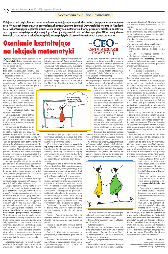 12 „Gazeta Szkolna” ● nr 50 (352) 12 grudnia 2006 roku wyzwania większe i mniejsze Kolejny z serii artykułów na temat oceniania kształtującego w polskich szkołach jest poświęcony matematyce. W kursach internetowych prowadzonych przez Centrum Edukacji Obywatelskiej w ramach Akademii SUS (Szkół Uczących Się) brało udział wielu nauczycieli matematyki, którzy pracują w szkołach podstawowych, gimnazjalnych i ponadgimnazjalnych. Starając się przedstawić państwu specyfikę OK na lekcjach matematyki, skorzystam z relacji nauczycieli, zaczerpniętych z kursów internetowych z poprzednich lat. Ocenianie kształtujące na lekcjach matematyki rzede wszystkim trzeba pamiętać o celach lekcji. Każdy nauczyciel stosujący Pocenianie kształtujące powinien zastanowić się przed lekcją: ■ po co będzie uczył danego tematu, ■ co uczniowie już na ten temat wiedzą, ■ jakie cele stawia sobie nauczyciel i jak je przedstawi uczniom. W nauczaniu matematyki nie jest to łatwe zadanie, a już szczególnie trudne jest przedstawienie celów uczniom tak, aby były one dla nich jasne. Matematyka ma swój własny język, który bywa niezrozumiały dla uczniów. Z jednej strony nauczyciel powinien więc używać języka matematycznego, jednak z drugiej strony, jeśli uczniowie go nie rozumieją i nie wiedzą, o czym mówi nauczyciel, mogą szybko zniechęcić się do nauki tego przedmiotu. Temat: „Obliczanie liczby, gdy dany jest jej procent”. Cel nauczyciela: Uczeń potrafi obliczyć liczbę na podstawie danego jej procentu. Potrafi zapisać treść zadania w postaci równania i rozwiązać je. Cel dla ucznia: Oczekuję, że po tej lekcji każdy z Was będzie potrafił znaleźć liczbę, gdy ktoś poda jej procent. Przyda się to m.in. do obliczenia ceny towaru przed podwyżką o dany procent, do uzupełniania zniszczonej faktury VAT, do obliczenia ilości potrzebnych produktów do właściwego odżywiania się. Będziecie potrafili wykonywać proste obliczenia w pamięci. Chcę, abyście umieli też zapisywać równanie do zadań tekstowych (według przykładów z podręcznika) i je rozwiązywać. [Mirosław Kołodziej, Gimnazjum nr 1 w Zakopanem]. Na tym przykładzie widać wyraźnie, jak istotne w matematyce jest zainteresowanie ucznia tematem lekcji. Nauczyciel matematyki musi szczególnie starać się, by nowa wiedza „zakotwiczała się” w tak zwanym realnym życiu i miała powiązanie z tym, co uczniowie już wiedzą. Istotne jest też, aby uczniowie sami byli świadomi, czego się nauczyli. Pomaga w tym powrót do celów lekcji na koniec zajęć. Drugą tajemnicą, którą warto się podzielić z uczniami, są kryteria oceniania (tzw. nacobezu – czyli „na co będę zwracał uwagę”). Należy precyzyjnie określić, na co będzie się na lekcji i przy ocenianiu zwracać uwagę. Z własnego dzieciństwa szkolnego pamiętam, że na pytanie uczniów: „co będzie na klasówce?”, nauczyciel odpowiadał najczęściej: „wszystko, co wiążę się z tym tematem”. W ocenianiu kształtującym proponujemy nauczycielom precyzowanie wymagań. W matematyce nie jest to wcale proste, bo przecież nie chcemy podawać uczniom treści zadań przed klasówką. Zależy nam, żeby sprawdzić, czy uczniowie rozumieją omawiane zagadnienie i potrafią posługiwać się wiedzą i umiejętnościami z tym związanymi. A jednak z naszych obserwacji wynika, że matematycy stosują „nacobezu” coraz częściej, dzięki czemu uczniowie uzyskują informację, czego się od nich oczekuje. „Nacobezu” zagościło na moich lekcjach na dobre. Każdy cykl zajęć ma określone „nacobezu” – stale do wglądu na folii. Na początku każdych zajęć słownie formułuję lekcyjne „nacobezu”. Przed sprawdzianami uczniowie sami wspólnie określają „nacobezu”, ja tylko podaję zakres materiału. Z wymienionych przez nich sformułowań wybieram 3-4, które jasno określają, na co ja będę zwracać uwagę przy formułowaniu zadań i ocenianiu ich prac, a więc właściwie „na co oni powinni zwrócić uwagę”. [Bożena Wojciechowska, Gimnazjum im. Noblistów Polskich w Nowych Skalmierzycach]. „Nacobezu” jest przy tym umową nauczyciela z uczniem, która musi być przestrzegana przez obie strony, i wtedy daje naprawdę pozytywne efekty. W ocenieniu kształtującym rozdzielamy ocenę sumującą (czyli stopnie) i ocenę kształtującą (np. komentarz w formie informacji zwrotnej). Matematycy najczęściej ustalają, że małe prace, np. kartkówki, będą oceniać kształtująco, a poważniejsze sprawdziany kończące dany temat – sumująco. Zrezygnowałam z kartkówek na oceny. Piszemy kartkówki, które uczniowie sprawdzają sobie nawzajem lub porównują swoje rozwiązania z podanymi na tablicy. [Małgorzata Bonikowska, Szkoła Podstawowa nr 1 w Zespole Szkół nr 1 w Mrągowie]. Czasem poważnym problemem okazuje się pokonanie ugruntowanego przyzwyczajenia – zarówno uczniów, jak i rodziców – do stopni. Rodzice czują się trochę zaniepokojeni ograniczoną liczbą stopni, a uczniowie – szczególnie na początku – traktują to jako okazję do mniejszego wysiłku wkładanego w naukę. Jedni i drudzy muszą się dopiero przekonać, że informacja zwrotna naprawdę daje uczniowi więcej wskazówek i pomaga mu się uczyć. Opinie rodziców uczniów Anny Konefał ze Szkoły Podstawowej w Kamieniu Prusinie na początku wcale nie były jednoznaczne. Rodzic 1: Pomysł jest świetny. Dzięki informacji zwrotnej będę wiedział, co moje dziecko robi dobrze, a co musi jeszcze poprawić. Rodzic 2: Tak jak pani oceniała dotychczas było dobrze i myślę, że powinno tak zostać. Rodzic 3: Moje dziecko motywuje do pracy ocena, a komentarz to tylko komentarz. Natomiast nauczyciele decydujący się na systemowe ograniczenie liczby stopni szybko dostrzegają korzyści płynące z tego sposobu oceniania. Do tej pory miałam w dzienniku po kilkanaście ocen. Teraz są 
