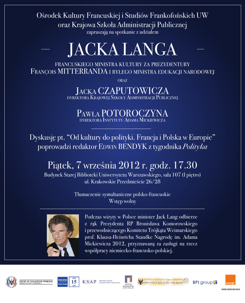 Ośrodek Kultury Francuskiej i Studiów Frankofońskich UW oraz Krajowa Szkoła Administracji Publicznej zapraszają na spotkanie z udziałem JACKA LANGA francuskiego ministra kultury za prezydentury François MITTERRANDA i byłego ministra edukacji narodowej oraz Jacka CZAPUTOWICZA dyrektora Krajowej Szkoły Administracji Publicznej Pawła POTOROCZYNA dyrektora Instytutu Adama Mickiewicza Dyskusję pt. “Od kultury do polityki. Francja i Polska w Europie” poprowadzi redaktor Edwin BENDYK z tygodnika Polityka Piątek, 7 września 2012 r. godz. 17.30 Budynek Starej Biblioteki Uniwersytetu Warszawskiego, sala 107 (I piętro) ul. Krakowskie Przedmieście 26/28 Tłumaczenie symultaniczne polsko-francuskie Wstęp wolny Podczas wizyty w Polsce minister Jack Lang odbierze z rąk Prezydenta RP Bronisława Komorowskiego i przewodniczącego Komitetu Trójkąta Weimarskiego prof. Klausa-Heinricha Standke Nagrodę im. Adama Mickiewicza 2012, przyznawaną za zasługi na rzecz współpracy niemiecko-francusko-polskiej.