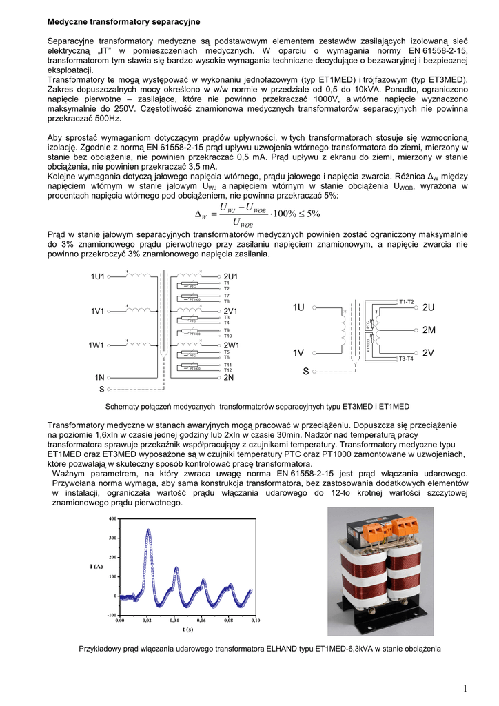 Medyczne transformatory separacyjne Separacyjne transformatory medyczne są podstawowym elementem zestawów zasilających izolowaną sieć elektryczną „IT” w pomieszczeniach medycznych. W oparciu o wymagania normy EN 61558-2-15, transformatorom tym stawia się bardzo wysokie wymagania techniczne decydujące o bezawaryjnej i bezpiecznej eksploatacji. Transformatory te mogą występować w wykonaniu jednofazowym (typ ET1MED) i trójfazowym (typ ET3MED). Zakres dopuszczalnych mocy określono w w/w normie w przedziale od 0,5 do 10kVA. Ponadto, ograniczono napięcie pierwotne – zasilające, które nie powinno przekraczać 1000V, a wtórne napięcie wyznaczono maksymalnie do 250V. Częstotliwość znamionowa medycznych transformatorów separacyjnych nie powinna przekraczać 500Hz. Aby sprostać wymaganiom dotyczącym prądów upływności, w tych transformatorach stosuje się wzmocnioną izolację. Zgodnie z normą EN 61558-2-15 prąd upływu uzwojenia wtórnego transformatora do ziemi, mierzony w stanie bez obciążenia, nie powinien przekraczać 0,5 mA. Prąd upływu z ekranu do ziemi, mierzony w stanie obciążenia, nie powinien przekraczać 3,5 mA. Kolejne wymagania dotyczą jałowego napięcia wtórnego, prądu jałowego i napięcia zwarcia. Różnica ΔW między napięciem wtórnym w stanie jałowym UWJ a napięciem wtórnym w stanie obciążenia UWOB, wyrażona w procentach napięcia wtórnego pod obciążeniem, nie powinna przekraczać 5%: DW = U WJ - U WOB × 100% £ 5% U WOB Prąd w stanie jałowym separacyjnych transformatorów medycznych powinien zostać ograniczony maksymalnie do 3% znamionowego prądu pierwotnego przy zasilaniu napięciem znamionowym, a napięcie zwarcia nie powinno przekroczyć 3% znamionowego napięcia zasilania. 2U1 PTC T1 T2 PT1000 T7 T8 PTC T3 T4 PT1000 T9 T10 1W1 2W1 PTC T5 T6 PT1000 T11 T12 1N T1-T2 1U 2V1 PTC 1V1 1V 2U 2M PT1000 1U1 T3-T4 2V S 2N S Schematy połączeń medycznych transformatorów separacyjnych typu ET3MED i ET1MED Transformatory medyczne w stanach awaryjnych mogą pracować w przeciążeniu. Dopuszcza się przeciążenie na poziomie 1,6xIn w czasie jednej godziny lub 2xIn w czasie 30min. Nadzór nad temperaturą pracy transformatora sprawuje przekaźnik współpracujący z czujnikami temperatury. Transformatory medyczne typu ET1MED oraz ET3MED wyposażone są w czujniki temperatury PTC oraz PT1000 zamontowane w uzwojeniach, które pozwalają w skuteczny sposób kontrolować pracę transformatora. Ważnym parametrem, na który zwraca uwagę norma EN 61558-2-15 jest prąd włączania udarowego. Przywołana norma wymaga, aby sama konstrukcja transformatora, bez zastosowania dodatkowych elementów w instalacji, ograniczała wartość prądu włączania udarowego do 12-to krotnej wartości szczytowej znamionowego prądu pierwotnego. 400 300 200 I (A) 100 0 -100 0,00 0,02 0,04 0,06 0,08 0,10 t (s) Przykładowy prąd włączania udarowego transformatora ELHAND typu ET1MED-6,3kVA w stanie obciążenia 1