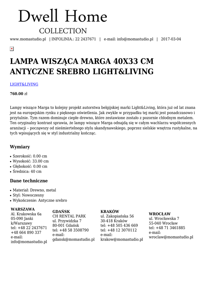www.momastudio.pl | INFOLINIA.: 22 2437671 | e-mail: [email protected] | 2017-03-04 LAMPA WISZĄCA MARGA 40X33 CM ANTYCZNE SREBRO LIGHT&LIVING LIGHT&LIVING 760.00 zł Lampy wiszące Marga to kolejny projekt autorstwa belgijskiej marki Light&Living, która już od lat znana jest na europejskim rynku z pięknego oświetlenia. Jak zwykle w przypadku tej marki jest ponadczasowo i przytulnie. Tym razem dominuje ciepłe drewno, które zestawione zostało z pozornie chłodnym metalem. Ten oryginalny kontrast sprawia, że lampy wiszące Marga odnajdą się w całym wachlarzu współczesnych aranżacji – począwszy od nieśmiertelnego stylu skandynawskiego, poprzez sielskie wnętrza rustykalne, na tych wpisujących się w styl industrialny kończąc. Wymiary ● ● ● ● Szerokość: 0.00 cm Wysokość: 33.00 cm Głębokość: 0.00 cm Średnica: 40 cm Dane techniczne ● ● ● Materiał: Drewno, metal Styl: Nowoczesny Wykończenie: Antyczne srebro WARSZAWA Al. Krakowska 6a 05-090 Janki k/Warszawy tel: +48 22 2437671 +48 664 890 337 e-mail: [email protected] GDAŃSK CH RENTAL PARK ul. Przywidzka 7 80-001 Gdańsk tel: +48 58 3508790 e-mail: [email protected] KRAKÓW ul. Zakopiańska 56 30-418 Kraków tel: +48 505 436 669 tel: +48 12 3070112 e-mail: [email protected] WROCŁAW ul. Wrocławska 7 55-040 Wrocław tel: +48 71 3461885 e-mail: [email protected]