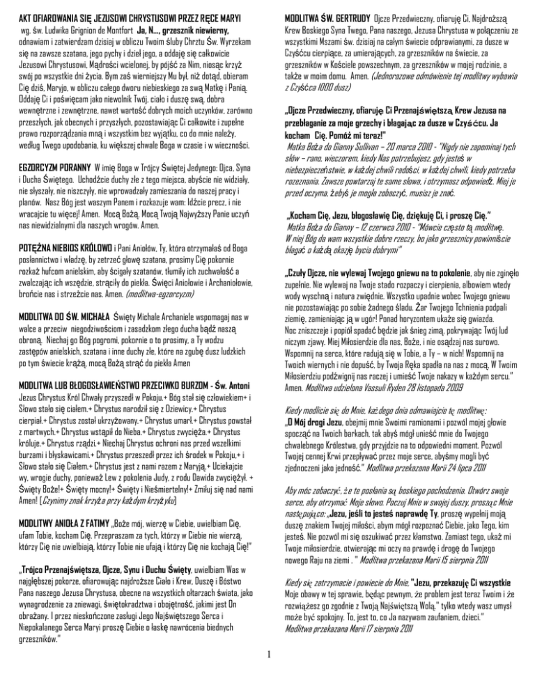AKT OFIAROWANIA SIĘ JEZUSOWI CHRYSTUSOWI PRZEZ RĘCE MARYI wg. św. Ludwika Grignion de Montfort Ja, N..., grzesznik niewierny, odnawiam i zatwierdzam dzisiaj w obliczu Twoim śluby Chrztu Św. Wyrzekam się na zawsze szatana, jego pychy i dzieł jego, a oddaję się całkowicie Jezusowi Chrystusowi, Mądrości wcielonej, by pójść za Nim, niosąc krzyż swój po wszystkie dni życia. Bym zaś wierniejszy Mu był, niż dotąd, obieram Cię dziś, Maryjo, w obliczu całego dworu niebieskiego za swą Matkę i Panią. Oddaję Ci i poświęcam jako niewolnik Twój, ciało i duszę swą, dobra wewnętrzne i zewnętrzne, nawet wartość dobrych moich uczynków, zarówno przeszłych, jak obecnych i przyszłych, pozostawiając Ci całkowite i zupełne prawo rozporządzania mną i wszystkim bez wyjątku, co do mnie należy, według Twego upodobania, ku większej chwale Boga w czasie i w wieczności. MODLITWA ŚW. GERTRUDY Ojcze Przedwieczny, ofiaruję Ci, Najdroższą Krew Boskiego Syna Twego, Pana naszego, Jezusa Chrystusa w połączeniu ze wszystkimi Mszami św. dzisiaj na całym świecie odprawianymi, za dusze w Czyśćcu cierpiące, za umierających, za grzeszników na świecie, za grzeszników w Kościele powszechnym, za grzeszników w mojej rodzinie, a także w moim domu. Amen. (Jednorazowe odmówienie tej modlitwy wybawia z Czyśćca 1000 dusz) „Ojcze Przedwieczny, ofiaruję Ci Przenajświętszą Krew Jezusa na przebłaganie za moje grzechy i błagając za dusze w Czyśćcu. Ja kocham Cię. Pomóż mi teraz!" Matka Boża do Gianny Sullivan – 20 marca 2010 - "Nigdy nie zapominaj tych słów – rano, wieczorem, kiedy Nas potrzebujesz, gdy jesteś w niebezpieczeństwie, w każdej chwili radości, w każdej chwili, kiedy potrzeba rozeznania. Zawsze powtarzaj te same słowa, i otrzymasz odpowiedź. Miej je przed oczyma, żebyś je mogła zobaczyć, musisz je znać. EGZORCYZM PORANNY W imię Boga w Trójcy Świętej Jedynego: Ojca, Syna i Ducha Świętego. Uchodźcie duchy złe z tego miejsca, abyście nie widziały, nie słyszały, nie niszczyły, nie wprowadzały zamieszania do naszej pracy i planów. Nasz Bóg jest waszym Panem i rozkazuje wam: Idźcie precz, i nie wracajcie tu więcej! Amen. Mocą Bożą, Mocą Twoją Najwyższy Panie uczyń nas niewidzialnymi dla naszych wrogów. Amen. „Kocham Cię, Jezu, błogosławię Cię, dziękuję Ci, i proszę Cię.” Matka Boża do Gianny – 12 czerwca 2010 - “Mówcie często tą modlitwę. W niej Bóg da wam wszystkie dobre rzeczy, bo jako grzesznicy powinniście błagać o każdą okazję bycia dobrymi" POTĘŻNA NIEBIOS KRÓLOWO i Pani Aniołów, Ty, która otrzymałaś od Boga posłannictwo i władzę, by zetrzeć głowę szatana, prosimy Cię pokornie rozkaż hufcom anielskim, aby ścigały szatanów, tłumiły ich zuchwałość a zwalczając ich wszędzie, strąciły do piekła. Święci Aniołowie i Archaniołowie, brońcie nas i strzeżcie nas. Amen. (modlitwa-egzorcyzm) „Czuły Ojcze, nie wylewaj Twojego gniewu na to pokolenie, aby nie zginęło zupełnie. Nie wylewaj na Twoje stado rozpaczy i cierpienia, albowiem wtedy wody wyschną i natura zwiędnie. Wszystko upadnie wobec Twojego gniewu nie pozostawiając po sobie żadnego śladu. Żar Twojego Tchnienia podpali ziemię, zamieniając ją w ugór! Ponad horyzontem ukaże się gwiazda. Noc zniszczeje i popiół spadać będzie jak śnieg zimą, pokrywając Twój lud niczym zjawy. Miej Miłosierdzie dla nas, Boże, i nie osądzaj nas surowo. Wspomnij na serca, które radują się w Tobie, a Ty – w nich! Wspomnij na Twoich wiernych i nie dopuść, by Twoja Ręka spadła na nas z mocą, W Twoim Miłosierdziu podźwignij nas raczej i umieść Twoje nakazy w każdym sercu.” Amen. Modlitwa udzielona Vassuli Ryden 28 listopada 2009 MODLITWA DO ŚW. MICHAŁA Święty Michale Archaniele wspomagaj nas w walce a przeciw niegodziwościom i zasadzkom złego ducha bądź naszą obroną. Niechaj go Bóg pogromi, pokornie o to prosimy, a Ty wodzu zastępów anielskich, szatana i inne duchy złe, które na zgubę dusz ludzkich po tym świecie krążą, mocą Bożą strąć do piekła Amen MODLITWA LUB BŁOGOSŁAWIEŃSTWO PRZECIWKO BURZOM - Św. Antoni Jezus Chrystus Król Chwały przyszedł w Pokoju.+ Bóg stał się człowiekiem+ i Słowo stało się ciałem.+ Chrystus narodził się z Dziewicy.+ Chrystus cierpiał.+ Chrystus został ukrzyżowany.+ Chrystus umarł.+ Chrystus powstał z martwych.+ Chrystus wstąpił do Nieba.+ Chrystus zwycięża.+ Chrystus króluje.+ Chrystus rządzi.+ Niechaj Chrystus ochroni nas przed wszelkimi burzami i błyskawicami.+ Chrystus przeszedł przez ich środek w Pokoju,+ i Słowo stało się Ciałem.+ Chrystus jest z nami razem z Maryją.+ Uciekajcie wy, wrogie duchy, ponieważ Lew z pokolenia Judy, z rodu Dawida zwyciężył. + Święty Boże!+ Święty mocny!+ Święty i Nieśmiertelny!+ Zmiłuj się nad nami Amen! [Czynimy znak krzyża przy każdym krzyżyku] Kiedy modlicie się do Mnie, każdego dnia odmawiajcie tę modlitwę: „O Mój drogi Jezu, obejmij mnie Swoimi ramionami i pozwól mojej głowie spocząć na Twoich barkach, tak abyś mógł unieść mnie do Twojego chwalebnego Królestwa, gdy przyjdzie na to odpowiedni moment. Pozwól Twojej cennej Krwi przepływać przez moje serce, abyśmy mogli być zjednoczeni jako jedność.” Modlitwa przekazana Marii 24 lipca 2011 Aby móc zobaczyć, że te posłania są boskiego pochodzenia. Otwórz swoje serce, aby otrzymać Moje słowo. Poczuj Mnie w swojej duszy, prosząc Mnie następująco: „Jezu, jeśli to jesteś naprawdę Ty, proszę wypełnij moją MODLITWY ANIOŁA Z FATIMY „Boże mój, wierzę w Ciebie, uwielbiam Cię, ufam Tobie, kocham Cię. Przepraszam za tych, którzy w Ciebie nie wierzą, którzy Cię nie uwielbiają, którzy Tobie nie ufają i którzy Cię nie kochają Cię!” duszę znakiem Twojej miłości, abym mógł rozpoznać Ciebie, jako Tego, kim jesteś. Nie pozwól mi si