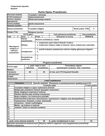 Politechnika Opolska Wydział Karta Opisu Przedmiotu Kierunek studiów Profil kształcenia Poziom studiów Specjalność Forma studiów Semestr studiów Studia stacjonarne II Nazwa przedmiotu Turystyka religijna Subject Title Całk. 3 Wymagania wstępne w zakresie przedmiotu Turystyka i rekreacja Ogólnoakademicki Studia pierwszego stopnia Nauki podst. (T/N) T Religious tourism ECTS (pkt.) Tryb zaliczenia przedmiotu Kod przedmiotu Zaliczenie na ocenę TR0040-B Kont. 1 Prakt. Nazwy Historia architektury i sztuki przedmiotów 1. znajomość epok historii filozofii i kultury Wiedza 2. znajomość miejsca religii w kulturze i życiu codziennym człowieka … 1. potrafi wskazać podstawowe różnice między głównymi religiami Umiejętności 2. … 1. Kompetencje 2. społeczne … Program przedmiotu Forma zajęć Wykład Ćwiczenia Laboratorium Projekt Seminarium L. godz. zajęć w sem. Prowadzący zajęcia Całkowita Kontaktowa (tytuł/stopień naukowy, imię i nazwisko) | 60 30 dr hab. prof. PO Krzysztof Kowalik | | | | Treści kształcenia Ćwiczenia Lp. 1. 2. 3. 4. 5. 6. 7. 8. 9. 10. 11. 12. 13. 14. 15. Sposób realizacji Ćwiczenia w pomieszczeniach dydaktycznych PO Tematyka zajęć Liczba godzin Turystyka religijna w ujęciu wybranych autorów 3 Religia jako przedmiot różnych dyscyplin naukowych 3 Ślady religijnych inspiracji w kulturze 3 Obiekty sakralne jako atrakcja turystyczna 2 Wojny religijne i ich historyczne pamiątki 2 Determiananty kulturowe, ekonomiczne, wyznaniowe i religijne oraz demograficzne 4 Częstochowa, Grabarka, Licheń, Gietrzwałd 4 Jerozolima - miasto multireligijne 3 Mekka - jej miejsce w kulturze 3 Judaizm i islam na ziemiach polskich 3 L. godz. pracy własnej studenta 30 L. godz. kontaktowych w sem. Sposoby sprawdzenia zamierzonych Aktywny udział w zajęciach oraz przygotowanie prezentacji efektów kształcenia Laboratorium Sposób realizacji 30 K_W06 Ma wiedzę na temat poszczególnych rodzajów i form turystyki i rekreacji oraz rozumie ich rolę i znaczenie w życiu 1. człowieka na przestrzeni dziejów K_W09Zna rozmieszczenie i specyfikę walorów turystycznych 2. regionów Polski i świata. Wiedza K_W12 Ma wiedzę na temat kulturowo-regionalnego zróżnicowania Unii Europejskiej (jego historyczno3. cywilizacyjnych i środowiskowych uwarunkowań) w tym wiedzę na temat obrzędów, zwyczajów i tradycji. K_W13 Zna periodyzację dziejów, pojęcia i słownictwo związane z architekturą oraz rozpoznaje główne style 4. architektoniczne i kierunki w rozwoju sztuki, dzieła wybitnych twórców. Efekty kształcenia dla przedmiotu - po zakończonym cyklu kształcenia K_U05 Potrafi przeprowadzić analizę atrakcyjności 1. turystycznej danego obszaru oraz ocenić przydatność tworzących ją elementów dla potrzeb turystyki i rekreacji. Umiejętności Kompetencje społeczne 2. 3. … 1. 2. 3. … Metody dydaktyczne: Ć: przentacje multimedialne, dyskusja dydaktyczna Forma i warunki zaliczenia przedmiotu: Kolokwium pisemne Literatura podstawowa: [1] Kroplewski Z., Panasiuk A. (red.): Turystyka religijna, Szczecin 2010 [2] Glaeser Z., Górecki J. (red.): Pielgrzymowanie a integracja, Opole 2005 [3] A. Jackowski, Pielgrzymki i turystyka religijna w Polsce, Warszawa 1991 [4] A. Jackowski, I. Sołtan (red.), Leksykon. Szlaki pielgrzymkowe Europy, Znak, Kraków 2000. [5] [6] [7] [8] Literatura uzupełniająca: [1] Robinson M.: Miejsca święte i szlaki pątnicze, antologia pielgrzymowania, Poznań 2002 [2] A. Jackowski (red.), Miejsca święte Rzeczypospolitej. Leksykon, Znak, Kraków 1998 [3] [4] [5] [6] [7] ______________ * niewłaściwe przekreślić ………………………………………………….. ………………………………………………………. (kierownik jednostki organizacyjnej/bezpośredni przełożony: pieczęć/podpis (Dziekan Wydziału pieczęć/podpis)
