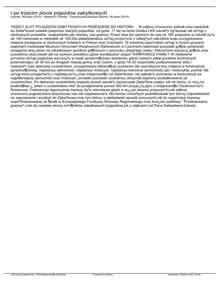 I po trzecim zlocie pojazdów zabytkowych (wtorek, 06 lipiec 2010) - Nades³a³ Chrisek - Ostatnia aktualizacja (wtorek, 06 lipiec 2010) TRZECI ZLOT POJAZDÓW ZABYTKOWYCH PRZESZED£ DO HISTORII W piêkn± s³oneczn± sobotê oraz niedzielê do Zabe³kowa zawitali pasjonaci starych pojazdów, od godz. 11 tej na teren boiska LKS zaczê³y zg³aszaæ siê za³ogi z okolicznych powiatów ,województw jak równie¿ zza granicy. Przez dwa dni zjecha³o do nas ok 180 pojazdów w sobotê by³o ok 140 natomiast w niedzielê ok 150.Dla piêædziesiêciu za³óg przyby³ych z odleg³ych zak±tków kraju przygotowano miejsca noclegowe w okolicznych hotelach w Polsce oraz Czechach. W sobotnie popo³udnie za³ogi w trzech grupach pojecha³y zwiedzaæ Muzeum Umocnieñ Wojskowych Darkowiczki w Czechach,natomiast pozostali go¶cie podziwiali zmagania stra¿aków na zabytkowym sprzêcie ga¶niczym z pocz±tku ubieg³ego wieku. Wieczorem wszyscy go¶cie oraz uczestnicy zlotu bawili siê na wolnym powietrzu gdzie wystêpowa³ zespó³ KARPOWICZ FAMILY.W niedzielne po³udnie za³ogi pojazdów wyruszy³y w trasê sprawno¶ciowo widokow± gdzie czeka³o piêæ punktów kontrolnych przemierzaj±c ok 30 km po drogach naszej gminy oraz Czech, o godz.16.30 rozpoczêto podsumowanie zlotu i nadszed³ czas dekoracji uczestników, przygotowany kilkana¶cie pucharów dla zwyciêzców:trzy miejsca w konkurencji sprawno¶ciowej, najstarszy samochód, najstarszy motocykl, najstarszy kierowca samochodu jak i motocykla, puchar dla za³ogi która przyjecha³a z najdalej po³o¿onej miejscowo¶ci od Zabe³kowa, nie zabrak³o pucharów w konkurencji na najpiêkniejszy samochód oraz motocykl, ponadto pozostali uczestnicy otrzymali dyplomy podziêkowania za uczestnictwo. Po dekoracji uczestników pojazdy powoli zaczê³y opuszczaæ Zabe³ków udaj±c siê do domu, tu mo¿na podkre¶liæ i¿ jeden z uczestników mia³ do przejechania ponad 300 km przyje¿d¿aj±c z miejscowo¶ci Osobnica ko³o Rzeszowa. Frekwencja tegorocznej imprezy by³a rekordowa gdzie w du¿ym stopniu przyczyni³a siê piêkna s³oneczna pogoda która dotychczas nas nie rozpieszcza³a. Na koniec chcia³bym podziêkowaæ tym którzy odpowiedzieli na zaproszenie i przybyli do Zabe³kowa oraz tym którzy w jakikolwiek sposób przyczynili siê do organizacji imprezy wspó³finansowanej ze ¶rodk w Europejskiego Funduszu Rozwoju Regionalnego oraz bud¿etu pañstwa " Przekraczamy granice".Link do czeskiej strony mi³o¶ników zabytkowych pojazdówLink z zdjêciami od Pana Sebastiana £obody http://www.zabelkow.pl - Portal Miejscowo¶ci Zabe³ków Powered by Mambo Generated: 4 March, 2017, 07:58