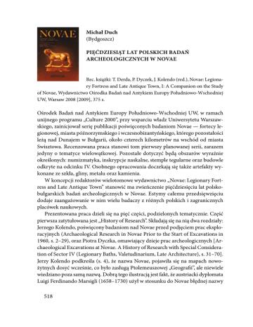 Studia Europaea Gnesnensia 6/2012 · recenzje Michał Duch (Bydgoszcz) Pięćdziesiąt lat polskich badań archeologicznych w Novae Rec. książki: T. Derda, P. Dyczek, J. Kolendo (red.), Novae: Legionary Fortress and Late Antique Town, I: A Companion on the Study of Novae, Wydawnictwo Ośrodka Badań nad Antykiem Europy Południowo-Wschodniej UW, Warsaw 2008 [2009], 375 s. Ośrodek Badań nad Antykiem Europy Południowo-Wschodniej UW, w ramach unijnego programu „Culture 2000”, przy wsparciu władz Uniwersytetu Warszawskiego, zainicjował serię publikacji poświęconych badaniom Novae — fortecy legionowej, miasta późnorzymskiego i wczesnobizantyńskiego, którego pozostałości leżą nad Dunajem w Bułgarii, około czterech kilometrów na wschód od miasta Swisztowa. Recenzowana praca stanowi tom pierwszy planowanej serii, zarazem jedyny o tematyce wielowątkowej. Pozostałe dotyczyć będą obszarów wyraźnie określonych: numizmatyka, inskrypcje naskalne, stemple tegularne oraz budowle odkryte na odcinku IV. Osobnego opracowania doczekają się także artefakty wykonane ze szkła, gliny, metalu oraz kamienia. W koncepcji redaktorów wielotomowe wydawnictwo „Novae: Legionary Fort ress and Late Antique Town” stanowić ma zwieńczenie pięćdziesięciu lat polskobułgarskich badań archeologicznych w Novae. Estymy całemu przedsięwzięciu dodaje zaangażowanie w nim wielu badaczy z różnych polskich i zagranicznych placówek naukowych. Prezentowana praca dzieli się na pięć części, podzielonych tematycznie. Część pierwsza zatytułowana jest „History of Research”. Składają się na nią dwa rozdziały: Jerzego Kolendo, poświęcony badaniom nad Novae przed podjęciem prac eksploracyjnych (Archaeological Research in Novae Prior to the Start of Excavations in 1960, s. 2–29), oraz Piotra Dyczka, omawiający dzieje prac archeologicznych [Archaeological Excavations at Novae. A History of Research with Special Consideration of Sector IV (Legionary Baths, Valetudinarium, Late Architecture), s. 31–70]. Jerzy Kolendo podkreśla (s. 4), że nazwa Novae, pojawiła się na mapach nowożytnych dosyć wcześnie, co było zasługą Ptolemeuszowej „Geografii”, ale niewiele wiedziano poza samą nazwą. Dobrą tego ilustracją jest fakt, że austriacki dyplomata Luigi Ferdinando Marsigli (1658–1730) użył w stosunku do Novae błędnej nazwy 518 Michał Duch, Pięćdziesiąt lat polskich badań Merlan (s. 4–8). Dopiero w XIX wieku uwagę podróżników i badaczy przykuły inskrypcje umieszczone na kamieniach, których w Swisztowie użyto jako budulec. Jerzy Kolendo „podąża ich śladem”, analizuje relacje z podroży, bada pierwsze publikacje inskrypcji, śledzi losy napisów. Czytelnik dostrzeże rosnące z każdą dekadą zainteresowanie Novae, którego kulminacją stało się podjęcie w 1960 roku pierwszych regularnych wykopalisk archeologicznych. Piotr Dyczek podzielił swoje rozważania na dwie części. Pierwsza poświęcona została pomysłodawcom i inicjatorom wykopalisk, którymi byli: Dimităr Dimitrov, Kazimierz Majewski oraz Witold Hensel. Druga natomiast omawia sposób podzielenia terenu wykopalisk pomiędzy polskich a bułgarskich archeologów, przebieg prac poszczególnych ekspedycji oraz ich czołowe postacie. Piotr Dyczek opisuje kolejne ekspedycje i ich odkrycia, co nie było zadaniem łatwym. Warto bowiem podkreślić, że na terenie Novae od dłuższego czasu pracuje kilka ekspedycji: trzy polskie — dwie Uniwersytetu Warszawskiego (z Instytutu Archeologii pod kierownictwem Tadeusza Sarnowskiego oraz z Ośrodka Badań nad Antykiem Europy Południowo-Wschodniej UW pod kierunkiem Piotra Dyczka) oraz jedna z Uniwersytetu im. Adama Mickiewicza w Poznaniu (pod kierunkiem Andrzeja Biernackiego). Krótki epizod w wykopaliskach archeologicznych w Novae ma też na koncie Uniwersytet Wrocławski. Od początku działa też ekspedycja Bułgarskiej Akademii Nauk, którą obecnie kieruje Evgenija Genčeva. Szczególne miejsce w rozważaniach autora zajmuje historia badań na odcinku IV, ponieważ od ponad dwudziestu lat kieruje prowadzonymi tam pracami eksploracyjnymi. Druga część książki, której redaktorem jest Jerzy Kolendo we współpracy z Tomaszem Derdą i Tomaszem Płóciennikiem, zbiera wszystkie informacje źródłowe na temat Novae, w tym kartograficzne. Pochodzą one z czasów późnorzymskich i bizantyńskich (s. 74). Czytelnik znajdzie tu skrócone biogramy autorów antycznych, informacje o edycjach i przekładach, wraz z literaturą przedmiotu. Każdorazowo stosowny fragment tekstu przytaczany jest in extenso, zarówno w oryginale, jak i w tłumaczeniu (na język angielski). O kolejności umieszczenia w książce zadecydowała chronologia wydarzeń w Novae, a nie czas powstania źródła1. Ta Z tego powodu najpierw przytoczono fragment z dzieła Jordanesa Getica, opracowany przez Jerzego Kolendo. Kolejne opracował Jan Prostko Prostyński: 2. Priscus Panites, Historiae; 3. Eugippius, Vita sancti Severini; 4. Anonymus Valesianus, Pars Theodoriciana = Excerpta Valesiana pars posterior; 5. Marcellinus Comes, Chronicon, natomiast 6. Ioannes Antiochenus, Historia chronica przygotował razem z Maciejem Solomonem — twórcą kolejnych haseł: 7. Theophylactus Simocatta, Historiae; 8. Ioannes Malalas, Chronographia; 9. Theophanes Confessor, Chronographia; 10. Anastasius Bibliothecarius, Chronographia tripartita. Po dziełach, które 1 519 Studia Europaea Gnesnensia 6/2012 · recenzje specyficzna antologia źródeł, stanowiąca oddzielną część publikacji, współgra z następującymi po niej artykułami dotyczącymi zagadnień historycznych. Kolejna część poświęcona jest w całości historii Novae (Historical Studies) i stanowi trzon publikacji. Składa się na nią dziesięć rozdziałów, o łącznej objętości 120 stron. Historyczne rozważania otwiera tekst Jerzego Kolendo pt. „Novae During the Goth Raid of AD 250/1 (Iordanes, 