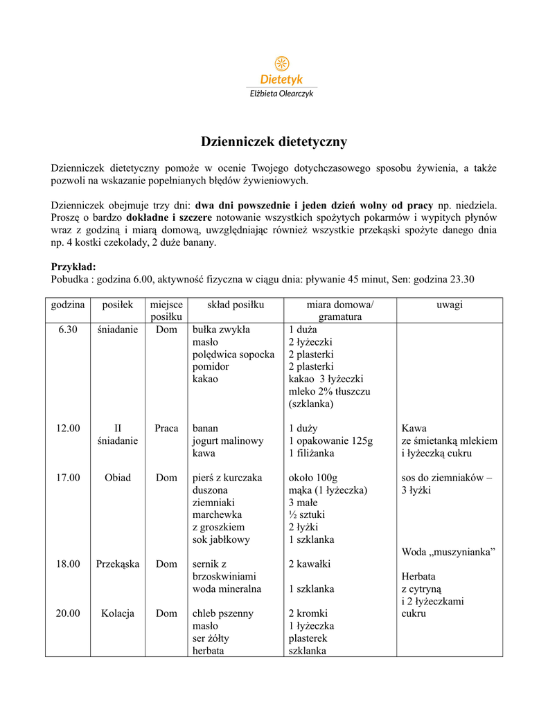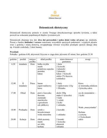 Dzienniczek dietetyczny Dzienniczek dietetyczny pomoże w ocenie Twojego dotychczasowego sposobu żywienia, a także pozwoli na wskazanie popełnianych błędów żywieniowych. Dzienniczek obejmuje trzy dni: dwa dni powszednie i jeden dzień wolny od pracy np. niedziela. Proszę o bardzo dokładne i szczere notowanie wszystkich spożytych pokarmów i wypitych płynów wraz z godziną i miarą domową, uwzględniając również wszystkie przekąski spożyte danego dnia np. 4 kostki czekolady, 2 duże banany. Przykład: Pobudka : godzina 6.00, aktywność fizyczna w ciągu dnia: pływanie 45 minut, Sen: godzina 23.30 godzina posiłek miejsce skład posiłku posiłku Dom bułka zwykła masło polędwica sopocka pomidor kakao miara domowa/ gramatura 1 duża 2 łyżeczki 2 plasterki 2 plasterki kakao 3 łyżeczki mleko 2% tłuszczu (szklanka) uwagi 6.30 śniadanie 12.00 II śniadanie Praca banan jogurt malinowy kawa 1 duży 1 opakowanie 125g 1 filiżanka Kawa ze śmietanką mlekiem i łyżeczką cukru 17.00 Obiad Dom pierś z kurczaka duszona ziemniaki marchewka z groszkiem sok jabłkowy około 100g mąka (1 łyżeczka) 3 małe ½ sztuki 2 łyżki 1 szklanka sos do ziemniaków – 3 łyżki 18.00 Przekąska Dom sernik z brzoskwiniami woda mineralna 2 kawałki chleb pszenny masło ser żółty herbata 2 kromki 1 łyżeczka plasterek szklanka Woda „muszynianka” 20.00 Kolacja Dom 1 szklanka Herbata z cytryną i 2 łyżeczkami cukru Dzień tygodnia…………………. Data………….. Pobudka:……….. Sen…………………. Aktywność fizyczna w ciągu dnia ……………………………………….. godzina posiłek miejsce posiłku skład posiłku miara domowa/gramatura uwagi Dzień tygodnia…………………. Data………….. Pobudka:……….. Sen…………………. Aktywność fizyczna w ciągu dnia ……………………………………….. godzina posiłek miejsce skład posiłku posiłku miara domowa/gramatura uwagi Dzień tygodnia…………………. Data………….. Pobudka:……….. Sen…………………. Aktywność fizyczna w ciągu dnia ……………………………………….. godzina posiłek miejsce skład posiłku posiłku miara domowa/gramatura uwagi