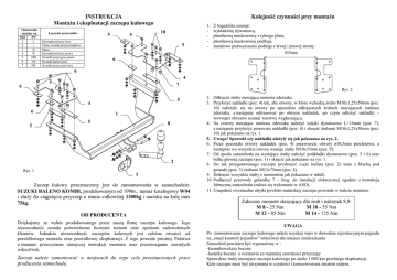 INSTRUKCJA MontaŜu i eksploatacji zaczepu kulowego Oznaczenie zacisku wg ISO PN 1 L 2 + 3 31 4 R 5 58R 6 54 7 58L Łączenie przewodów 6 Kierunkowskazy lewe Tylne światła przeciwmgłowe Masa Kierunkowskazy prawe Światła pozycyjne prawe Światła hamowania Światła pozycyjne lewe Kolejność czynności przy montaŜu 10 9 5 1. - Z bagaŜnika usunąć: wykładzinę dywanową, plastikową maskownicę z tylnego płata, plastikową maskownicę podłogi, metalowe podwyŜszenie podłogi z lewej i prawej strony. 855mm 6 9 4 7 6 Rys. 2 5 4 6 5 1 5 8 2 Rys. 1 3 Zaczep kulowy przeznaczony jest do zamontowania w samochodzie: SUZUKI BALENO KOMBI, produkowanym od 1996r., numer katalogowy W04 i słuŜy do ciągnięcia przyczep o masie całkowitej 1300kg i nacisku na kulę max 75kg. OD PRODUCENTA Dziękujemy za wybór produkowanego przez naszą firmę zaczepu kulowego. Jego niezawodność została potwierdzona licznymi testami oraz opiniami zadowolonych klientów. JednakŜe niezawodność zaczepów kulowych jest zaleŜna równieŜ od prawidłowego montaŜu oraz prawidłowej eksploatacji. Z tego powodu prosimy Państwa o staranne przeczytanie niniejszej instrukcji montaŜu oraz przestrzeganie zawartych wskazówek. Zaczep naleŜy zamontować w miejscach do tego celu przeznaczonych przez producenta samochodu. 2. Odkręcić śruby mocujące ramiona zderzaka. 3. PrzyłoŜyć nakładki (poz. 4) tak, aby otwory, w które wchodzą śruby M10x1,25x50mm (poz. 10) nałoŜyły się na otwory po uprzednio odkręconych śrubach mocujących ramiona zderzaka, a następnie odtrasować po obrysie nakładek, po czym odłoŜyć nakładki – wewnątrz obrysów usunąć warstwę wygłuszającą. 4. Na otwory mocujące ramiona zderzaka nałoŜyć tulejki dystansowe L=16mm (poz. 7), a następnie przyłoŜyć ponownie nakładki (poz. 4) i skręcić śrubami M10x1,25x50mm (poz. 10) jak pokazano na rys. 1. 5. Uwaga! Sprawdź czy nakładki ułoŜyły się jak pokazano na rys. 2. 6. Przez pozostałe otwory nakładek (poz. 4) przewiercić otwory ø10,5mm przelotowo, a następnie we wszystkie otwory wsunąć śruby M10x35mm (poz. 9). 7. Od spodu samochodu na wystające śruby nałoŜyć podkładki dystansowe (poz. 5 i 6) oraz belkę główną zaczepu (poz. 1) i skręcić jak pokazano na rys. 1. 8. Do tak przygotowanego zaczepu przykręcić część kulistą (poz. 2) wraz z blachą pod gniazdo (poz. 3) śrubami M12x75mm (poz. 8). 9. Dokręcić wszystkie śruby z momentem jak pokazano w tabeli. 10. Podłączyć przewody gniazdka 7 – bieg. do instalacji elektrycznej zgodnie z instrukcją fabryczną samochodu (zaleca się wykonanie w ASO). 11. Uzupełnić ewentualne ubytki powłoki malarskiej zaczepu powstałe w trakcie montaŜu. Zalecany moment skręcający dla śrub i nakrętek 8,8: M 8 - 25 Nm M 10 - 55 Nm M 12 - 85 Nm M 14 - 135 Nm UWAGA Po zamontowaniu zaczepu kulowego naleŜy uzyskać wpis w dowodzie rejestracyjnym pojazdu na „stacji kontroli pojazdów” właściwej dla miejsca zamieszkania. Samochód powinien być wyposaŜony w : -kierunkowskazy boczne -lusterka boczne o rozstawie co najmniej szerokości przyczepy Sprawdzać śruby mocujące zaczepu kulowego po około 1 000 km przebiegu eksploatacji. Kula zaczepu musi być utrzymana w czystości i konserwowana smarem stałym. PPUH AUTO-HAK S.J. WyposaŜenie zaczepu: Produkcja Haków Holowniczych Henryk & Zbigniew Nejman 76-200 SŁUPSK ul. Słoneczna 16K tel/fax (059) 8-414-414; 8-414-413 E-mail: [email protected] www. autohak.com.pl Zaczep kulowy bez wyposaŜenia elektrycznego Klasa: A50-X Nr kat. W04 Przeznaczony do zamontowania w samochodzie: Producent: SUZUKI Model: BALENO Typ: KOMBI produkowanym od 1996r. Dane techniczne: Wartość siły D : 7,04 kN maksymalna masa przyczepy: 1300 kg maksymalny nacisk na kulę: 75 kg Numer homologacji zgodnie z dyrektywą 94/20/WE: e20*94/20*0363*00 KARTA GWARANCYJNA Producent udziela gwarancji niniejszą kartą gwarancyjną na okres 24 miesięcy licząc od dnia zakupu zaczepu kulowego do samochodu: SUZUKI BALENO KOMBI produkowanego od 1996r. Data produkcji .............................. Data zakupu............................................. Zakres gwarancji obejmuje wyłącznie wady jakościowe wynikające z winy producenta. Gwarancja nie obejmuje natomiast uszkodzeń zawinionych przez nabywcę, wynikających z niewłaściwego montaŜu, uŜytkowania lub konserwacji, uszkodzeń mechanicznych, normalnego zuŜycia podczas eksploatacji itp. Gwarancja udzielona na zakupiony towar nie wyłącza, nie ogranicza ani nie zawiesza uprawnień kupującego wynikających z niezgodności towaru z umową. Reklamacje naleŜy zgłaszać w punkcie sprzedaŜy, składając jednocześnie kartę gwarancyjną. Usunięcie "wady" następuje po stwierdzeniu przez punkt sprzedaŜy wspólnie z producentem słuszności złoŜonej reklamacji. Reklamacja powinna być załatwiona w ciągu 14 dni od dnia uznania reklamacji. Karta gwarancyjna jest niewaŜna jeŜeli nie jest wypełniona i podpisana. Data zgłoszenia reklamacji: ................................................................... INFORMACJA WSTĘPNA Zaczep kulowy jest skonstruowany zgodnie z zasadami bezpieczeństwa ruchu drogowego. Zaczep kulowy jest elementem wpływającym na bezpieczeństwo jazdy i moŜe zostać zainstalowany wyłącznie przez personel wyspecjalizowany. Niedopuszczalne jest dokonywanie jakichkolwiek zmian w konstrukcji zaczepu. Powoduje to wygaśniecie dopuszczenia do stosowania. W przypadku obecności masy izolacyjnej lub osłony podwozia w miejscu przylegania zaczepu, naleŜy ją usunąć. Nieosłonięte miejsca karoserii oraz wywiercone otwory naleŜy pomalować farbą antykorozyjną. Informacjami wiąŜącymi odnośnie wartości obciąŜeń są dane podawane przez producenta samochodu, względnie wartości maksymalnej masy przyczepy oraz maksymalnego nacisku na kulę, przy czym wartości parametrów zaczepu kulowego nie mogą być przekroczone. Wzór do obliczania wartości si