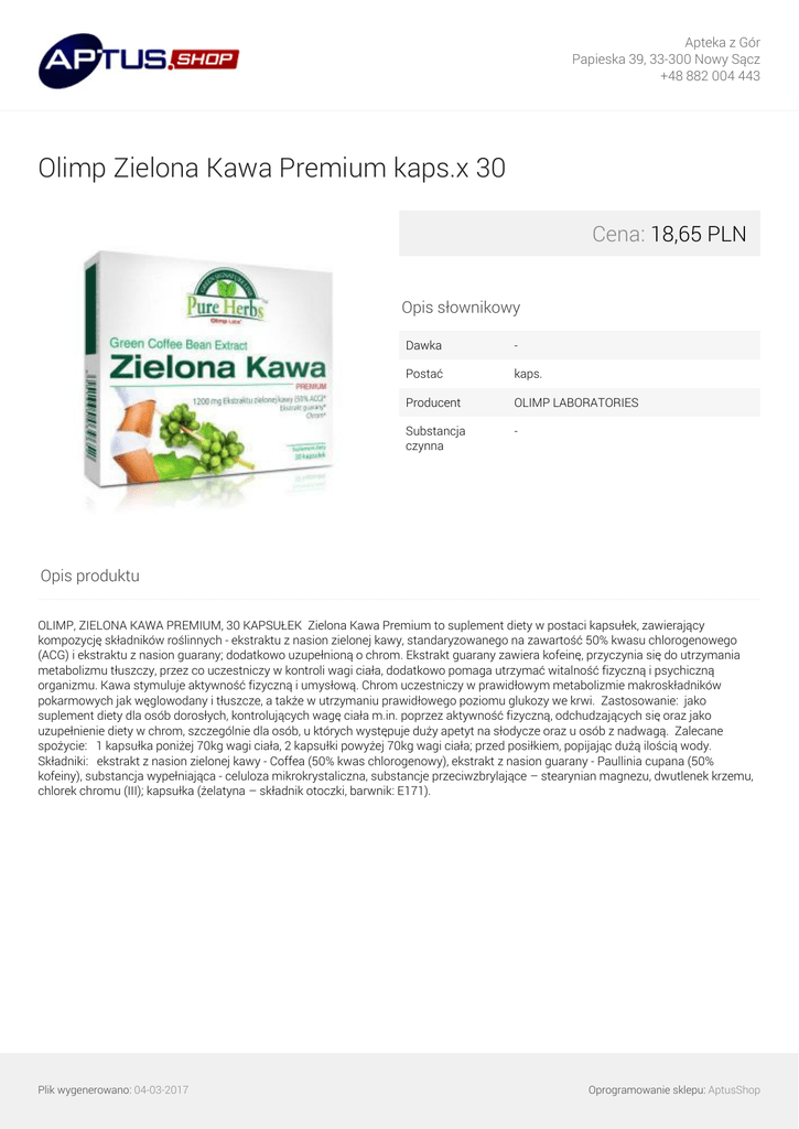 Apteka z Gór Papieska 39, 33-300 Nowy Sącz +48 882 004 443 Olimp Zielona Kawa Premium kaps.x 30 Cena: 18,65 PLN Opis słownikowy Dawka - Postać kaps. Producent OLIMP LABORATORIES Substancja czynna - Opis produktu OLIMP, ZIELONA KAWA PREMIUM, 30 KAPSUŁEK Zielona Kawa Premium to suplement diety w postaci kapsułek, zawierający kompozycję składników roślinnych - ekstraktu z nasion zielonej kawy, standaryzowanego na zawartość 50% kwasu chlorogenowego (ACG) i ekstraktu z nasion guarany; dodatkowo uzupełnioną o chrom. Ekstrakt guarany zawiera kofeinę, przyczynia się do utrzymania metabolizmu tłuszczy, przez co uczestniczy w kontroli wagi ciała, dodatkowo pomaga utrzymać witalność fizyczną i psychiczną organizmu. Kawa stymuluje aktywność fizyczną i umysłową. Chrom uczestniczy w prawidłowym metabolizmie makroskładników pokarmowych jak węglowodany i tłuszcze, a także w utrzymaniu prawidłowego poziomu glukozy we krwi. Zastosowanie: jako suplement diety dla osób dorosłych, kontrolujących wagę ciała m.in. poprzez aktywność fizyczną, odchudzających się oraz jako uzupełnienie diety w chrom, szczególnie dla osób, u których występuje duży apetyt na słodycze oraz u osób z nadwagą. Zalecane spożycie: 1 kapsułka poniżej 70kg wagi ciała, 2 kapsułki powyżej 70kg wagi ciała; przed posiłkiem, popijając dużą ilością wody. Składniki: ekstrakt z nasion zielonej kawy - Coffea (50% kwas chlorogenowy), ekstrakt z nasion guarany - Paullinia cupana (50% kofeiny), substancja wypełniająca - celuloza mikrokrystaliczna, substancje przeciwzbrylające – stearynian magnezu, dwutlenek krzemu, chlorek chromu (III); kapsułka (żelatyna – składnik otoczki, barwnik: E171). Plik wygenerowano: 04-03-2017 Powered by TCPDF (www.tcpdf.org) Oprogramowanie sklepu: AptusShop