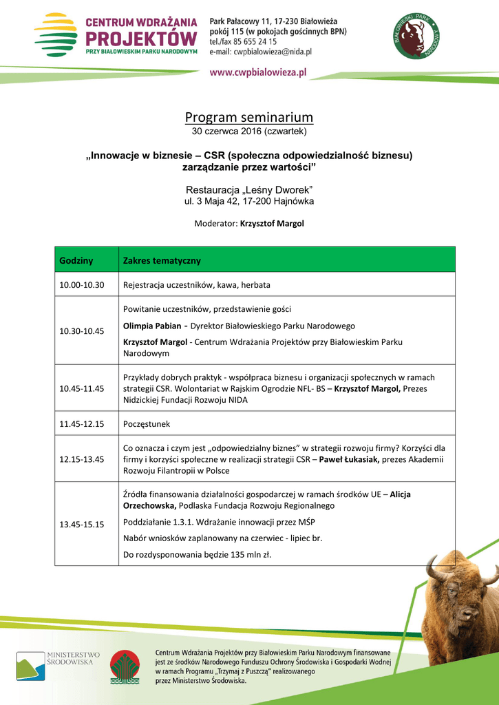 Program seminarium 30 czerwca 2016 (czwartek) „Innowacje w biznesie – CSR (społeczna odpowiedzialność biznesu) zarządzanie przez wartości” Restauracja „Leśny Dworek” ul. 3 Maja 42, 17-200 Hajnówka Moderator: Krzysztof Margol Godziny Zakres tematyczny 10.00-10.30 Rejestracja uczestników, kawa, herbata Powitanie uczestników, przedstawienie gości 10.30-10.45 Olimpia Pabian - Dyrektor Białowieskiego Parku Narodowego Krzysztof Margol - Centrum Wdrażania Projektów przy Białowieskim Parku Narodowym 10.45-11.45 Przykłady dobrych praktyk - współpraca biznesu i organizacji społecznych w ramach strategii CSR. Wolontariat w Rajskim Ogrodzie NFL- BS – Krzysztof Margol, Prezes Nidzickiej Fundacji Rozwoju NIDA 11.45-12.15 Poczęstunek 12.15-13.45 Co oznacza i czym jest „odpowiedzialny biznes” w strategii rozwoju firmy? Korzyści dla firmy i korzyści społeczne w realizacji strategii CSR – Paweł Łukasiak, prezes Akademii Rozwoju Filantropii w Polsce Źródła finansowania działalności gospodarczej w ramach środków UE – Alicja Orzechowska, Podlaska Fundacja Rozwoju Regionalnego 13.45-15.15 Poddziałanie 1.3.1. Wdrażanie innowacji przez MŚP Nabór wniosków zaplanowany na czerwiec - lipiec br. Do rozdysponowania będzie 135 mln zł.