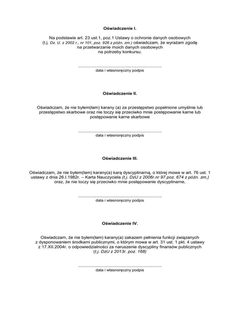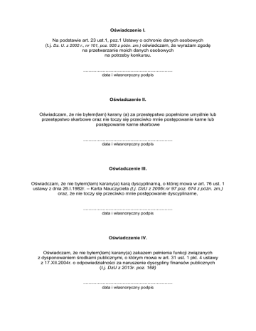 Oświadczenie I. Na podstawie art. 23 ust.1, poz.1 Ustawy o ochronie danych osobowych (t.j. Dz. U. z 2002 r., nr 101, poz. 926 z późn. zm.) oświadczam, że wyrażam zgodę na przetwarzanie moich danych osobowych na potrzeby konkursu. .................................................................... data i własnoręczny podpis Oświadczenie II. Oświadczam, że nie byłem(łam) karany (a) za przestępstwo popełnione umyślnie lub przestępstwo skarbowe oraz nie toczy się przeciwko mnie postępowanie karne lub postępowanie karne skarbowe .................................................................... data i własnoręczny podpis Oświadczenie III. Oświadczam, że nie byłem(łam) karany(a) karą dyscyplinarną, o której mowa w art. 76 ust. 1 ustawy z dnia 26.I.1982r. – Karta Nauczyciela (t.j. DzU z 2006r.nr 97 poz. 674 z późn. zm,) oraz, że nie toczy się przeciwko mnie postępowanie dyscyplinarne, .................................................................... data i własnoręczny podpis Oświadczenie IV. Oświadczam, że nie byłem(łam) karany(a) zakazem pełnienia funkcji związanych z dysponowaniem środkami publicznymi, o którym mowa w art. 31 ust. 1 pkt. 4 ustawy z 17.XII.2004r. o odpowiedzialności za naruszenie dyscypliny finansów publicznych (t.j. DzU z 2013r. poz. 168) .................................................................... data i własnoręczny podpis