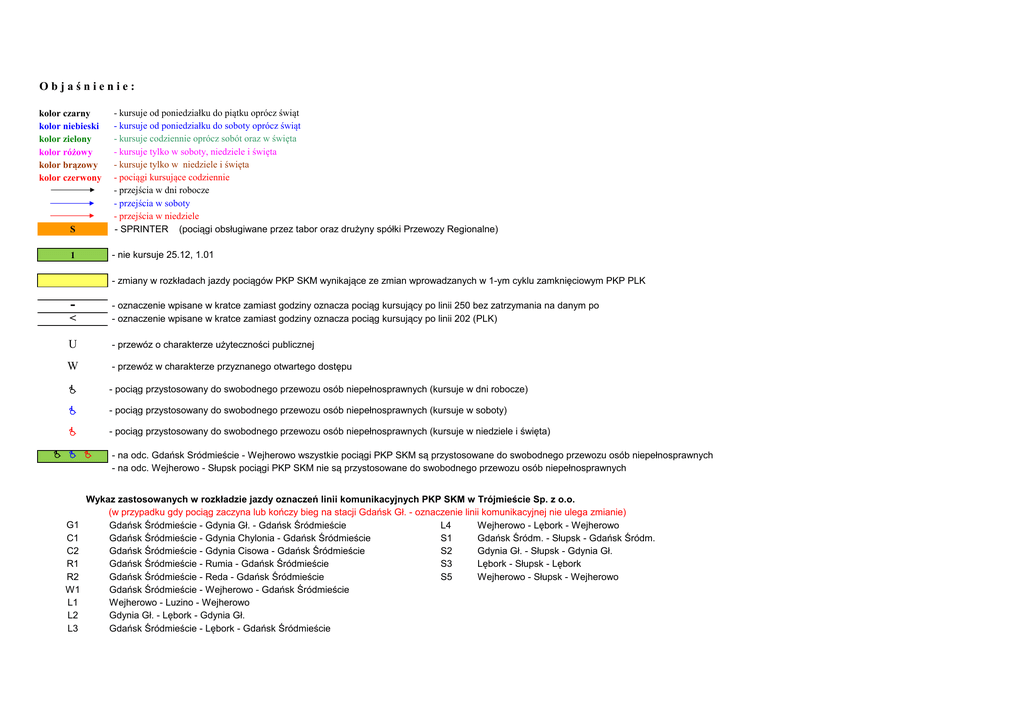 Objaśnienie: S - kursuje od poniedziałku do piątku oprócz świąt - kursuje od poniedziałku do soboty oprócz świąt - kursuje codziennie oprócz sobót oraz w święta - kursuje tylko w soboty, niedziele i święta - kursuje tylko w niedziele i święta - pociągi kursujące codziennie - przejścia w dni robocze - przejścia w soboty - przejścia w niedziele - SPRINTER (pociągi obsługiwane przez tabor oraz drużyny spółki Przewozy Regionalne) 1 - nie kursuje 25.12, 1.01 kolor czarny kolor niebieski kolor zielony kolor różowy kolor brązowy kolor czerwony - zmiany w rozkładach jazdy pociągów PKP SKM wynikające ze zmian wprowadzanych w 1-ym cyklu zamknięciowym PKP PLK < - oznaczenie wpisane w kratce zamiast godziny oznacza pociąg kursujący po linii 250 bez zatrzymania na danym po - oznaczenie wpisane w kratce zamiast godziny oznacza pociąg kursujący po linii 202 (PLK) U - przewóz o charakterze użyteczności publicznej W - przewóz w charakterze przyznanego otwartego dostępu - pociąg przystosowany do swobodnego przewozu osób niepełnosprawnych (kursuje w dni robocze) - pociąg przystosowany do swobodnego przewozu osób niepełnosprawnych (kursuje w soboty) - pociąg przystosowany do swobodnego przewozu osób niepełnosprawnych (kursuje w niedziele i święta) - na odc. Gdańsk Śródmieście - Wejherowo wszystkie pociągi PKP SKM są przystosowane do swobodnego przewozu osób niepełnosprawnych - na odc. Wejherowo - Słupsk pociągi PKP SKM nie są przystosowane do swobodnego przewozu osób niepełnosprawnych G1 C1 C2 R1 R2 W1 L1 L2 L3 Wykaz zastosowanych w rozkładzie jazdy oznaczeń linii komunikacyjnych PKP SKM w Trójmieście Sp. z o.o. (w przypadku gdy pociąg zaczyna lub kończy bieg na stacji Gdańsk Gł. - oznaczenie linii komunikacyjnej nie ulega zmianie) Gdańsk Śródmieście - Gdynia Gł. - Gdańsk Śródmieście L4 Wejherowo - Lębork - Wejherowo Gdańsk Śródmieście - Gdynia Chylonia - Gdańsk Śródmieście S1 Gdańsk Śródm. - Słupsk - Gdańsk Śródm. Gdańsk Śródmieście - Gdynia Cisowa - Gdańsk Śródmieście S2 Gdynia Gł. - Słupsk - Gdynia Gł. Gdańsk Śródmieście - Rumia - Gdańsk Śródmieście S3 Lębork - Słupsk - Lębork Gdańsk Śródmieście - Reda - Gdańsk Śródmieście S5 Wejherowo - Słupsk - Wejherowo Gdańsk Śródmieście - Wejherowo - Gdańsk Śródmieście Wejherowo - Luzino - Wejherowo Gdynia Gł. - Lębork - Gdynia Gł. Gdańsk Śródmieście - Lębork - Gdańsk Śródmieście