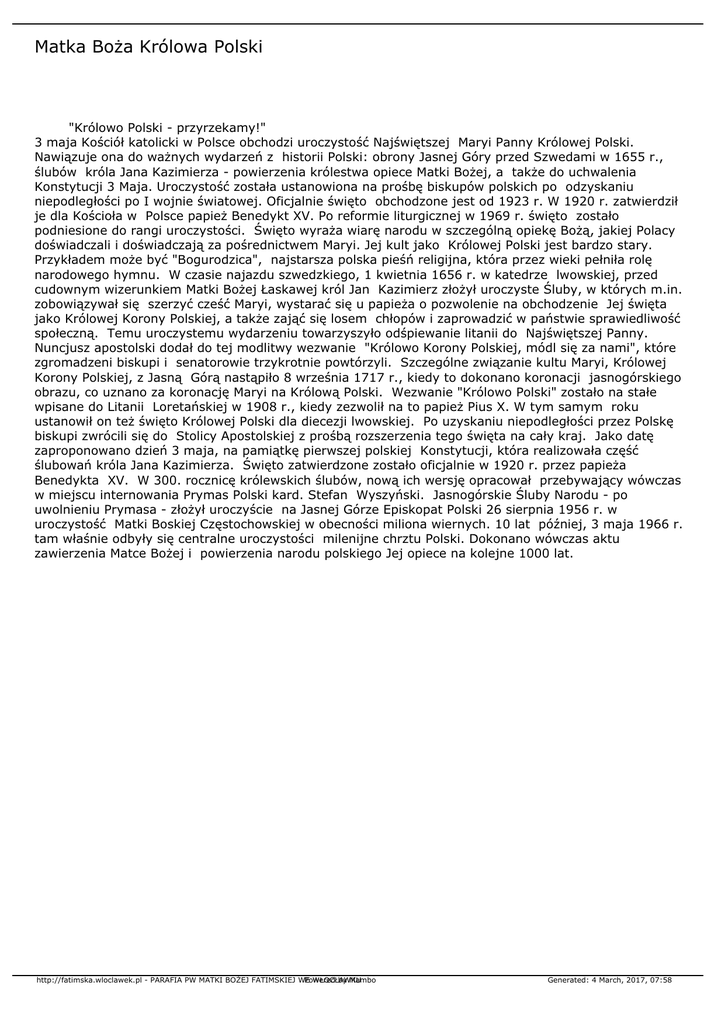 Matka Boża Królowa Polski "Królowo Polski - przyrzekamy!" 3 maja Kościół katolicki w Polsce obchodzi uroczystość Najświętszej Maryi Panny Królowej Polski. Nawiązuje ona do ważnych wydarzeń z historii Polski: obrony Jasnej Góry przed Szwedami w 1655 r., ślubów króla Jana Kazimierza - powierzenia królestwa opiece Matki Bożej, a także do uchwalenia Konstytucji 3 Maja. Uroczystość została ustanowiona na prośbę biskupów polskich po odzyskaniu niepodległości po I wojnie światowej. Oficjalnie święto obchodzone jest od 1923 r. W 1920 r. zatwierdził je dla Kościoła w Polsce papież Benedykt XV. Po reformie liturgicznej w 1969 r. święto zostało podniesione do rangi uroczystości. Święto wyraża wiarę narodu w szczególną opiekę Bożą, jakiej Polacy doświadczali i doświadczają za pośrednictwem Maryi. Jej kult jako Królowej Polski jest bardzo stary. Przykładem może być "Bogurodzica", najstarsza polska pieśń religijna, która przez wieki pełniła rolę narodowego hymnu. W czasie najazdu szwedzkiego, 1 kwietnia 1656 r. w katedrze lwowskiej, przed cudownym wizerunkiem Matki Bożej Łaskawej król Jan Kazimierz złożył uroczyste Śluby, w których m.in. zobowiązywał się szerzyć cześć Maryi, wystarać się u papieża o pozwolenie na obchodzenie Jej święta jako Królowej Korony Polskiej, a także zająć się losem chłopów i zaprowadzić w państwie sprawiedliwość społeczną. Temu uroczystemu wydarzeniu towarzyszyło odśpiewanie litanii do Najświętszej Panny. Nuncjusz apostolski dodał do tej modlitwy wezwanie "Królowo Korony Polskiej, módl się za nami", które zgromadzeni biskupi i senatorowie trzykrotnie powtórzyli. Szczególne związanie kultu Maryi, Królowej Korony Polskiej, z Jasną Górą nastąpiło 8 września 1717 r., kiedy to dokonano koronacji jasnogórskiego obrazu, co uznano za koronację Maryi na Królową Polski. Wezwanie "Królowo Polski" zostało na stałe wpisane do Litanii Loretańskiej w 1908 r., kiedy zezwolił na to papież Pius X. W tym samym roku ustanowił on też święto Królowej Polski dla diecezji lwowskiej. Po uzyskaniu niepodległości przez Polskę biskupi zwrócili się do Stolicy Apostolskiej z prośbą rozszerzenia tego święta na cały kraj. Jako datę zaproponowano dzień 3 maja, na pamiątkę pierwszej polskiej Konstytucji, która realizowała część ślubowań króla Jana Kazimierza. Święto zatwierdzone zostało oficjalnie w 1920 r. przez papieża Benedykta XV. W 300. rocznicę królewskich ślubów, nową ich wersję opracował przebywający wówczas w miejscu internowania Prymas Polski kard. Stefan Wyszyński. Jasnogórskie Śluby Narodu - po uwolnieniu Prymasa - złożył uroczyście na Jasnej Górze Episkopat Polski 26 sierpnia 1956 r. w uroczystość Matki Boskiej Częstochowskiej w obecności miliona wiernych. 10 lat później, 3 maja 1966 r. tam właśnie odbyły się centralne uroczystości milenijne chrztu Polski. Dokonano wówczas aktu zawierzenia Matce Bożej i powierzenia narodu polskiego Jej opiece na kolejne 1000 lat. http://fatimska.wloclawek.pl - PARAFIA PW MATKI BOŻEJ FATIMSKIEJ WE Powered WŁOCŁAWKU by Mambo Generated: 4 March, 2017, 07:58