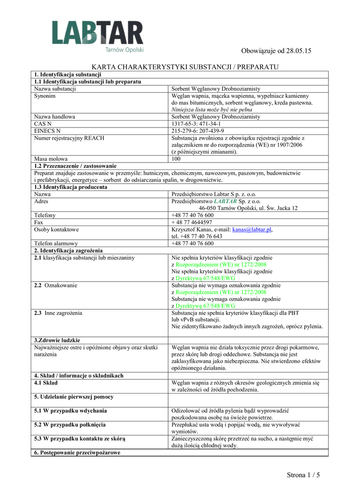 Obowiązuje od 28.05.15 KARTA CHARAKTERYSTYKI SUBSTANCJI / PREPARATU 1. Identyfikacja substancji 1.1 Identyfikacja substancji lub preparatu Nazwa substancji Synonim Nazwa handlowa CAS N EINECS N Numer rejestracyjny REACH Sorbent Węglanowy Drobnoziarnisty Węglan wapnia, mączka wapienna, wypełniacz kamienny do mas bitumicznych, sorbent węglanowy, kreda pastewna. Niniejsza lista może być nie pełna Sorbent Węglanowy Drobnoziarnisty 1317-65-3: 471-34-1 215-279-6: 207-439-9 Substancja zwolniona z obowiązku rejestracji zgodnie z załącznikiem nr do rozporządzenia (WE) nr 1907/2006 (z późniejszymi zmianami). 100 Masa molowa 1.2 Przeznaczenie / zastosowanie Preparat znajduje zastosowanie w przemyśle: hutniczym, chemicznym, nawozowym, paszowym, budownictwie i prefabrykacji, energetyce – sorbent do odsiarczania spalin, w drogownictwie. 1.3 Identyfikacja producenta Nazwa Przedsiębiorstwo Labtar S p. z. o.o. Adres Przedsiębiorstwo LABTAR Sp. z o.o. 46-050 Tarnów Opolski, ul. Św. Jacka 12 Telefony +48 77 40 76 600 Fax + 48 77 4644597 Osoby kontaktowe Krzysztof Kanas, e-mail: [email protected], tel. +48 77 40 76 643 Telefon alarmowy +48 77 40 76 600 2. Identyfikacja zagrożenia 2.1 klasyfikacja substancji lub mieszaniny Nie spełnia kryteriów klasyfikacji zgodnie z Rozporządzeniem (WE) nr 1272/2008 Nie spełnia kryteriów klasyfikacji zgodnie z Dyrektywą 67/548/EWG 2.2 Oznakowanie Substancja nie wymaga oznakowania zgodnie z Rozporządzeniem (WE) nr 1272/2008 Substancja nie wymaga oznakowania zgodnie z Dyrektywą 67/548/EWG 2.3 Inne zagrożenia Substancja nie spełnia kryteriów klasyfikacji dla PBT lub vPvB substancji. Nie zidentyfikowano żadnych innych zagrożeń, oprócz pylenia. 3.Zdrowie ludzkie Najważniejsze ostre i opóźnione objawy oraz skutki narażenia 4. Skład / informacje o składnikach 4.1 Skład Węglan wapnia nie działa toksycznie przez drogi pokarmowe, przez skórę lub drogi oddechowe. Substancja nie jest zaklasyfikowana jako niebezpieczna. Nie stwierdzono efektów opóźnionego działania. Węglan wapnia z różnych okresów geologicznych zmienia się w zależności od źródła pochodzenia. 5. Udzielanie pierwszej pomocy 5.1 W przypadku wdychania 5.2 W przypadku połknięcia 5.3 W przypadku kontaktu ze skórą Odizolować od źródła pylenia bądź wyprowadzić poszkodowana osobę na świeże powietrze. Przepłukać usta wodą i popijać wodą, nie wywoływać wymiotów. Zanieczyszczoną skórę przetrzeć na sucho, a następnie myć dużą ilością chłodnej wody. 6. Postępowanie przeciwpożarowe Strona 1 / 5 Obowiązuje od 28.05.15 6.1 Palność 7. Postępowanie w przypadku niezamierzonego uwolnienia do środowiska 7.1 Osobiste środki ostrożności 7.2 Środki ostrożności dla ochrony środowiska 7.3 Metody oczyszczania 8. Postępowanie i przechowywanie 8.1 Postępowanie Zalecenia dla bezpiecznego postępowania z wyrobem 8.2 Składowanie Zalecenia dla bezpiecznego magazynowanie 9. Identyfikacja zagrożeń / ochrona osobista 9.1 Graniczne wartości narażeń CAS / EINECS Nazwa chemiczna Zgodnie z rozporządzeniem Ministra Pracy i Polityki Społecznej z dnia 6 czerwca 2014r., w sprawie najwyższych dopuszczalnych stężeń i natężeń czynników szkodliwych dla zdrowia w środowisku pracy (Dz.U.2014.817 z późniejszymi zmianami) dla węglanu wapnia najwyższe dopuszczalne stężenie to tylko w przypadku bardzo drobnych frakcji. 9.2 Kontrole narażenia Wskazana wentylacja miejscowa lub ogólna pomieszczenia. Zalecane procedury monitoringu Substancja stała nie palna, nie podtrzymuje palenia, wstrzymuje rozprzestrzenianie płomieni. Prowadzenie akcji gaśniczej nie wymaga dodatkowej ochrony strażaków. Zabezpieczyć rozsypana substancję, aby zapobiec pyleniu, następnie ostrożnie zebrać do zamykanego pojemnika lub pyłoszczelnego worka. oczy – okulary ochronne drogi oddechowe – maska przeciwpyłowa uraz mechaniczny – właściwa odzież robocza Substancja nierozpuszczalna w wodzie. Nie działa szkodliwie na żywe organizmy. Przechowywać materiał w stanie suchym. Rozsypany wyrób zbierać mechanicznie. Przechowywać poza zasięgiem dzieci. Unikać bezpośredniego kontaktu z oczami. Unikać wdychani pyłów. Po zakończeniu pracy należy zmyć z siebie osad pyłu. Powinno się pracować w pomieszczeniach posiadających odpylenia usuwające pył z miejsc ich emisji. Przechowywać w sposób zapobiegający pyleniom. Magazynować na wydzielonych składowiskach w pomieszczeniach lub zbiornikach zabezpieczających przed możliwością zanieczyszczenia. Miejsce magazynowania powinno być oznakowane w celu umożliwienia identyfikacji składowanej substancji. 1317-65-3; 471-34-1; 215-279-6; 207-439-9 Węglan Wapnia NDS – 10,0 mg/m3 Zaleca się oznaczenia najwyższego dopuszczalnego stężenia substancji w powietrzu na stanowiskach pracy Rozporządzenie Ministra Zdrowia z dn.02.02.2011r. w sprawie badań i pomiarów czynników szkodliwych dla zdrowia w środowisku pracy (Dz.U.2011.33.166 z późniejszymi zmianami). Badania i pomiary czynników szkodliwych dla zdrowia wykonuje się metodami określonymi w Polskich Normach, a w razie braku takich norm – metodami zalecanymi przez jednostki badawczo- rozwojowe w dziedzinie medycyny pracy. W przypadku, gdy narażeniu nie można zapobiec za pomocą innych środków, należy stosować środki ochrony indywidualnej. Strona 2 / 5 Obowiązuje od 28.05.15 Ochrona dróg oddechowych Ochrona rąk Ochrona oczu Ochrona skóry Ogólne zalecenia dla bezpieczeństwa i higieny Monitoring ochrony środowiska 10. Właściwości fizyczne i chemiczne 10.1 Informacje ogólne Postać Używać stosownych zabezpieczeń dróg oddechowych przeciwko pyłowi zgodnie ze stopniem ryzyka. Stosować zatwierdzone, impregnowane nitrylem rękawice posiadające znak CE. Stosować szczelnie dopasowane okulary z osłonami bocznymi bądź obudowane okulary o szerokim kącie widzenia. Nie zakładać szkieł kontaktowych przy czynnościach z 