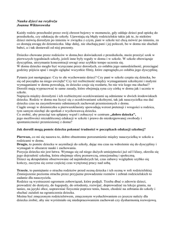 Nauka dzieci na rozdrożu Joanna Wiktorowska Każdy rodzic przechodzi przez swój chrzest bojowy w momencie, gdy oddaje dzieci pod opiekę do przedszkola, czy edukację do szkoły. Ujawniają się błędy rodzicielskie takie jak te, że niektóre dzieci mówią dorosłym po imieniu w związku z czym, pani w szkole też chcą mówić po imieniu, za co dostają uwagę do dzienniczka. Idąc dalej, nie słuchają pani i jej poleceń, bo w domu nie słuchali babci, a i tak dostawali od niej prezenty. Dziecko chowane przez rodziców w domu,bez doświadczeń z przedszkola, może przeżyć szok w pierwszych tygodniach szkoły, jeżeli inne były reguły w domu i w szkole. W szkole obowiązuje dyscyplina, utrzymanie koncentracji uwagi oraz szybkie tempo uczenia się. W domu dziecko mogło być wyręczane przez dorosłych, co osłabia jego samodzielność, przeciągać godziny pójścia spać i mogło oglądać wszystkie filmy, które zapragnęło,co osłabia jego dyscyplinę. Pytanie jest następujące: Czy to złe wychowanie dzieci? Czy pani w szkole czepia się dziecka, bo się od początku na niego uwzięła? Czy też rozbieżność między wymaganiami szkolnymi i małymi wymaganiami w domu powodują, że dziecko czuje się rozdarte, bo nie wie kogo ma słuchać? Dorośli mają wypracować te same zasady, które obejmują syna czy córkę w domu jak i ucznia w szkole. Napięcia między dorosłymi i ich rozbieżnymi oczekiwaniami są odmienne w dwóch środowiskach dziecka. Rodzic w domu ma liczyć się z oczekiwaniami szkolnymi, tak jak nauczycielka ma dać dziecku czas na zasymilowanie odmiennych zachowań przeniesionych z domu. Ciągłe uwagi w dzienniczku u pierwszoklasisty spowodują wzrost pretensji i wrogości u rodzica, tym samym niechęć do spotkań z wychowawcą dziecka. Co zrobić, aby przeciąć ten splątany węzeł i zobaczyć w centrum „dobro dziecka”, jego możliwości niezakłóconej edukacji w szkole i prawo do nieskrępowanej swobody i spontaniczności przeniesionej z domu? Jak dorośli mogą pomóc dziecku pokonać trudności w początkach edukacji szkolnej? Pierwsze, co mi się nasuwa to, dobre obustronne porozumienie między nauczycielką w szkole a rodzicami w domu. Drugie, to pomóc dziecku w asymilacji do szkoły, dając mu czas na wdrożenie się do dyscypliny i wymagań w obszarze nauki i zachowania. Pozycja dziecka nie jest łatwa. Wymaga się od niego dużych umiejętności już od I klasy, określa się jego dojrzałość szkolną, która obejmuje sferę poznawczą, emocjonalną i społeczną. Dzieci są skrupulatnie obserwowane od najmłodszych lat, czas zabawy względnie szybko się kończy, zaczyna się coraz częściej czas wytężonej pracy nad sobą. Trzecie, to pamiętanie o strachu rodziców przed oceną dziecka i ich oceną w roli rodzicielskiej. Zmniejszenie poziomu strachu przez przyjazne prowadzenie rozmów i zebrań rodzicielskich to zadanie dla nauczyciela. Rodzice są wystraszeni ogromem zobowiązań, które podjęli. Trzeba dbać o zdrowie dzieci, prowadzić do dentysty, do logopedy, do ortodonty, rozwijać, doprowadzać na lekcje grania, na taniec, na języki obce, usprawniać fizycznie poprzez tenis, basen, chodzić na zebrania do szkoły i słuchać zażaleń na ograniczenia dziecka. Można być zmęczonym rodzicielstwem, zmęczonym wysłuchiwaniem co jeszcze należy dla dziecka zrobić, aby nie wyróżniało się niedopracowaniem zachowań czy dysharmonią rozwojową. Rodzice, znajdźmy spokój w sobie, szukajmy dla siebie, spokojnych przyjaciół, dla dzieci spokojnych nauczycieli. Czas na regenerację własnych sił, czas na znalezienie przestrzeni ciszy i spokoju, odnowę biologiczną macierzyństwa i ojcostwa. Jak to zrobić? Szukać w swojej okolicy czy mieście grupy edukacyjnej dla rodziców, czy dorosłych. Szukać grup rozwojowych, czy wspierających. Coraz więcej psychologów może prowadzić grupy pod warunkiem posiadania odpowiednich kwalifikacji. Można pytać o przygotowanie prowadzących, jak też o miejsce ich prowadzenia, w szkole czy w Poradni PsychologicznoPedagogicznej. Mogą być grupy dla zaangażowanych rodziców, którzy są świadomi własnych ograniczeń i chcą uniknąć błędów swoich rodziców, jedyna droga to zobaczenie tego błędu a potem odbicie się od niego i zostawienie go za sobą. Czwarty sposób, to uczestnictwo rodziców w grupie edukacyjnej. Piąty sposób, to znalezienie dla siebie przyjemności, które rekompensują trudy rodzicielskie. Na zajęciach dla rodziców stworzyliśmy listę wybranych przyjemności: słuchanie muzyki czytanie książek chodzenie na spacer myszkowanie po antykwariatach, rozmowy z przyjaciółmi, z dziećmi, z mężem aromatyczna kąpiel tulenie się do dzieci słuchanie jak ktoś chwali dzieci robienie prezentów podróże, zwiedzanie nowych miejsc dawanie innym przyjemności wysyłanie i otrzymywanie od znajomym sentencji życiowych, złotych myśli wymyślanie nowych potraw Bezustannie wzrasta tempo życia i wymaga się od nas więcej, szybciej, lepiej, cywilizacja wciąga nas w orbitę przyśpieszeń, „zawrotnych” decyzji, sprzecznych wymagań, niesłabnącej konkurencji. Niech rodzina z całym swoim dobrodziejstwem ma dobre i mocne granice, przed wpuszczeniem nadmiaru huraganów zewnętrznych. Niech chroni ważne sprawy swoje i swoich dzieci. Ojciec jest pierwszym wzorem do naśladowania przez synów, matka dla córek. Możemy stworzyć stan zdystansowania w sobie, polegający na nie wpadaniu w panikę, wstrzymania się od reakcji impulsywnych, świadomego powstrzymania reakcji odwetu do:uwag pani w szkole, przymusu wyjazdów na zieloną szkołę, braku uczestnictwa dziecka w akademiach szkolnych. Tych i innych umiejętności będziemy mogli się nauczyć na edukacyjnej grupie dla rodziców, o której pisałam wcześniej. Na wszystko w życiu przychodzi czas, na zachwyt nad zabawą dziecka, na śmiech na trawie i ulubiony film, na lekcje w wygodnym, bezpiecznym 