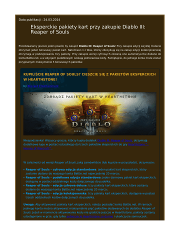 Data publikacji : 24.03.2014 Eksperckie pakiety kart przy zakupie Diablo III: Reaper of Souls Przedstawiamy jeszcze jeden powód, by zakupić Diablo III: Reaper of Souls! Przy zakupie edycji zwykłej możecie otrzymać jeden bonusowy pakiet kart. Natomiast ci z Was, którzy zdecydują się na zakup edycji kolekcjonerskiej otrzymają w podziękowaniu trzy pakiety. Przy zakupie wersji cyfrowych zostaną one automatycznie dodane do konta Battle.net, a w edycjach pudełkowych czekają jednorazowe kody. Pamiętajcie, do jednego konta może zostać przypisanych maksymalnie 5 bonusowych pakietów. KUPILIŚCIE REAPER OF SOULS? CIESZCIE SIĘ Z PAKIETÓW EKSPERCKICH W HEARTHSTONE! by Blizzard Entertainment Niespodzianka! Wszyscy gracze, którzy kupią dodatek Diablo III: Reaper of Souls, otrzymają dodatkowe łupy w postaci od jednego do trzech pakietów eksperckich do gry Hearthstone™: Heroes of Warcraft™. W zależności od wersji Reaper of Souls, jaką zamówiliście (lub kupicie w przyszłości), otrzymacie: ● ● ● ● Reaper of Souls – cyfrowa edycja standardowa: jeden pakiet kart eksperckich, który zostanie dodany do waszego konta Battle.net najwcześniej 20 marca; Reaper of Souls – pudełkowa edycja standardowa: jeden darmowy pakiet kart eksperckich, dostępny w postaci oddzielnego kodu dołączonego do pudełka; Reaper of Souls – edycja cyfrowa deluxe: trzy pakiety kart eksperckich, które zostaną dodane do waszego konta Battle.net najwcześniej 20 marca; Reaper of Souls – edycja kolekcjonerska: trzy pakiety kart eksperckich, dostępne w postaci trzech oddzielnych kodów dołączonych do pudełka. Uwaga: Aby aktywować pakiety kart eksperckich, należy posiadać konto Battle.net. W ramach jednego konta można aktywować maksymalnie pięć pakietów dodawanych do dodatku Reaper of Souls. Jeżeli w momencie aktywowania kodu nie graliście jeszcze w Hearthstone, pakiety zostaną udostępnione w grze, gdy tylko pobierzecie Hearthstone za darmo i ukończycie samouczek. Bawcie się dobrze w Reaper of Souls, odważnie broniąć świata śmiertelników, a gdy wasz bohater będzie potrzebował chwili wytchnienia, udajcie się do karczmy Hearthstone: Heroes of Warcraft i rozegrajcie kilka partyjek, korzystając z waszych nowych, darmowych kart! Autor: Ch3rry Liczba wyświetleń strony: 5787 Data publikacji : 24.03.2014 Tagi: Hearthstone, Reaper of Souls, dodatki cyfrowe Komentarz (0) dodaj komentarz Brak komentarzy dodaj komentarz Pozostałe nowości Nowy bohater w Hearthstone - Lady Liadrin Blizzard postanowił zaskoczyć wszystkich udostępniając nowego bohatera do Hearthstone, którego zdobyć można grając w World of Warcraft. Nie macie się jednak co martwić, wystarczy zdobyć jedynie 20 poziom w popularnym MMO, aby Lady Liadrin zajęła miejsce Uthera jako paladyn w grze.Data publikacji: 15.03.20160 Zapowiedź nowości w Hearthstone Jeśli to co dzieje się w Hearthstone zaczynało was powoli nudzić, to mamy dobre informacje. Już wkrótce do gry zostanie wprowadzonych szeerg zmian, które odświeżą rozgrywkę w karczmie.Data publikacji: 02.02.20160 Nadchodzi Zimowa Uczta W zapowiedzi najnowszej aktualizacji pojawiła się wzmianka na temat Zimowej Uczty, która wkrótce ma rozpocząć się w Hearthstone. Dziś Blizzard ujawnia pierwsze niespodzianki związane z tym wydarzeniem.Data publikacji: 09.12.20150 Liga Odkrywców dostępna w aktualizacji 4.0 Najnowsza aktualizacja do Hearthstone wprowadza przygodę Liga Odkrywców, kilka nowych rewersów do kart oraz naprawia niewielką ilość błędów w grze. Więcej informacji znajdziecie w rozwinięciu newsa.Data publikacji: 12.11.20150 BlizzCon 2015 - karty z Ligi Odkrywców Na łamach serwisu HearthPwn pojawiły się wszystkie karty, które będą dostępne w przygodzie Liga Odkrywców - wygląda na to, że będą mogły sporo namieszać w karczmie Hearthstone.Data publikacji: 07.11.20150 Wszystkie nowości