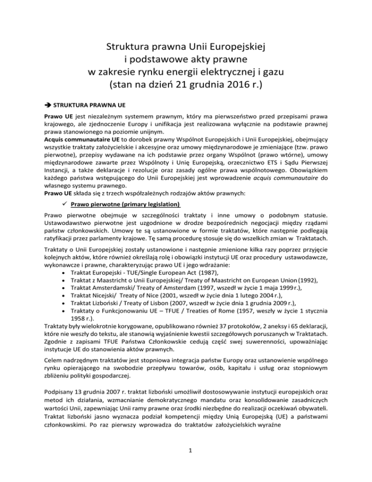 Struktura prawna Unii Europejskiej i podstawowe akty prawne w zakresie rynku energii elektrycznej i gazu (stan na dzień 21 grudnia 2016 r.) STRUKTURA PRAWNA UE Prawo UE jest niezależnym systemem prawnym, który ma pierwszeństwo przed przepisami prawa krajowego, ale zjednoczenie Europy i unifikacja jest realizowana wyłącznie na podstawie prawnej prawa stanowionego na poziomie unijnym. Acquis communautaire UE to dorobek prawny Wspólnot Europejskich i Unii Europejskiej, obejmujący wszystkie traktaty założycielskie i akcesyjne oraz umowy międzynarodowe je zmieniające (tzw. prawo pierwotne), przepisy wydawane na ich podstawie przez organy Wspólnot (prawo wtórne), umowy międzynarodowe zawarte przez Wspólnoty i Unię Europejską, orzecznictwo ETS i Sądu Pierwszej Instancji, a także deklaracje i rezolucje oraz zasady ogólne prawa wspólnotowego. Obowiązkiem każdego państwa wstępującego do Unii Europejskiej jest wprowadzenie acquis communautaire do własnego systemu prawnego. Prawo UE składa się z trzech współzależnych rodzajów aktów prawnych: Prawo pierwotne (primary legislation) Prawo pierwotne obejmuje w szczególności traktaty i inne umowy o podobnym statusie. Ustawodawstwo pierwotne jest uzgodnione w drodze bezpośrednich negocjacji między rządami państw członkowskich. Umowy te są ustanowione w formie traktatów, które następnie podlegają ratyfikacji przez parlamenty krajowe. Tę samą procedurę stosuje się do wszelkich zmian w Traktatach. Traktaty o Unii Europejskiej zostały ustanowione i następnie zmienione kilka razy poprzez przyjęcie kolejnych aktów, które również określają rolę i obowiązki instytucji UE oraz procedury ustawodawcze, wykonawcze i prawne, charakteryzując prawo UE i jego wdrażanie: Traktat Europejski - TUE/Single European Act (1987), Traktat z Maastricht o Unii Europejskiej/ Treaty of Maastricht on European Union (1992), Traktat Amsterdamski/ Treaty of Amsterdam (1997, wszedł w życie 1 maja 1999 r.), Traktat Nicejski/ Treaty of Nice (2001, wszedł w życie dnia 1 lutego 2004 r.), Traktat Lizboński / Treaty of Lisbon (2007, wszedł w życie dnia 1 grudnia 2009 r.), Traktaty o Funkcjonowaniu UE – TFUE / Treaties of Rome (1957, weszły w życie 1 stycznia 1958 r.). Traktaty były wielokrotnie korygowane, opublikowano również 37 protokołów, 2 aneksy i 65 deklaracji, które nie weszły do tekstu, ale stanowią wyjaśnienie kwestii szczegółowych poruszanych w Traktatach. Zgodnie z zapisami TFUE Państwa Członkowskie cedują część swej suwerenności, upoważniając instytucje UE do stanowienia aktów prawnych. Celem nadrzędnym traktatów jest stopniowa integracja państw Europy oraz ustanowienie wspólnego rynku opierającego na swobodzie przepływu towarów, osób, kapitału i usług oraz stopniowym zbliżeniu polityki gospodarczej. Podpisany 13 grudnia 2007 r. traktat lizboński umożliwił dostosowywanie instytucji europejskich oraz metod ich działania, wzmacnianie demokratycznego mandatu oraz konsolidowanie zasadniczych wartości Unii, zapewniając Unii ramy prawne oraz środki niezbędne do realizacji oczekiwań obywateli. Traktat lizboński jasno wyznacza podział kompetencji między Unią Europejską (UE) a państwami członkowskimi. Po raz pierwszy wprowadza do traktatów założycielskich wyraźne 1 rozróżnienie na trzy podstawowe rodzaje kompetencji: kompetencje wyłączne, kompetencje dzielone i kompetencje wspierające. Granice kompetencji są wyraźnie wyznaczone, co ułatwia stosowanie podstawowych zasad kontroli i wykonywania kompetencji. Traktat o funkcjonowaniu Unii Europejskiej (TFUE) wprowadza 3 kategorie kompetencji: wyłączne kompetencje (art. 3 TFUE): jedynie UE jest uprawniona do ustanawiania przepisów w tych dziedzinach. Rola państw członkowskich ogranicza się do stosowania tych przepisów, chyba że Unia zezwoli im na przyjęcie innych aktów, kompetencje dzielone (art. 4 TFUE): UE i państwa członkowskie mogą przyjmować akty prawne obowiązujące w tych dziedzinach. Niemniej państwa członkowskie mogą wykonywać swoją kompetencję tylko w zakresie, w jakim UE nie wykonała lub postanowiła zaprzestać wykonywania swojej kompetencji, kompetencje wspierające (art. 6 TFUE): UE może jedynie wspierać, koordynować lub uzupełniać działania państw członkowskich. Oznacza to, że nie posiada władzy ustawodawczej w tych dziedzinach i nie może wpływać na wykonywanie kompetencji zarezerwowanych dla państw członkowskich. Ustawodawstwa wtórne (secondary legislation) Aby osiągnąć cele założone w traktatach, państwa członkowskie zrezygnowały z części swojej suwerenności i upoważniły instytucje UE do przyjmowania aktów prawnych (rozporządzenia, dyrektywy, decyzje), które mają pierwszeństwo nad prawem krajowym. Akty te, zwane prawem wtórnym, są istotnym źródłem przepisów UE, po traktatach (prawo pierwotne) oraz umowach międzynarodowych. W skład prawa wtórnego wchodzą wiążące akty prawne (rozporządzenia, dyrektywy i decyzje) oraz akty niewiążące (rezolucje/zalecenia i opinie), przewidziane w Traktacie o Funkcjonowaniu UE, jak również różne inne akty prawne, np. przepisy wewnętrzne instytucji lub wspólnotowe programy działań. Podstawowe akty prawa poza-traktatowego to rozporządzenia, dyrektywy, decyzje, komunikaty, zielone księgi i białe księgi. Uzupełnienie stanowią: rekomendacje, opinie, strategie oraz przepisy dotyczące sposobów i procedur działania instytucji unijnych. AKTY PRAWNE UE Traktatem Lizbońskim wprowadzono zmiany w zakresie typologii aktów prawnych UE. Z dotychczasowych czternastu pozostało tylko pięć rodzajów aktów: • rozporządzenie, • dyrektywa, • decyzja, • zalecenie, • opinia. Na mocy art. 288 Traktatu o funkcjonowaniu Unii Europejskiej rozporządzenie, dyrektywa i decyzja są aktami wiążącymi. Wiążące wobec wskazanych adresatów nie są natomiast zalecenie i opinia. W decyzji nie ma o
