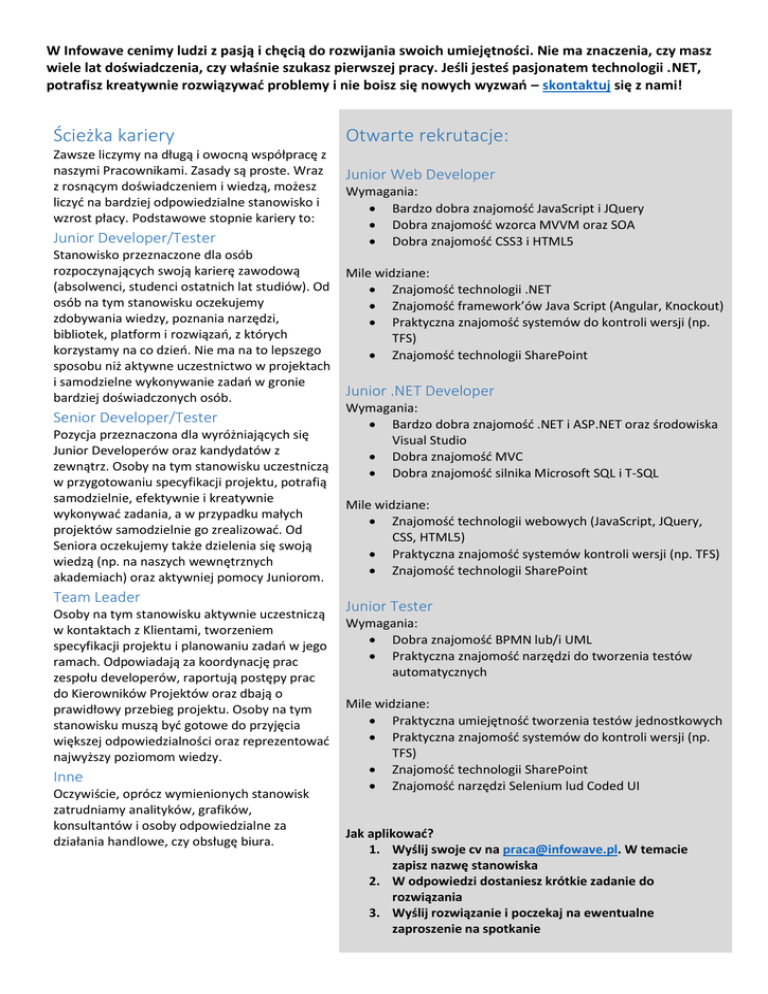 W Infowave cenimy ludzi z pasją i chęcią do rozwijania swoich umiejętności. Nie ma znaczenia, czy masz wiele lat doświadczenia, czy właśnie szukasz pierwszej pracy. Jeśli jesteś pasjonatem technologii .NET, potrafisz kreatywnie rozwiązywać problemy i nie boisz się nowych wyzwań – skontaktuj się z nami! Ścieżka kariery Zawsze liczymy na długą i owocną współpracę z naszymi Pracownikami. Zasady są proste. Wraz z rosnącym doświadczeniem i wiedzą, możesz liczyć na bardziej odpowiedzialne stanowisko i wzrost płacy. Podstawowe stopnie kariery to: Junior Developer/Tester Stanowisko przeznaczone dla osób rozpoczynających swoją karierę zawodową (absolwenci, studenci ostatnich lat studiów). Od osób na tym stanowisku oczekujemy zdobywania wiedzy, poznania narzędzi, bibliotek, platform i rozwiązań, z których korzystamy na co dzień. Nie ma na to lepszego sposobu niż aktywne uczestnictwo w projektach i samodzielne wykonywanie zadań w gronie bardziej doświadczonych osób. Senior Developer/Tester Pozycja przeznaczona dla wyróżniających się Junior Developerów oraz kandydatów z zewnątrz. Osoby na tym stanowisku uczestniczą w przygotowaniu specyfikacji projektu, potrafią samodzielnie, efektywnie i kreatywnie wykonywać zadania, a w przypadku małych projektów samodzielnie go zrealizować. Od Seniora oczekujemy także dzielenia się swoją wiedzą (np. na naszych wewnętrznych akademiach) oraz aktywniej pomocy Juniorom. Team Leader Osoby na tym stanowisku aktywnie uczestniczą w kontaktach z Klientami, tworzeniem specyfikacji projektu i planowaniu zadań w jego ramach. Odpowiadają za koordynację prac zespołu developerów, raportują postępy prac do Kierowników Projektów oraz dbają o prawidłowy przebieg projektu. Osoby na tym stanowisku muszą być gotowe do przyjęcia większej odpowiedzialności oraz reprezentować najwyższy poziomom wiedzy. Inne Oczywiście, oprócz wymienionych stanowisk zatrudniamy analityków, grafików, konsultantów i osoby odpowiedzialne za działania handlowe, czy obsługę biura. Otwarte rekrutacje: Junior Web Developer Wymagania: Bardzo dobra znajomość JavaScript i JQuery Dobra znajomość wzorca MVVM oraz SOA Dobra znajomość CSS3 i HTML5 Mile widziane: Znajomość technologii .NET Znajomość framework’ów Java Script (Angular, Knockout) Praktyczna znajomość systemów do kontroli wersji (np. TFS) Znajomość technologii SharePoint Junior .NET Developer Wymagania: Bardzo dobra znajomość .NET i ASP.NET oraz środowiska Visual Studio Dobra znajomość MVC Dobra znajomość silnika Microsoft SQL i T-SQL Mile widziane: Znajomość technologii webowych (JavaScript, JQuery, CSS, HTML5) Praktyczna znajomość systemów kontroli wersji (np. TFS) Znajomość technologii SharePoint Junior Tester Wymagania: Dobra znajomość BPMN lub/i UML Praktyczna znajomość narzędzi do tworzenia testów automatycznych Mile widziane: Praktyczna umiejętność tworzenia testów jednostkowych Praktyczna znajomość systemów do kontroli wersji (np. TFS) Znajomość technologii SharePoint Znajomość narzędzi Selenium lud Coded UI Jak aplikować? 1. Wyślij swoje cv na [email protected]. W temacie zapisz nazwę stanowiska 2. W odpowiedzi dostaniesz krótkie zadanie do rozwiązania 3. Wyślij rozwiązanie i poczekaj na ewentualne zaproszenie na spotkanie Jak wygląda praca u nas? Czas pracy i zarobki Technologia Stawka ustalana jest indywidualnie z każdym z Pracowników. Co pół roku wspólnie dokonujemy podsumowania zrealizowanych celów i osiągnięć, co jest dobrym momentem negocjowania zarobków. Godziny pracy są elastyczne. Normalny dzień pracy trwa osiem godzin i rozpoczyna się między 8:00, a 10:00 rano. Praca zdalna jest możliwa, jeśli tylko projekt na to pozwala. Umożliwiamy też pracę w niepełnym wymiarze czasu, aby dopasować ją np. do zajęć na Uczelni Większość naszych projektów realizowana jest na platformie SharePoint i SQL Server, ale Active Directory, Exchange, CRM, Project Server i inne rozwiązania Microsoft nie są rzadkością. Stale rozwijamy naszą wewnętrzną bibliotekę rozwiązań, które sprawdzone w boju pozwalają zdecydowanie szybciej realizować kolejne projekty. Wspieramy się rozwiązaniami Telerik’a, a oprócz nich korzystamy z niezmierzonej ilości innych bibliotek. Zawsze staramy się stale szukać najlepszych rozwiązań. Oczywiście pracujemy w Visual Studio i Team Foudation Server. Przy zarządzaniu projektami wspieramy się Microsoft Project Server. Rozwój Zdrowie To jeden z priorytetów w naszej firmie. Gwarantujemy dużą dawkę praktycznej wiedzy i doświadczenia stymulowanej przez wewnętrzne akademie (krótkie prezentacje techniczne przygotowywane przez naszych pracowników), dostęp do całej biblioteki książek i kursów safari, czy oficjalnych materiałów i szkoleń firmy Microsoft. Dodatkowo każdego zachęcamy do zdawania certyfikatów. Wszystkie koszty pokrywa firma, a certyfikat jest zawsze przypisany do Pracownika. Wiedza i doświadczenie poparte certyfikatem jest głównym elementem regularnej ewaluacji naszych Pracowników Krótko: Enel-Med Chillout Nie samą pracą człowiek żyje. Regularnie staramy się spędzać wolny czas na różnego rodzaju aktywnościach. Paintball, gokarty, laser tag, escape room, czy wspólne wyjście do pubu- na pewno znajdziesz coś dla siebie. Latem podsumowujemy miniony okres i nakreślamy plany na kolejny na tradycyjnym wyjeździe integracyjnym pod żaglami w pięknych, mazurskich okolicznościach przyrody.