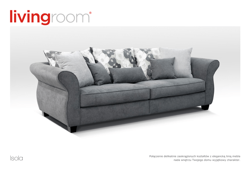 Isola Połączenie delikatnie zaokrąglonych kształtów z elegancką linią mebla nada wnętrzu Twojego domu wyjątkowy charakter. Isola Isola Isola 1002 1501B fotel z dwoma podłokietnikami 1,5 z lewym podłokietnikiem W/D/H 112/105/92 cm W/D/H 126/105/92 cm 1503B 1,5 z prawym podłokietnikiem W/D/H 126/105/92 cm 2001 2-sofa z lewym podłokietnikiem 2003 2-sofa z prawym podłokietnikiem 2002 2-sofa z dwoma podłokietnikami W/D/H 166/105/92 cm W/D/H 166/105/92 cm W/D/H 192/105/92 cm 2501 2,5-sofa z lewym podłokietnikiem 2503 2,5-sofa z prawym podłokietnikiem 2502 2,5-sofa z dwoma podłokietnikami 3001 3-sofa z lewym podłokietnikiem 3003 3-sofa z prawym podłokietnikiem 4626 3-sofa z dwoma podłokietnikami W/D/H 186/105/92 cm W/D/H 186/105/92 cm W/D/H 212/105/92 cm W/D/H 226/105/92 cm W/D/H 226/105/92 cm W/D/H 252/105/92 cm 6151 Longchair lewy mały 6153 Longchair prawy mały W/D/H 96/170/92 cm W/D/H 96/170/92 cm 6021 Longchair z lewym podłokietnikiem 6023 Longchair z prawym podłokietnikiem 6061 Longchair z lewym podłokietnikiem, duży 6063 Longchair z prawym podłokietnikiem, duży W/D/H 106/170/92 cm W/D/H 106/170/92 cm W/D/H 126/170/92 cm W/D/H 126/170/92 cm Isola 90808 pufa 80x80 909060 pufa 90x60 994041 Poduszka 40x40 Typ I 996540 Poduszka lędźwiowa 65x40 W/D/H 80/80/49 cm W/D/H 60/90/49 cm W/D/H 40/15/40 cm W/D/H 60/15/30 cm 4925 4926 zestaw: 1,5 element z lewym zestaw: longchair lewy duży + podłokietnikiem + longchair element 1,5 z prawym prawy duży podłokietnikiem W/D/H 252/170/92 cm W/D/H 252/170/92 cm 865 zestaw: 2sofa z lewym podłokietnikiem + longchair prawy mały 246 zestaw: longchair lewy mały + element 2 z prawym podłokietnikiem 846 zestaw: 2,5-sofa z lewym podłokietnikiem + longchair prawy 553 zestaw: Longchair lewy+2,5-sofa z prawym podłokietnikiem 929 zestaw: 3 element z lewym podłokietnikiem + longchair prawy duży 926 zestaw: longchair lewy duży + element 3 z prawym podłokietnikiem W/D/H 262/170/92 cm W/D/H 262/170/92 cm W/D/H 292/170/92 cm W/D/H 292/170/92 cm W/D/H 352/170/92 cm W/D/H 352/170/92 cm