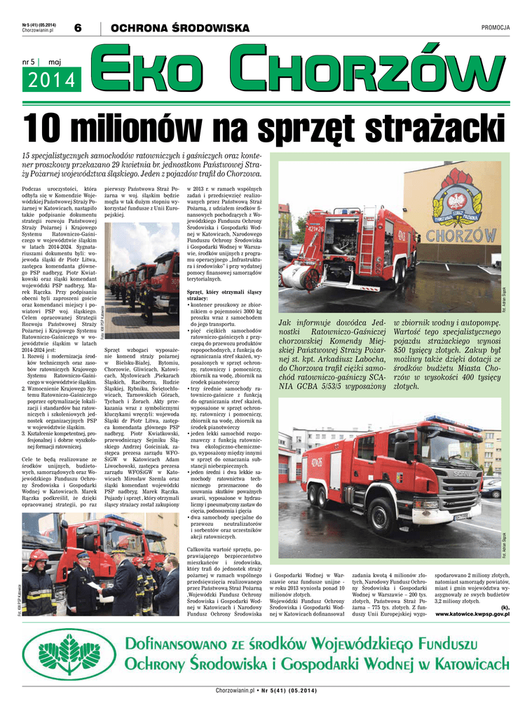 Nr 5 (41) (05.2014) Chorzowianin.pl nr 5 | 6 maj 2014 OCHRONA ŚRODOWISKA PROMOCJA Eko Chorzów 10 milionów na sprzęt strażacki 15 specjalistycznych samochodów ratowniczych i gaśniczych oraz kontener proszkowy przekazano 29 kwietnia br. jednostkom Państwowej Straży Pożarnej województwa śląskiego. Jeden z pojazdów trafił do Chorzowa. Fot. KW PSP Katowice Sprzęt wzbogaci wyposażenie komend straży pożarnej w Bielsku-Białej, Bytomiu, Chorzowie, Gliwicach, Katowicach, Mysłowicach ,Piekarach Śląskich, Raciborzu, Rudzie Śląskiej, Rybniku, Świętochłowicach, Tarnowskich Górach, Tychach i Żorach. Akty przekazania wraz z symbolicznymi kluczykami wręczyli: wojewoda Śląski dr Piotr Litwa, zastępca komendanta głównego PSP nadbryg. Piotr Kwiatkowski, przewodniczący Sejmiku Śląskiego Andrzej Gościniak, zastępca prezesa zarządu WFOŚiGW w Katowicach Adam Liwochowski, zastępca prezesa zarządu WFOŚiGW w Katowicach Mirosław Szemla oraz śląski komendant wojewódzki PSP nadbryg. Marek Rączka. Pojazdy i sprzęt , który otrzymali śląscy strażacy został zakupiony Sprzęt, który otrzymali śląscy strażacy: •kontener proszkowy ze zbiornikiem o pojemności 3000 kg proszku wraz z samochodem do jego transportu. •pięć ciężkich samochodów ratowniczo-gaśniczych z przyczepą do przewozu produktów ropopochodnych, z funkcją do ograniczania stref skażeń, wyposażonych w sprzęt ochronny, ratowniczy i pomocniczy, zbiornik na wodę, zbiornik na środek pianotwórczy •trzy średnie samochody ratowniczo-gaśnicze z funkcją do ograniczania stref skażeń, wyposażone w sprzęt ochronny, ratowniczy i pomocniczy, zbiornik na wodę, zbiornik na środek pianotwórczy •jeden lekki samochód rozpoznawczy z funkcją ratownictwa ekologiczno-chemicznego, wyposażony między innymi w sprzęt do oznaczania substancji niebezpiecznych. •jeden średni i dwa lekkie samochody ratownictwa technicznego przeznaczone do usuwania skutków poważnych awarii, wyposażone w hydrauliczny i pneumatyczny zastaw do cięcia, podnoszenia i gięcia •dwa samochody specjalne do przewozu neutralizatorów i sorbentów oraz uczestników akcji ratowniczych. Całkowita wartość sprzętu, poprawiającego bezpieczeństwo mieszkańców i środowiska, który trafi do jednostek straży pożarnej w ramach wspólnego przedsięwzięcia realizowanego przez Państwową Straż Pożarną ,Wojewódzki Fundusz Ochrony Środowiska i Gospodarki Wodnej w Katowicach i Narodowy Fundusz Ochrony Środowiska Fot. Adrian Ślązok w 2013 r. w ramach wspólnych zadań i przedsięwzięć realizowanych przez Państwową Straż Pożarną, z udziałem środków finansowych pochodzących z Wojewódzkiego Funduszu Ochrony Środowiska i Gospodarki Wodnej w Katowicach, Narodowego Funduszu Ochrony Środowiska i Gospodarki Wodnej w Warszawie, środków unijnych z programu operacyjnego „Infrastruktura i środowisko” i przy wydatnej pomocy finansowej samorządów terytorialnych. Jak informuje dowódca Jednostki Ratowniczo-Gaśniczej chorzowskiej Komendy Miejskiej Państwowej Straży Pożarnej st. kpt. Arkadiusz Labocha, do Chorzowa trafił ciężki samochód ratowniczo-gaśniczy SCANIA GCBA 5/53/5 wyposażony w zbiornik wodny i autopompę. Wartość tego specjalistycznego pojazdu strażackiego wynosi 850 tysięcy złotych. Zakup był możliwy także dzięki dotacji ze środków budżetu Miasta Chorzów w wysokości 400 tysięcy złotych. Fot. Adrian Ślązok Cele te będą realizowane ze środków unijnych, budżetowych, samorządowych oraz Wojewódzkiego Funduszu Ochrony Środowiska i Gospodarki Wodnej w Katowicach. Marek Rączka podkreślił, że dzięki opracowanej strategii, po raz pierwszy Państwowa Straż Pożarna w woj. śląskim będzie mogła w tak dużym stopniu wykorzystać fundusze z Unii Europejskiej. Foto: KW PSP Katowice Podczas uroczystości, która odbyła się w Komendzie Wojewódzkiej Państwowej Straży Pożarnej w Katowicach, nastąpiło także podpisanie dokumentu strategii rozwoju Państwowej Straży Pożarnej i Krajowego Systemu Ratowniczo-Gaśniczego w województwie śląskim w latach 2014-2024. Sygnatariuszami dokumentu byli: wojewoda śląski dr Piotr Litwa, zastępca komendanta głównego PSP nadbryg. Piotr Kwiatkowski oraz śląski komendant wojewódzki PSP nadbryg. Marek Rączka. Przy podpisaniu obecni byli zaproszeni goście oraz komendanci miejscy i powiatowi PSP woj. śląskiego. Celem opracowanej Strategii Rozwoju Państwowej Straży Pożarnej i Krajowego Systemu Ratowniczo-Gaśniczego w województwie śląskim w latach 2014-2024 jest: 1.Rozwój i modernizacja środków technicznych oraz zasobów ratowniczych Krajowego Systemu Ratowniczo–Gaśniczego w województwie śląskim. 2.Wzmocnienie Krajowego Systemu Ratowniczo–Gaśniczego poprzez optymalizację lokalizacji i standardów baz ratowniczych i szkoleniowych jednostek organizacyjnych PSP w województwie śląskim. 3.Kształcenie kompetentnej, profesjonalnej i dobrze wyszkolonej formacji ratowniczej. i Gospodarki Wodnej w Warszawie oraz fundusze unijne w roku 2013 wyniosła ponad 10 milionów złotych. Wojewódzki Fundusz Ochrony Środowiska i Gospodarki Wodnej w Katowicach dofinansował Chorzowianin.pl • N r 5 ( 4 1 ) ( 0 5 . 2 0 1 4 ) zadania kwotą 4 milionów złotych, Narodowy Fundusz Ochrony Środowiska i Gospodarki Wodnej w Warszawie – 200 tys. złotych, Państwowa Straż Pożarna – 775 tys. złotych. Z funduszy Unii Europejskiej wygo- spodarowano 2 miliony złotych, natomiast samorządy powiatów, miast i gmin województwa wyasygnowały ze swych budżetów 3,2 miliony złotych. (k), www.katowice.kwpsp.gov.pl