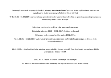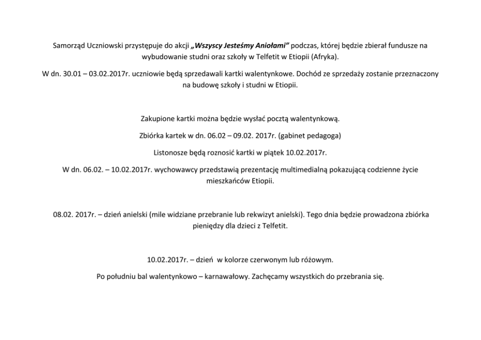 Samorząd Uczniowski przystępuje do akcji „Wszyscy Jesteśmy Aniołami” podczas, której będzie zbierał fundusze na wybudowanie studni oraz szkoły w Telfetit w Etiopii (Afryka). W dn. 30.01 – 03.02.2017r. uczniowie będą sprzedawali kartki walentynkowe. Dochód ze sprzedaży zostanie przeznaczony na budowę szkoły i studni w Etiopii. Zakupione kartki można będzie wysłać pocztą walentynkową. Zbiórka kartek w dn. 06.02 – 09.02. 2017r. (gabinet pedagoga) Listonosze będą roznosić kartki w piątek 10.02.2017r. W dn. 06.02. – 10.02.2017r. wychowawcy przedstawią prezentację multimedialną pokazującą codzienne życie mieszkańców Etiopii. 08.02. 2017r. – dzień anielski (mile widziane przebranie lub rekwizyt anielski). Tego dnia będzie prowadzona zbiórka pieniędzy dla dzieci z Telfetit. 10.02.2017r. – dzień w kolorze czerwonym lub różowym. Po południu bal walentynkowo – karnawałowy. Zachęcamy wszystkich do przebrania się.