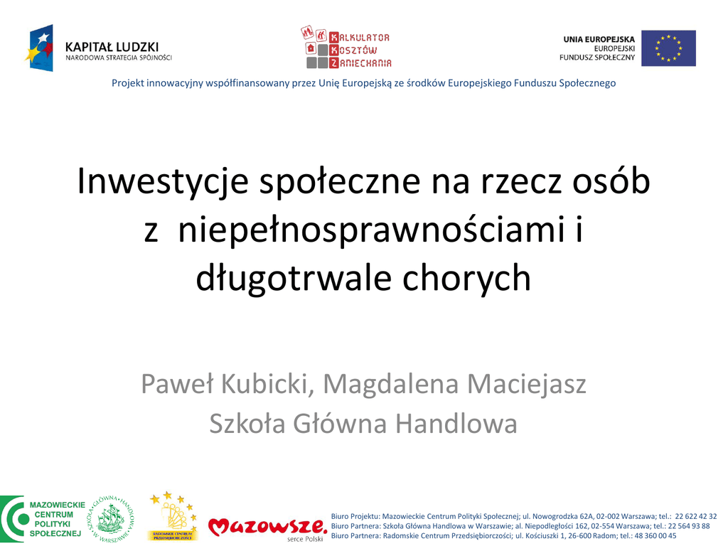 Projekt innowacyjny współfinansowany przez Unię Europejską ze środków Europejskiego Funduszu Społecznego Inwestycje społeczne na rzecz osób z niepełnosprawnościami i długotrwale chorych Paweł Kubicki, Magdalena Maciejasz Szkoła Główna Handlowa Biuro Projektu: Mazowieckie Centrum Polityki Społecznej; ul. Nowogrodzka 62A, 02-002 Warszawa; tel.: 22 622 42 32 Biuro Partnera: Szkoła Główna Handlowa w Warszawie; al. Niepodległości 162, 02-554 Warszawa; tel.: 22 564 93 88 Biuro Partnera: Radomskie Centrum Przedsiębiorczości; ul. Kościuszki 1, 26-600 Radom; tel.: 48 360 00 45 Projekt innowacyjny współfinansowany przez Unię Europejską ze środków Europejskiego Funduszu Społecznego Plan prezentacji • • • • • • • Inwestycje społeczne Kwestie definicyjne Analiza kosztów – różne podejścia Cele polityki publicznej Podejście zadaniowe – usługi jako inwestycje Przykłady inwestycji społecznych Podsumowanie Biuro Projektu: Mazowieckie Centrum Polityki Społecznej; ul. Nowogrodzka 62A, 02-002 Warszawa; tel.: 22 622 42 32 Biuro Partnera: Szkoła Główna Handlowa w Warszawie; al. Niepodległości 162, 02-554 Warszawa; tel.: 22 564 93 88 Biuro Partnera: Radomskie Centrum Przedsiębiorczości; ul. Kościuszki 1, 26-600 Radom; tel.: 48 360 00 45 Projekt innowacyjny współfinansowany przez Unię Europejską ze środków Europejskiego Funduszu Społecznego Wyzwania •Kryzys ekonomiczny: bezrobocie, ubóstwo, wykluczenie społeczne •Zmiany demograficzne: starzenie się społeczeństw •Bardziej wydajne i efektywne wydatkowanie środków publicznych •Wzmocnienie umiejętności ludzi i umożliwienie im pełnego uczestnictwa w życiu społecznym i aktywności zawodowej Rozwiązania •Koncentracja na zintegrowanych pakietach świadczeń i usług •Prewencja a nie interwencja Inwestycje społeczne •Inwestowanie w ludzi, wspieranie ich umiejętności, aktywności zawodowej i możliwości pełnego uczestnictwa życiu społecznym •Główne obszary inwestycji to edukacja, opieka nad dziećmi, opieka zdrowotna, szkolenia, pomoc w poszukiwaniu pracy i rehabilitacja http://ec.europa.eu/ Biuro Projektu: Mazowieckie Centrum Polityki Społecznej; ul. Nowogrodzka 62A, 02-002 Warszawa; tel.: 22 622 42 32 Biuro Partnera: Szkoła Główna Handlowa w Warszawie; al. Niepodległości 162, 02-554 Warszawa; tel.: 22 564 93 88 Biuro Partnera: Radomskie Centrum Przedsiębiorczości; ul. Kościuszki 1, 26-600 Radom; tel.: 48 360 00 45 Projekt innowacyjny współfinansowany przez Unię Europejską ze środków Europejskiego Funduszu Społecznego Kluczowe definicje • Osoby z niepełnosprawnościami mają długotrwale naruszoną sprawność fizyczną, umysłową, intelektualną lub w zakresie zmysłów co może, w oddziaływaniu z różnymi barierami, utrudniać im pełny i skuteczny udział w życiu społecznym, na zasadzie równości z innymi osobami (za: Konwencja ONZ). W praktyce osoby z prawnie orzeczoną niepełnosprawnością. • Osoby długotrwale lub ciężko chore to te, które z powodu wieku lub choroby i związanych z nimi trudnościami życiowymi wymagają pomocy innych osób, a są jej pozbawione. Biuro Projektu: Mazowieckie Centrum Polityki Społecznej; ul. Nowogrodzka 62A, 02-002 Warszawa; tel.: 22 622 42 32 Biuro Partnera: Szkoła Główna Handlowa w Warszawie; al. Niepodległości 162, 02-554 Warszawa; tel.: 22 564 93 88 Biuro Partnera: Radomskie Centrum Przedsiębiorczości; ul. Kościuszki 1, 26-600 Radom; tel.: 48 360 00 45 Projekt innowacyjny współfinansowany przez Unię Europejską ze środków Europejskiego Funduszu Społecznego Rodzaje kosztów Koszt leczenia i terapii Finansowanie dodatkowej opieki Koszty utraconych możliwości Koszty wg rodzaju Niefinansowe Skala mikro Finansowe Skala makro Koszt uzyskania diagnozy Koszty czasowe Koszty emocjonalne Olcoń-Kubicka M., Kubicki P., Analiza kosztów ponoszonych przez rodziców dzieci z orzeczoną niepełnosprawnością, Polityka Społeczna, Warszawa 2012 Biuro Projektu: Mazowieckie Centrum Polityki Społecznej; ul. Nowogrodzka 62A, 02-002 Warszawa; tel.: 22 622 42 32 Biuro Partnera: Szkoła Główna Handlowa w Warszawie; al. Niepodległości 162, 02-554 Warszawa; tel.: 22 564 93 88 Biuro Partnera: Radomskie Centrum Przedsiębiorczości; ul. Kościuszki 1, 26-600 Radom; tel.: 48 360 00 45 Projekt innowacyjny współfinansowany przez Unię Europejską ze środków Europejskiego Funduszu Społecznego Analiza kosztów – wydatki makro Indywidualne wydatki wydatki PFRON 6% na ochronę zdrowia osób niepełnosprawnych 10% subwencja oświatowa 4% orzecznictwo 0% 64,4 mld zł publiczne wydatki na ochronę zdrowia 29% świadczenia dla osób niepełnosprawnych 43% świadczenia dla opiekunów 8% dane za 2010 r., Piętka-Kosińska 2012: 59 Biuro Projektu: Mazowieckie Centrum Polityki Społecznej; ul. Nowogrodzka 62A, 02-002 Warszawa; tel.: 22 622 42 32 Biuro Partnera: Szkoła Główna Handlowa w Warszawie; al. Niepodległości 162, 02-554 Warszawa; tel.: 22 564 93 88 Biuro Partnera: Radomskie Centrum Przedsiębiorczości; ul. Kościuszki 1, 26-600 Radom; tel.: 48 360 00 45 Projekt innowacyjny współfinansowany przez Unię Europejską ze środków Europejskiego Funduszu Społecznego Analiza kosztów – wydatki makro Rodzaj kosztu Kwota (zł) świadczenia pielęgnacyjne 1,7 mld dodatki do świadczeń 255 mln zasiłki pielęgnacyjne 1,7 mld świadczenia rodzinne dla osób niepełnosprawnych 340 mln pomoc społeczna 3,5 mld PFRON - dopłaty do wynagrodzeń niepełnosprawnych pracowników 3 mld rehabilitacja społeczna i zawodowa 916 mln SUMA: 11,2 mld dane za 2013 r., MPiPS X mld zł (brak danych) • Koszty wydatków bezpośrednich plus koszty alternatywne Biuro Projektu: Mazowieckie Centrum Polityki Społecznej; ul. Nowogrodzka 62A, 02-002 Warszawa; tel.: 22 622 42 32 Biuro Partnera: Szkoła Główna Handlowa w Warszawie; al. Niepodległości 162, 02-554 Warszawa; tel.: 22 564 93 88 Biuro Partnera: Radoms