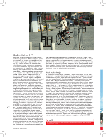 Merida Urban 7.7 94 Aluminiowa rama z rur kształtowanych w procesie mechanicznego tłoczenia TFS ma nietypową geometrię. Względem osi suportu pozycja rowerzysty jest silnie przesunięta do tyłu (kąt podsiodłowy wynosi tylko 68°). Siodło, ustawione na wysokości optymalnej dla efektywnego pedałowania, jest zarazem na tyle nisko nad ziemią, żeby siedząc na nim móc pewnie podeprzeć się nogą. Bardzo ważne w jeździe miejskiej, gdzie często jesteśmy zmuszani do zatrzymywania się. Z podobnym rozwiązaniem spotkaliśmy się już w zeszłym roku w Giancie Suede (patrz test w bB # 1/2006). Pozycja, jaką przyjmujemy na rowerze, jest wygodna, wyprostowana i dzięki szerokiej kierownicy, „otwarta”. Można ją dodatkowo modyfikować zgodnie z indywidualnymi preferencjami dzięki regulowanemu mostkowi. Wszystko to sprawia, że nie tylko spędzenie na rowerze 30 minut drogi do pracy, ale nawet 2-3 godzin, będzie bardzo przyjemne. Podczas jazdy praktycznie cały ciężar rowerzysty spoczywa na szerokim i wygodnym siodle, dodatkowo wspomaganym przez amortyzowaną sztyce. Z przodu komfort jazdy wspomaga amortyzator, którego praca stoi na przyzwoitym poziomie. Najlepiej radzi sobie z średniej wielkości nierównościami, ale „zauważa” też te niewielkie, np. takie jak kostka brukowa. Oczywiście ze względu na ograniczony skok najsłabiej radzi sobie z dużymi dziurami, ale nawet w ich przypadku lepiej że jest, bo przyjmuje na siebie część energii uderzenia. Merida Urban prowadzi się spokojnie i dostojnie, w czym duży udział ma szeroka na 630 mm mocno wygięta do tyłu, kierownica. 24-biegowy napęd zestawiony został praktycznie tylko z komponentów Shimano. To bardzo korzystnie wpłynęło na jakość jego pracy oraz wróży długą i bezproblemową eksploatację. Wyjątek stanowi przednia przerzutka produkcji Suntoura, ale do niej też nie mieliśmy zastrzeżeń. Zakres biegów, jak na rower tego typu przystało, jest bardzo szeroki pozwalający zarówno szybko poruszać się po prostej, jaki i zdobywać wzniesienia. Osobom o słabszej kondycji może brakować miękkich przełożeń. Szczególnie, że konsekwencją takiej, a nie innej geometrii ramy, jest to, że podjazdy trzeba pokonywać na siedząco, dlatego moim zdaniem przydałaby się kaseta z koronką bi k eBoar d #3 kwiecień 2007 34T. Wyposażenia Meridy dopełniają: zestaw dwóch hamulców v-brake „napędzanych” przed długie dźwignie z klamko-manetek Shimano oraz koła na niezbyt szerokich oponach CST z drogowym bieżnikiem. Do pełni wyposażenia brakuje tylko błotników. Są one szczególnie ważne w rowerze miejskim, na którym często poruszamy się w cywilnych ciuchach, dla których skutki nawet niewielkiej letniej burzy mogą być niedobre. Dobrze, że producent pomyślał o osłonie na tarczy suportu chroniącej nogawkę spodni przed łańcuchem. Jeżeli pracujemy do późna, koniecznie trzeba też zadbać o oświetlenie roweru. Rekapitulacja W naszym teście udział wzięły trzy rowery, z jednej strony bardzo zbliżone przeznaczeniem, z drugiej bardzo różniące się konstrukcyjnie. Każdy z nich ma swoje charakterystyczne cechy, które - zależnie od punktu widzenia - można rozpatrywać jako zalety albo wady. Wszystko zależy od ostatecznego użytkownika i jego potrzeb. Arkus Wigry to przedstawiciel rowerów z napędem jednobiegowym, nieskomplikowanych konstrukcyjnie i tanich. Do ich zalet należy prostota obsługi i duża odporność na zużycie eksploatacyjne. Niezależnie, czy zbudowane są na kołach 20 czy 28”, z ramą klasyczną czy typu holenderskiego, ich surowy wygląd pozbawiony drażniących oczy gadżetów też jest zaletą, czyniąc rower mniej atrakcyjnym w oczach złodzieja. Kelly’s Downtown to reprezentant grupy nowoczesnych city bików, w których do napędzania, wykorzystana została piasta z wewnętrzną zmianą biegów. Jest to najlepsze rozwiązanie napędu roweru miejskiego. Klasyczny napęd z dwoma przerzutkami, jakkolwiek daje zdecydowanie większy zakres przełożeń niż piasta, to wymaga z jednej strony pewnej wprawy w obsłudze, a z drugiej regularnej konserwacji. Dodatkowo w jeździe miejskiej zbyt duża ilość przełożeń stanowi raczej niepotrzebną komplikację niż pomoc. 3 lub 7 przełożeń, jakie oferują piasty montowane w rowerach miejskich, to zupełnie wystarczająca ilość biegów, a dodatkowo piasta raz ustawiona może działać bez żadnych regulacji nawet kilka lat. Merida Urban to przedstawiciel rowerów miejsko-rekreacyjnych, czyli takich, które prócz zastosowań czysto praktycznych jak dojazdy do pracy lub na uczelnię, mogą także pełnić rolę towarzysza wycieczek na łono natury. Ze względu na takie przeznaczenie rower ma 24 przełożenia i wyposażenie dobrane tak, aby uprzyjemnić także dłuższe dystanse pokonywane na siodełku, np. amortyzator przedni. Z jednej strony to plus, bo rozszerza zastosowanie roweru i podnosi komfort jazdy, jednak z drugiej zwiększa atrakcyjność roweru dla amatorów cudzej własności, dlatego jeżeli zdecydujesz się na Meridę, to koniecznie wyposaż się także w szczególnie porządne zapięcie, a najlepiej kilka! Na www.bikeboard.pl publikujemy zdjęcia detali testowanych rowerów oraz pełne specyfikacje poszczególnych modeli.