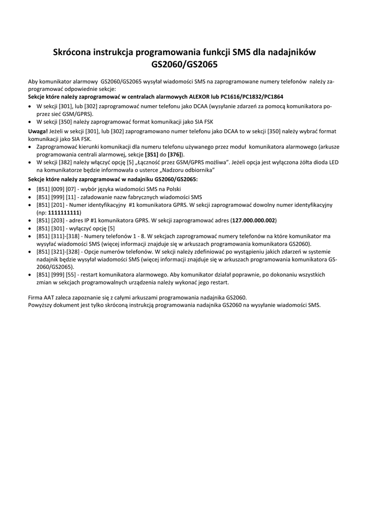 Skrócona instrukcja programowania funkcji SMS dla nadajników GS2060/GS2065 Aby komunikator alarmowy GS2060/GS2065 wysyłał wiadomości SMS na zaprogramowane numery telefonów należy zaprogramować odpowiednie sekcje: Sekcje które należy zaprogramować w centralach alarmowych ALEXOR lub PC1616/PC1832/PC1864 • W sekcji [301], lub [302] zaprogramować numer telefonu jako DCAA (wysyłanie zdarzeń za pomocą komunikatora poprzez sieć GSM/GPRS). • W sekcji [350] należy zaprogramować format komunikacji jako SIA FSK Uwaga! Jeżeli w sekcji [301], lub [302] zaprogramowano numer telefonu jako DCAA to w sekcji [350] należy wybrać format komunikacji jako SIA FSK. • Zaprogramować kierunki komunikacji dla numeru telefonu używanego przez moduł komunikatora alarmowego (arkusze programowania centrali alarmowej, sekcje [351] do [376]). • W sekcji [382] należy włączyć opcję [5] „Łączność przez GSM/GPRS możliwa”. Jeżeli opcja jest wyłączona żółta dioda LED na komunikatorze będzie informowała o usterce „Nadzoru odbiornika” Sekcje które należy zaprogramować w nadajniku GS2060/GS2065: • [851] [009] [07] - wybór języka wiadomości SMS na Polski • [851] [999] [11] - załadowanie nazw fabrycznych wiadomości SMS • [851] [201] - Numer identyfikacyjny #1 komunikatora GPRS. W sekcji zaprogramować dowolny numer identyfikacyjny (np: 1111111111) • [851] [203] - adres IP #1 komunikatora GPRS. W sekcji zaprogramować adres (127.000.000.002) • [851] [301] - wyłączyć opcję [5] • [851] [311]-[318] - Numery telefonów 1 - 8. W sekcjach zaprogramować numery telefonów na które komunikator ma wysyłać wiadomości SMS (więcej informacji znajduje się w arkuszach programowania komunikatora GS2060). • [851] [321]-[328] - Opcje numerów telefonów. W sekcji należy zdefiniować po wystąpieniu jakich zdarzeń w systemie nadajnik będzie wysyłał wiadomości SMS (więcej informacji znajduje się w arkuszach programowania komunikatora GS2060/GS2065). • [851] [999] [55] - restart komunikatora alarmowego. Aby komunikator działał poprawnie, po dokonaniu wszystkich zmian w sekcjach programowalnych urządzenia należy wykonać jego restart. Firma AAT zaleca zapoznanie się z całymi arkuszami programowania nadajnika GS2060. Powyższy dokument jest tylko skróconą instrukcją programowania nadajnika GS2060 na wysyłanie wiadomości SMS.
