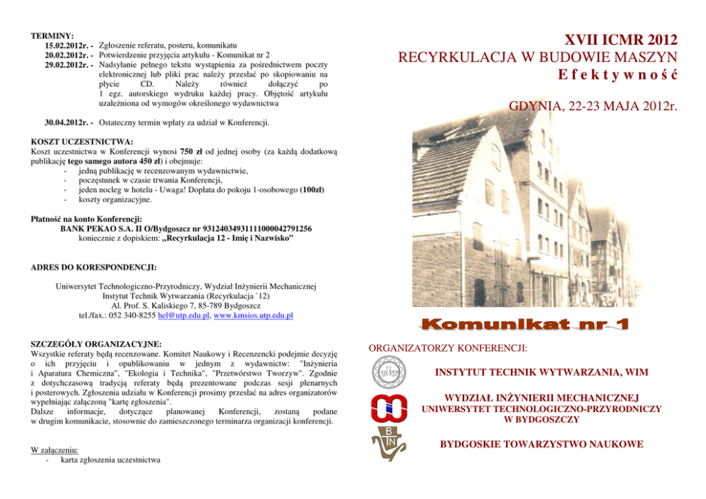 TERMINY: 15.02.2012r. - Zgłoszenie referatu, posteru, komunikatu 20.02.2012r. - Potwierdzenie przyjęcia artykułu - Komunikat nr 2 29.02.2012r. - Nadsyłanie pełnego tekstu wystąpienia za pośrednictwem poczty elektronicznej lub pliki prac należy przesłać po skopiowaniu na płycie CD. Należy również dołączyć po 1 egz. autorskiego wydruku każdej pracy. Objętość artykułu uzależniona od wymogów określonego wydawnictwa XVII ICMR 2012 RECYRKULACJA W BUDOWIE MASZYN Efektywność GDYNIA, 22-23 MAJA 2012r. 30.04.2012r. - Ostateczny termin wpłaty za udział w Konferencji. KOSZT UCZESTNICTWA: Koszt uczestnictwa w Konferencji wynosi 750 zł od jednej osoby (za każdą dodatkową publikację tego samego autora 450 zł) i obejmuje: - jedną publikację w recenzowanym wydawnictwie, - poczęstunek w czasie trwania Konferencji, - jeden nocleg w hotelu - Uwaga! Dopłata do pokoju 1-osobowego (100zł) - koszty organizacyjne. Płatność na konto Konferencji: BANK PEKAO S.A. II O/Bydgoszcz nr 93124034931111000042791256 koniecznie z dopiskiem: „Recyrkulacja 12 - Imię i Nazwisko” ADRES DO KORESPONDENCJI: Uniwersytet Technologiczno-Przyrodniczy, Wydział Inżynierii Mechanicznej Instytut Technik Wytwarzania (Recyrkulacja `12) Al. Prof. S. Kaliskiego 7, 85-789 Bydgoszcz tel./fax.: 052 340-8255 [email protected], www.kmsios.utp.edu.pl SZCZEGÓŁY ORGANIZACYJNE: Wszystkie referaty będą recenzowane. Komitet Naukowy i Recenzencki podejmie decyzję o ich przyjęciu i opublikowaniu w jednym z wydawnictw: "Inżynieria i Aparatura Chemiczna", "Ekologia i Technika", "Przetwórstwo Tworzyw". Zgodnie z dotychczasową tradycją referaty będą prezentowane podczas sesji plenarnych i posterowych. Zgłoszenia udziału w Konferencji prosimy przesłać na adres organizatorów wypełniając załączoną "kartę zgłoszenia". Dalsze informacje, dotyczące planowanej Konferencji, zostaną podane w drugim komunikacie, stosownie do zamieszczonego terminarza organizacji konferencji. W załączeniu: - karta zgłoszenia uczestnictwa ORGANIZATORZY KONFERENCJI: INSTYTUT TECHNIK WYTWARZANIA, WIM WYDZIAŁ INŻYNIERII MECHANICZNEJ UNIWERSYTET TECHNOLOGICZNO-PRZYRODNICZY W BYDGOSZCZY BYDGOSKIE TOWARZYSTWO NAUKOWE Szanowni Państwo! Mamy zaszczyt zaprosić do uczestnictwa w XVII Konferencji Naukowo-Technicznej - Recyrkulacja w Budowie Maszyn, „EFEKTYWNOŚĆ”, która odbędzie się w dniach 22-23 maja 2012 roku w Gdyni. Pragniemy podkreślić, że Konferencja jest organizowana od 1991 roku. Podstawowym założeniem przyjętym przez organizatorów Konferencji jest kontynuacja dotychczasowych działań, wymiana doświadczeń, a także dalsza integracja środowiska specjalistów nauki i przemysłu, związanych z efektywnością recyrkulacji oraz recyklingu. Treść i poziom naukowy Konferencji będą kształtowane poprzez udział Państwa w obradach. Przekonanie to jest zobowiązaniem dla zapewnienia Państwu interesującego programu merytorycznego podczas pobytu w Gdyni. Z pozdrowieniem od organizatorów Prof. dr hab. inż. Józef Flizikowski HONOROWY PATRONAT ORGANIZOWANEJ KONFERENCJI: Prof. dr hab. inż. Antoni Bukaluk J.M. Rektor Uniwersytetu Technologiczno-Przyrodniczego w Bydgoszczy KOMITET NAUKOWY, RECENZENCKI I PROGRAMOWY: Prof. Józef Flizikowski - Przew., WIM, UTP w Bydgoszczy, Wiceprezes BTN Prof. Marek Bieliński, WIM, Prorektor UTP w Bydgoszczy; Prezes BTN Prof. Bogdan Żółtowski - Dziekan WIM, UTP w Bydgoszczy Prof. Michał Styp-Rekowski, Prodziekan WIM, UTP w Bydgoszczy Prof. Henryk Wrembel, Honorowy Prezes BTN Prof. Michael Gehde, TU Chemnitz, Niemcy Prof. Zbigniew Kikiewicz, WIM, UTP w Bydgoszczy Prof. Zbigniew Kłos, WMRiT, PP, Poznań Prof. Marek Kozłowski, IIOŚ, PWr, Wrocław Prof. Józef Krzyżanowski, WM, PWr, Wrocław Prof. Jarosław Diakun, WM, Politechnika Koszalińska Prof. Günter Mennig, Honorar Prof, TU Chemnitz, Niemcy Prof. Hans-Joachim Schmid, Uniwersytet Paderborn, Niemcy Prof. Manfred Pahl, Paderborn, Niemcy Prof. Jan Sidor, WIMiR, AGH w Krakowie Prof. Robert Sikora, WM, PL, Lublin Prof. Tomasz Sterzyński, WBM PP, Poznań Prof. Tomasz Tyralski, WM, PŁ, Łódź Prof. Jan Wojciechowski, WM, PWr, Wrocław Prof. Joachim Zimniak, WIM, UTP w Bydgoszczy Dr inż. Adam Mroziński, WIM, UTP w Bydgoszczy Dr inż. Marek Macko, WMFiT, UKW w Bydgoszczy Dr inż. Tomasz Rydzkowski, WM, Politechnika Koszalińska Dr inż. Piotr Muzyczuk, Centrum Onkologii, Bydgoszcz KOMITET ORGANIZACYJNY: Prof. Józef Flizikowski - Przewodniczący, WIM, UTP w Bydgoszczy Doc. dr inż. Franciszek Bromberek, Prodziekan WIM, UTP w Bydgoszczy Dr inż. Adam Mroziński, WIM, UTP w Bydgoszczy Dr inż. Andrzej Tomporowski, WIM, UTP w Bydgoszczy Mgr inż. Helena Ciara - sekretariat Koło Naukowe Studentów TopGran ZAGADNIENIA: 1. Systemy i środowisko techniczne - potencjały i efektywność działania 2. Sprawność, podatność, użyteczność, emisje CO2, recykling energetyczny 3. Innowacje i inżynieria surowców, tworzyw, materiałów oraz regeneracji 4. Badania i rozwój recyklingu, recyrkulacji, produktu w ekotechnologii maszyn 5. Monitorowanie technologii 6. Forum Młodych Recyklerów - Doktoranci i Koła Naukowe Zapraszamy Sponsorów i Wystawców! Kontakt: Sekretariat Konferencji - tel./fax 52-3408255; E-mail: [email protected] WYSTAWA: Recykling stosowany, efektywny, bezpieczny, zrównoważony i użyteczny TERMIN I MIEJSCE KONFERENCJI: 22-23 maja 2012 roku, Hotel Orbis Gdynia - ul. Armii Krajowej 22, Gdynia