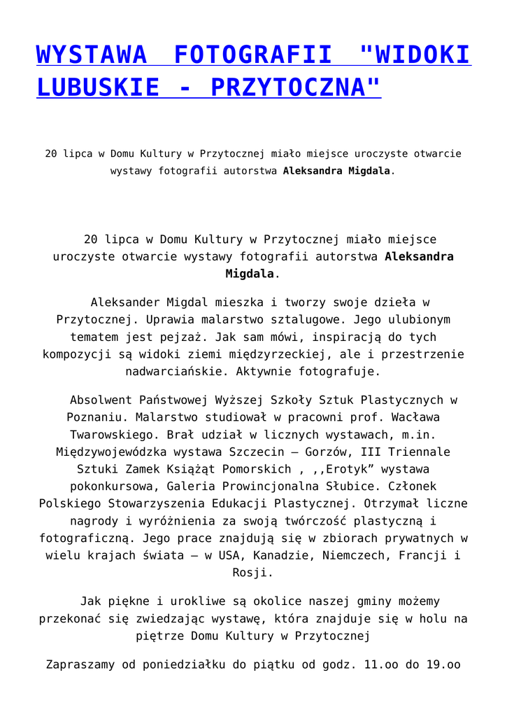 WYSTAWA FOTOGRAFII "WIDOKI LUBUSKIE - PRZYTOCZNA" 20 lipca w Domu Kultury w Przytocznej miało miejsce uroczyste otwarcie wystawy fotografii autorstwa Aleksandra Migdala. 20 lipca w Domu Kultury w Przytocznej miało miejsce uroczyste otwarcie wystawy fotografii autorstwa Aleksandra Migdala. Aleksander Migdal mieszka i tworzy swoje dzieła w Przytocznej. Uprawia malarstwo sztalugowe. Jego ulubionym tematem jest pejzaż. Jak sam mówi, inspiracją do tych kompozycji są widoki ziemi międzyrzeckiej, ale i przestrzenie nadwarciańskie. Aktywnie fotografuje. Absolwent Państwowej Wyższej Szkoły Sztuk Plastycznych w Poznaniu. Malarstwo studiował w pracowni prof. Wacława Twarowskiego. Brał udział w licznych wystawach, m.in. Międzywojewódzka wystawa Szczecin – Gorzów, III Triennale Sztuki Zamek Książąt Pomorskich , ,,Erotyk” wystawa pokonkursowa, Galeria Prowincjonalna Słubice. Członek Polskiego Stowarzyszenia Edukacji Plastycznej. Otrzymał liczne nagrody i wyróżnienia za swoją twórczość plastyczną i fotograficzną. Jego prace znajdują się w zbiorach prywatnych w wielu krajach świata – w USA, Kanadzie, Niemczech, Francji i Rosji. Jak piękne i urokliwe są okolice naszej gminy możemy przekonać się zwiedzając wystawę, która znajduje się w holu na piętrze Domu Kultury w Przytocznej Zapraszamy od poniedziałku do piątku od godz. 11.oo do 19.oo Wystawa czynna będzie do końca września. th_img_9724 th_img_9726 th_img_9728 th_img_9730 th_img_9732 th_img_9736 th_img_9737 th_img_9741 th_img_9744 th_img_9745 th_img_9747 th_img_9748 th_img_9750 th_img_9752 th_img_9761 th_img_9764