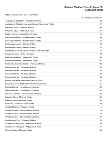 Krajowa Wystawa Psów 5. Grupy FCI Opole, 22.04.2016 Wykaz wystawców / List of exhibitors Nr katalogowy / Catalog No. Andrzejczak Sebastian - Warszawa, Polska 92 Andrzejczak Sebastian Anna Jaśkiewicz- Warszawa, Polska 87 Balowska Edyta - Oleśnica, Polska 149 Balowska Edyta - Oleśnica, Polska 151 Balsam Iwona - Łaziska Górne, Polska 12 Bancarzewski Piotr - Biala Podlaska, Polska 59 Bancarzewski Piotr - Biala Podlaska, Polska 64 Bednarczyk Jagoda - Gliwice, Polska 39 Bednarczyk Jagoda - Gliwice, Polska 31 Boegeberg Maria Alexander Klaeboe- Oslo, Norwegia 73 Boegeberg Maria - Oslo, Norwegia 72 Bolshakova Natalia - Kaliningrad, Rosja 138 Bolshakova Natalia - Kaliningrad, Rosja 141 Borkowska-Grochala Bożena - Kałęczyn, Polska 139 Borowiec Blanka - Warszawa, Polska 46 Borowiec Blanka - Warszawa, Polska 28 Borowiec Blanka - Warszawa, Polska 27 Borowiec Blanka - Warszawa, Polska 33 Bradac Jan - Bystrice Pod Hostynem, Czechy 121 Bradacova Jana - Bystrice Pod Hostynem, Czechy 115 Buciova Blanka - Horna Zdana, Słowacja 128 Buciova Blanka - Horna Zdana, Słowacja 132 Bukowski Szymon - Dziećmorowice, Polska 20 Bulygina Elena - Moscow, Rosja 123 Bulygina Elena - Moscow, Rosja 124 Bychawski Jarosław - Kępa, Polska 35 Chade Marianna - Wrocław, Polska 4 Chade Zuzanna - Stronie Śląskie, Polska 18 Chade Zuzanna - Stronie Śląskie, Polska 9 Chade Zuzanna - Stronie Śląskie, Polska 24 Chodorowski Piotr - Tułowice, Polska 29 Czarkowska Katarzyna - Wiązowna, Polska 110 Czarkowska Katarzyna - Wiązowna, Polska 114 Esina Svetlana - Moskwa, Rosja 108 Esina Svetlana - Moskwa, Rosja Falgreen Barrett Louise - Sulsted, Dania Fijałkowska Janina - Smolec, Polska 105 51 126 Filip Łukasz - Czarny Bór, Polska 23 Gacek Bożena - Jelenia Góra, Polska 60 Gajewski Maciej - Kobyłka, Polska 107 Gajewski Maciej - Kobyłka, Polska 101 Goyrinberg Victoria - Moscow, Rosja 81 Goyrinberg Victoria - Moscow, Rosja 162 Goyrinberg Victoria - Moscow, Rosja 84 Grossek Beata - Oława, Polska 74 Gudmoniene Ingrida - Kelme, Litwa 120 Gudmoniene Ingrida - Kelme, Litwa 112 Gudmoniene Ingrida - Kelme, Litwa 118 Haratym Adam Sylwia Gabryś- Wołów, Polska 21 Haratym Adam Sylwia Gabryś- Wołów, Polska 17 Haratym Adam Sylwia Gabryś- Wołów, Polska 3 Hellmund Michaela Ute Schoernig & Frank Sweeny- Halle / Saale, Niemcy 82 Hellmund Michaela Ute Schoernig, Frank Sweeny- Halle / Saale, Niemcy 79 Hynkova Jana - Jaromer, Czechy 52 Hynkova Jana - Jaromer, Czechy 50 Isaksson Ida Marina Isaksson- Elimaki, Finlandia 67 Isaksson Ida Marina Isaksson- Elimaki, Finlandia 68 Isaksson Ida Marina Isaksson- Elimaki, Finlandia 69 Isaksson Ida Marina Isaksson- Elimaki, Finlandia 70 Jabkowska Katarzyna - Poznań, Polska 155 Jansova Jana - Velka Jesenice, Czechy 45 Jarząbek Tina - Łódź, Polska 37 Jarząbek Tina - Łódź, Polska 154 Jarzębska Agata - Piaseczno, Polska 54 Jezierska Marzena - Smolec, Polska 148 Kalika Katarzyna - Legnica, Polska 13 Kasparova Iveta - Cestlice, Czechy 131 Khokhlovskaya Olga - Moscow, Rosja 83 Kocur Aleksandra - Czechowice-Dziedzice, Polska 43 Kostande Irina - Pavlovsky Posad, Rosja 80 Kowalski Mieczysław - Rudniki, Polska 133 Krawczyk Sebastian - Częstochowa, Polska 36 Krawczyk Sebastian Edyta Krawczyk- Częstochowa, Polska 30 Krzykowska Renata - Jasna Góra, Polska 6 Kulig Anna - Kraków, Polska 90 Kurowski Jarosław - Kraków, Polska 85 Kussa Beata - Bojszowy, Polska 136 Kuźnicka Renata - Konstantynów Łódzki, Polska 147 Lechman Katarzyna - Lubawka, Polska 2 Leutner Sebastian - Goszczowice, Polska 40 Leutner Sebastian - Goszczowice, Polska 44 Lipska Iwona - Żerniki Małe, Polska 152 Lipska Iwona - Żerniki Małe, Polska 150 Luxova Marcela - Kraliky, Czechy 88 Luxova Marcela - Kraliky, Czechy 95 Macha Waldemar - Gogolin, Polska 26 Machniak-Pisarska Anna - Łódź, Polska Machura Wioletta - Biała, Polska 103 11 Maciejewska Małgorzata - Kraków, Polska 109 Maciejewska Małgorzata Joanna Łukaszuk- Kraków, Polska 122 Maciuszek Jakub - Bochnia, Polska 99 Małasiewicz Katarzyna - Lublin, Polska 134 Małasiewicz Katarzyna - Lublin, Polska 146 Maras Adam - Krzywiczyny, Polska 78 Maras Adam - Krzywiczyny, Polska 76 Michaliszyn Jakub - Kędzierzyn-Koźle, Polska 98 Miliauskiene Elena - Krakiai, Mazeikiu Rajonas, Litwa 61 Miliauskiene Elena - Krakiai, Mazeikiu Rajonas, Litwa 63 Mokrzycki Arkadiusz - Krzeszów, Polska 5 Müller Dorota - Łódź, Polska 56 Müller Dorota - Łódź, Polska 57 Müller Dorota - Łódź, Polska 53 Orłowska Aleksandra - Szczecin, Polska 10 Pastusiak Ewelina - Oleśnica, Polska 137 Pastusiak Ewelina - Oleśnica, Polska 143 Pastusiak Marzena - Dobroszyce, Polska 144 Pawlicka Elżbieta - Wrocław, Polska 130 Piekarczyk Małgorzata - Marki, Polska 106 Piekarczyk Małgorzata - Marki, Polska 100 Piskorz Marzena - Kraków, Polska 93 Poliński Przemysław - Jelenia Góra, Polska 66 Rakoczy Andrzej Aneta Rakoczy- Załuski, Polska 161 Rakoczy Andrzej Aneta Rakoczy- Załuski, Polska 157 Rapaliene Laura - Kaunas, Litwa 47 Rapaliene Laura - Kaunas, Litwa 32 Reiter Tomasz - Wrocław, Polska 102 Reiter Tomasz Żanetta Reiter- Wrocław, Polska 104 Romulewicz Kornelia - Janów, Polska 71 Rybicki Dariusz - Koźmin Wlkp., Polska 38 Samaszko Sławomir - Zagrodno, Polska 34 Sawkiewicz Katarzyna, Piotr - Kędzierzyn-Koźle, Polska 117 Siejak Olga - Poznań, Polska 15 Siejak Olga - Poznań, Polska 8 Siejak Olga - Poznań, Polska 22 Siejak Olga - Poznań, Polska 16 Smirnova Marina Alexandrovich Olga- Yaroslavl, Rosja 156 Smirnova Marina Alexandrovich Olga- Yaroslavl, Rosja 159 Stec Paulina - Biłgoraj, Polska 89 Szwed Marcin - Aleksandria Druga, Polska 41 Talaga Jolanta - Stronie Śląskie, Polska 19 Talaga Jolanta - Stronie Śląskie, Polska 14 Talaga Jolanta - Stronie Śląskie, Polska 1 Talaga Jolanta - Stronie Śląskie, Polska 7 Teluk Jarosław - Sokołów Podlaski, Polska 96 Teluk Jarosław - Sokołów Podlaski, Polska 94 Tkaczyk Mirosław - Sosnowiec, Polska 65 Tkaczyk Mirosław - Sosnowiec, Pol