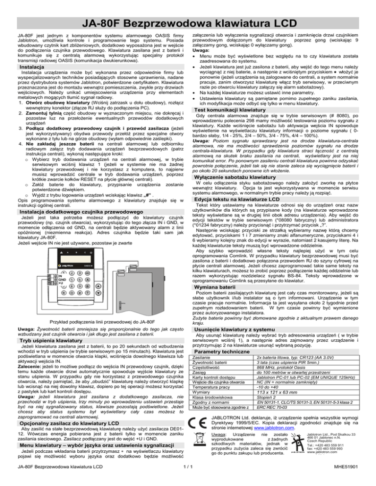 JA-80F Bezprzewodowa klawiatura LCD JA-80F jest jednym z komponentów systemu alarmowego OASIS firmy Jablotron, umożliwia kontrole i programowanie tego systemu. Posiada wbudowany czytnik kart zbliżeniowych, dodatkowo wyposażona jest w wejście do podłączenia czujnika przewodowego. Klawiatura zasilana jest z baterii i komunikuje się z centralą alarmową wykorzystując specjalny protokół transmisji radiowej OASIS (komunikacja dwukierunkowa). Instalacja Instalacja urządzenia może być wykonana przez odpowiednie firmy lub wyspecjalizowanych techników posiadających stosowne uprawnienia, nadane przez dystrybutora systemów Jablotron, potwierdzone certyfikatem. Klawiatura przeznaczona jest do montażu wewnątrz pomieszczenia, zwykle przy drzwiach wejściowych. Należy unikać umiejscowienia urządzenia przy elementach metalowych mogących tłumić sygnał radiowy. 1. Otwórz obudowę klawiatury (Wciśnij zatrzask u dołu obudowy), rozłącz wewnętrzny konektor (złącze RJ służy do podłączenia PC). 2. Zamontuj tylnią część obudowy w wyznaczonym miejscu, nie dokręcaj i pozostaw luz na przełożenie ewentualnych przewodów dodatkowych urządzeń 3. Podłącz dodatkowy przewodowy czujnik i przewód zasilacza (jeżeli jest wykorzystywany) obydwa przewody przełóż przez specjalne otwory wykonane z tyłu lub na górze obudowy (wyłam odpowiednie zaślepki). 4. Nie zakładaj jeszcze baterii na centrali alarmowej lub odbiorniku radiowym załącz tryb dodawania urządzeń bezprzewodowych (patrz instrukcja centrali), wykonaj następujące kroki: o Wybierz tryb dodawania urządzeń na centrali alarmowej, w trybie serwisowym wciśnij klawisz 1 (jeżeli w systemie nie ma żadnej klawiatury przewodowej i nie korzystasz z komputera, to najpierw musisz wprowadzić centrale w tryb dodawania urządzeń, poprzez krótkie zwarcie kołków RESET na płycie głównej centrali). o Załóż baterie do klawiatury, przypisanie urządzenia zostanie potwierdzone dźwiękiem. o Wyjdź z trybu logowania urządzeń wciskając klawisz „#” . Opis programowania systemu alarmowego z klawiatury znajduje się w instrukcji ogólnej centrali. Instalacja dodatkowego czujnika przewodowego Jeżeli jest taka potrzeba możesz podłączyć do klawiatury czujnik przewodowy (np. czujnik otwarcia), wykorzystując do tego złącza IN i GND, w momencie odłączenia od GND, na centrali będzie aktywowany alarm z linii opóźnionej (niezmienna reakcja). Adres czujnika będzie taki sam jak klawiatury JA-80F. Jeżeli wejście IN nie jest używane, pozostaw je zwarte A B C OASIS 80 ABC IN GND +U A załączenia lub wyłączenia sygnalizacji otwarcia i zamknięcia drzwi czujnikiem przewodowym dołączonym do klawiatury poprzez gong (wciskając 9 załączamy gong, wciskając 0 wyłączamy gong). Uwaga: • Menu może być wyświetlone bez względu na to czy klawiatura została zaadresowana do systemu. • Jeżeli klawiatura jest już zasilona z baterii, aby wejść do tego menu należy wyciągnąć z niej baterie, a następnie z wciśniętym przyciskiem ∗ włożyć je ponownie (jeżeli urządzenia są zalogowane do centrali, a system normalnie pracuje, zanim otworzysz klawiaturę włącz tryb serwisowy, w przeciwnym razie po otwarciu klawiatury załączy się alarm sabotażowy). • Na każdej klawiaturze możesz ustawić inne parametry. • Ustawienia klawiatury są pamiętane pomimo zupełnego zaniku zasilania, ich modyfikacja może odbyć się tylko w menu klawiatury. Test komunikacji klawiatury Gdy centrala alarmowa znajduje się w trybie serwisowym (# 8080), po wprowadzeniu polecenia 298 mamy możliwość testowania poziomu sygnału z klawiatury. Każde wciśnięcie sabotażu lub aktywacja wejścia IN spowoduje wyświetlenie na wyświetlaczu klawiatury informacji o poziome sygnału ( 0bardzo słaby, 1/4 - 25%, 2/4 – 50%, 3/4 - 75%, 4/4 – 100%). Uwaga: Poziom sygnału sprawdzany jest na drodze klawiatura-centrala alarmowa, nie ma możliwości sprawdzenia poziomów sygnału na drodze centrala-klawiatura. W przypadku gdy klawiatura straci łączność z centralą alarmową na skutek braku zasilania na centrali, wyświetlany jest na niej komunikat error. Po ponownym zasileniu centrali klawiatura powinna odzyskać powrotnie połączenie, jeżeli tak się nie stanie zaleca się wyciągnięcie baterii i po około 20 sekundach ponowne ich włożenie. Wyłączenie sabotażu klawiatury W celu odłączenia styku sabotażowego należy założyć zworkę na płytce wewnątrz klawiatury. Opcja ta jest wykorzystywana w momencie serwisu systemu alarmowego, w normalnym trybie pracy należy ją rozpiąć. Edycja tekstu na klawiaturze LCD Tekst który ustawiamy na klawiaturze odnosi się do urządzeń oraz nazw użytkowników dla których są przypisane kody (na klawiaturze wprowadzone teksty wyświetlane są w drugiej linii obok adresu urządzenia). Aby wejść do edycji tekstów w trybie serwisowym (*08080 fabryczny) lub administratora (*01234 fabryczny) należy przycisnąć i przytrzymać przycisk „?”. Następnie wciskając przyciski ze strzałką wybieramy nazwę którą chcemy edytować, przyciskami 1 i 7 zmieniamy znaki alfanumeryczne, przyciskami 4 i 6 wybieramy kolejny znak do edycji w wyrazie, natomiast 2 kasujemy literę. Na każdej klawiaturze teksty muszą być wprowadzone oddzielnie. Aby szybko wprowadzić własne teksty najlepiej użyć w tym celu oprogramowania Comlink. W przypadku klawiatury bezprzewodowej musi być zasilona z baterii i dodatkowo połączona przewodem RJ do szyny cyfrowej na płycie centrali alarmowej. Jeżeli chcesz zaprogramować takie same teksty na kilku klawiaturach, możesz to zrobić poprzez podłączenie każdej oddzielnie lub razem wykorzystując rozdzielacz sygnału BS-84. Teksty wprowadzone w oprogramowaniu Comlink są przesyłane do klawiatur. Wymiana baterii B Poziom baterii zasilających klawiaturę jest cały czas monitorowany, jeżeli są słabe użytkownik i/lub instalator są 