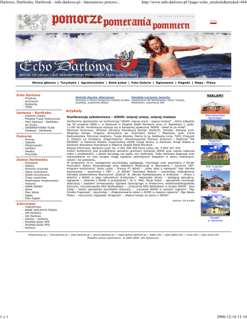 Darlowo, Darlówko, Darlówek - info.darlowo.pl - Internetowy przewo... http://www.info.darlowo.pl/?page=echo_artykuly&artykul=404 Strona główna | Turystyka | Agroturystyka | Bank pokoi | Foto Galeria | Ogloszenia | Pogoda | Mapy - Plany Echo Darłowa Artykuły Archiwum Redakcja TPZD Darłowo - Darłówko Historia miasta Miejska Trasa Historyczna Plan Darłowa - Darłówka do druku INTERAKTYWNY PLAN Darłowa - Darłówka Pomorze Portret Zabytki Miejscowości Herbarz Władcy Przyroda Ziemia Darłowska PołoŜenie Walory Pomniki przyrody Głazy narzutowe Szlaki turystyczne Trasy rowerowe WaŜniejsze miejscowości Historia MAPA GMINY Wicie Plan Wicia Dąbki Plan Dąbek Metoda Davisa, Warszawa REKLAMY Ośrodek Leczenia Janochy Pierwsza w Polsce skuteczna metoda korekty UzaleŜnienie Od Narkotyków, Detox Terapia, dysleksji, znakomite efekty Alkoholizm, Lekomania 24h Artykuły Konferencja szkoleniowa - ADHD: więcej wiesz, więcej moŜesz Serdecznie zapraszamy na konferencję "ADHD: więcej wiesz - więcej moŜesz" , która odbędzie się 30 września 2006 r. w Darłowie w Zespole Szkół Morskich, przy ul. Szpitalnej 1, godz. 11:00-16:00. Konferencja wpisuje się w kampanię społeczną "ADHD - świat to za mało!". Patronat honorowy: Minister Edukacji Narodowej Roman Giertych, Minister Zdrowia prof. Zbigniew Religa, Krajowy Konsultant ds. Psychiatrii Dzieci i MłodzieŜy prof. Irena Namysłowska. Patronat medialny: Twoje dziecko, Mamo to ja, Niebieska Linia, TVP2, Program 2, Pytanie na śniadanie. Organizatorzy: Stowarzyszenie Pomocy Dzieciom i Rodzinie "NA DZISIAJ" w Darłowie Polskie Towarzystwo ADHD Urząd Gminy w Darłowie Urząd Miasta w Darłowie Starostwo Powiatowe w Sławnie Zespół Szkół Morskich Więcej informacji: Barbara Liput, tel. 0 502 490 406 Ilona Lelito, tel. 0 693 357 434 Celem konferencji jest przybliŜenie szerokim gremiom tematyki ADHD oraz metod radzenia sobie z problemami, z jakimi borykają się osoby nim dotknięte. Tylko fachowa diagnoza oraz wprowadzona na czas terapia mogą zapobiec późniejszym kłopotom w domu rodzinnym, szkole i na podwórku. W programie m.in. wystąpienia psychologa, pedagoga, neurologa oraz psychiatry z Kliniki Psychiatrii Wieku Rozwojowego przy Akademii Medycznej w Warszawie i Centrum CBT. Program konferencji: Ilona Letito – Prezes PT ADHD – „Kilka słów o kampanii” Mgr Monika Szaniewska – psycholog z CBT – „O ADHD” Stanisław Bobula – psycholog, Niepubliczny Ośrodek Doskonalenia Nauczycieli „Sophia” dr Jakuba Kołodziejczyka w Krakowie – „Praca z dziećmi z ADHD w jego naturalnym środowisku”. Agnieszka Janiec – pedagog specjalny, logopeda – „Dziecko z ADHD w przedszkolu”. Dr n. Med. Alicja Kubik – specjalista neurologii dziecięcej i pediatrii Uniwersytetu Szpitala Dziecięcego w Prokocimiu elektroenefalografista kliniczny, neuroterapełta EEG Biofeedback – „Znaczenie EEG Biofeeback w terapii ADHD”. Ewa OŜóg – lekarz specjalista psychiatra dziecięcy – „Leczenie ADHD w naszym regionie”. Mgr Dorota Frąszczak – psycholog – „Diagnozowanie dzieci z ADHD w naszym regionie”. Mgr Beata Piwko – nauczyciel, logopeda, terapeuta – „Wpływ terapii na dzieci z ADHD”. Nieruchomości "BUDYNEK" "Argentyt" w Dąbkach OW "Czarski" w Wiciu "Ola" w Darłowie Darłowo, ED 8/2006 Informator TURYSTYKA BANK WOLNYCH POKOI UM Darłowo UG Darłowo Adresy - telefony Rozkład jazdy PKP Rozkład jazdy PKS Kamery "Osada" w Darłowie infopomorze.pl | info.darlowo.pl | plan.darlowo.pl | gmina.darlowo.pl | mapa.gmina.darlowo.pl | dabki.info | plan.dabki.info | wicie.info | plan.wicie.info Wszelkie prawa zastrzezone. © 2005-2006 info.darlowo.pl . 1z1 2006-12-16 11:14
