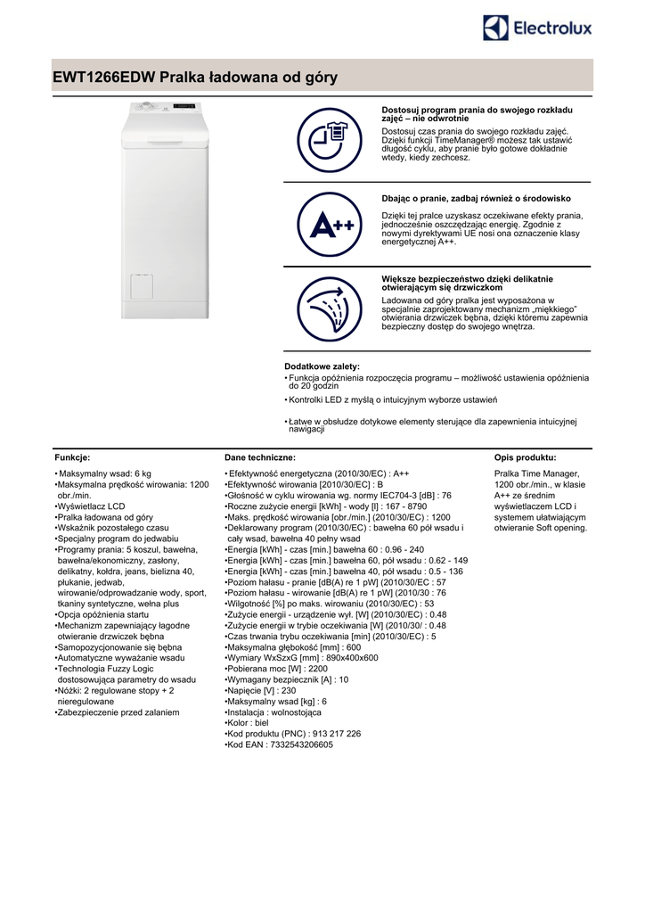 EWT1266EDW Pralka ładowana od góry Dostosuj program prania do swojego rozkładu zajęć – nie odwrotnie Dostosuj czas prania do swojego rozkładu zajęć. Dzięki funkcji TimeManager® możesz tak ustawić długość cyklu, aby pranie było gotowe dokładnie wtedy, kiedy zechcesz. Dbając o pranie, zadbaj również o środowisko Dzięki tej pralce uzyskasz oczekiwane efekty prania, jednocześnie oszczędzając energię. Zgodnie z nowymi dyrektywami UE nosi ona oznaczenie klasy energetycznej A++. Większe bezpieczeństwo dzięki delikatnie otwierającym się drzwiczkom Ladowana od góry pralka jest wyposażona w specjalnie zaprojektowany mechanizm „miękkiego” otwierania drzwiczek bębna, dzięki któremu zapewnia bezpieczny dostęp do swojego wnętrza. Dodatkowe zalety: • Funkcja opóźnienia rozpoczęcia programu – możliwość ustawienia opóźnienia do 20 godzin • Kontrolki LED z myślą o intuicyjnym wyborze ustawień • Łatwe w obsłudze dotykowe elementy sterujące dla zapewnienia intuicyjnej nawigacji Funkcje: Dane techniczne: Opis produktu: • Maksymalny wsad: 6 kg •Maksymalna prędkość wirowania: 1200 obr./min. •Wyświetlacz LCD •Pralka ładowana od góry •Wskaźnik pozostałego czasu •Specjalny program do jedwabiu •Programy prania: 5 koszul, bawełna, bawełna/ekonomiczny, zasłony, delikatny, kołdra, jeans, bielizna 40, płukanie, jedwab, wirowanie/odprowadzanie wody, sport, tkaniny syntetyczne, wełna plus •Opcja opóźnienia startu •Mechanizm zapewniający łagodne otwieranie drzwiczek bębna •Samopozycjonowanie się bębna •Automatyczne wyważanie wsadu •Technologia Fuzzy Logic dostosowująca parametry do wsadu •Nóżki: 2 regulowane stopy + 2 nieregulowane •Zabezpieczenie przed zalaniem • Efektywność energetyczna (2010/30/EC) : A++ •Efektywność wirowania [2010/30/EC] : B •Głośność w cyklu wirowania wg. normy IEC704-3 [dB] : 76 •Roczne zużycie energii [kWh] - wody [l] : 167 - 8790 •Maks. prędkość wirowania [obr./min.] (2010/30/EC) : 1200 •Deklarowany program (2010/30/EC) : bawełna 60 pół wsadu i cały wsad, bawełna 40 pełny wsad •Energia [kWh] - czas [min.] bawełna 60 : 0.96 - 240 •Energia [kWh] - czas [min.] bawełna 60, pół wsadu : 0.62 - 149 •Energia [kWh] - czas [min.] bawełna 40, pół wsadu : 0.5 - 136 •Poziom hałasu - pranie [dB(A) re 1 pW] (2010/30/EC : 57 •Poziom hałasu - wirowanie [dB(A) re 1 pW] (2010/30 : 76 •Wilgotność [%] po maks. wirowaniu (2010/30/EC) : 53 •Zużycie energii - urządzenie wył. [W] (2010/30/EC) : 0.48 •Zużycie energii w trybie oczekiwania [W] (2010/30/ : 0.48 •Czas trwania trybu oczekiwania [min] (2010/30/EC) : 5 •Maksymalna głębokość [mm] : 600 •Wymiary WxSzxG [mm] : 890x400x600 •Pobierana moc [W] : 2200 •Wymagany bezpiecznik [A] : 10 •Napięcie [V] : 230 •Maksymalny wsad [kg] : 6 •Instalacja : wolnostojąca •Kolor : biel •Kod produktu (PNC) : 913 217 226 •Kod EAN : 7332543206605 Pralka Time Manager, 1200 obr./min., w klasie A++ ze średnim wyświetlaczem LCD i systemem ułatwiającym otwieranie Soft opening.