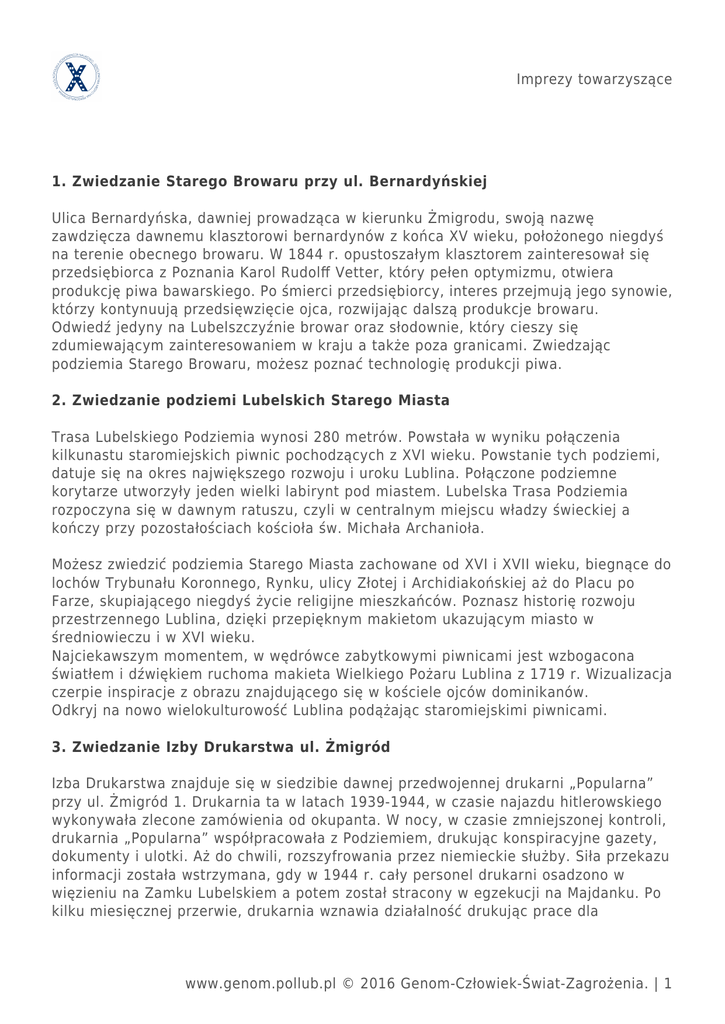 Imprezy towarzyszące 1. Zwiedzanie Starego Browaru przy ul. Bernardyńskiej Ulica Bernardyńska, dawniej prowadząca w kierunku Żmigrodu, swoją nazwę zawdzięcza dawnemu klasztorowi bernardynów z końca XV wieku, położonego niegdyś na terenie obecnego browaru. W 1844 r. opustoszałym klasztorem zainteresował się przedsiębiorca z Poznania Karol Rudolff Vetter, który pełen optymizmu, otwiera produkcję piwa bawarskiego. Po śmierci przedsiębiorcy, interes przejmują jego synowie, którzy kontynuują przedsięwzięcie ojca, rozwijając dalszą produkcje browaru. Odwiedź jedyny na Lubelszczyźnie browar oraz słodownie, który cieszy się zdumiewającym zainteresowaniem w kraju a także poza granicami. Zwiedzając podziemia Starego Browaru, możesz poznać technologię produkcji piwa. 2. Zwiedzanie podziemi Lubelskich Starego Miasta Trasa Lubelskiego Podziemia wynosi 280 metrów. Powstała w wyniku połączenia kilkunastu staromiejskich piwnic pochodzących z XVI wieku. Powstanie tych podziemi, datuje się na okres największego rozwoju i uroku Lublina. Połączone podziemne korytarze utworzyły jeden wielki labirynt pod miastem. Lubelska Trasa Podziemia rozpoczyna się w dawnym ratuszu, czyli w centralnym miejscu władzy świeckiej a kończy przy pozostałościach kościoła św. Michała Archanioła. Możesz zwiedzić podziemia Starego Miasta zachowane od XVI i XVII wieku, biegnące do lochów Trybunału Koronnego, Rynku, ulicy Złotej i Archidiakońskiej aż do Placu po Farze, skupiającego niegdyś życie religijne mieszkańców. Poznasz historię rozwoju przestrzennego Lublina, dzięki przepięknym makietom ukazującym miasto w średniowieczu i w XVI wieku. Najciekawszym momentem, w wędrówce zabytkowymi piwnicami jest wzbogacona światłem i dźwiękiem ruchoma makieta Wielkiego Pożaru Lublina z 1719 r. Wizualizacja czerpie inspiracje z obrazu znajdującego się w kościele ojców dominikanów. Odkryj na nowo wielokulturowość Lublina podążając staromiejskimi piwnicami. 3. Zwiedzanie Izby Drukarstwa ul. Żmigród Izba Drukarstwa znajduje się w siedzibie dawnej przedwojennej drukarni „Popularna” przy ul. Żmigród 1. Drukarnia ta w latach 1939-1944, w czasie najazdu hitlerowskiego wykonywała zlecone zamówienia od okupanta. W nocy, w czasie zmniejszonej kontroli, drukarnia „Popularna” współpracowała z Podziemiem, drukując konspiracyjne gazety, dokumenty i ulotki. Aż do chwili, rozszyfrowania przez niemieckie służby. Siła przekazu informacji została wstrzymana, gdy w 1944 r. cały personel drukarni osadzono w więzieniu na Zamku Lubelskiem a potem został stracony w egzekucji na Majdanku. Po kilku miesięcznej przerwie, drukarnia wznawia działalność drukując prace dla www.genom.pollub.pl © 2016 Genom-Człowiek-Świat-Zagrożenia. | 1 Imprezy towarzyszące Katolickiego Uniwersytetu Lubelskiego, Kurii Biskupiej i instytucji urzędowych. Odwiedź Izbę Drukarstwa i poznaj pracownie: drukarni z zecernią, litografii, papierni i introligatorni. W czasie zwiedzania dowiesz się więcej na temat historii pisma i drukarstwa, techniki składania książek, techniki druku wypukłego i kaligrafii oraz tworzenia grafiki na kamieniu litograficznym. Dodatkowo zwiedzający mogą obejrzeć wystawę Józefa Łobodowskiego. 4. Dominikanie – zwiedzanie krużganków, krypt, sala Unii Lubelskiej Bazylika św. Stanisława Biskupa Męczennika, zwana też Bazyliką Relikwii Krzyża Świętego lub Kościół oo. Dominikanów to jedna z najstarszych w Lublinie a zarazem najdłużej istniejąca świątynia. Szacuje się, że Dominikanie przybyli z Krakowa do Lublina w XIII wieku. Bazylika oo. Dominikanów została ufundowana przez Kazimierza Wielkiego w 1342 r. Warto przejść i podziwiać krużganki klasztoru oo. Dominikanów, który jest jednym z najstarszych kościołów w Lublinie. Bazylika przyciąga uwagę ze względu na architekturę. Łączy styl późnorenesansowy (w kaplicy Firlejów i Matki Boskiej Opieki) oraz barokowy (Tyszkiewiczowska i Paryska). Budynek klasztoru upodabnia się do architektury pałacu wawelskiego i Kaplicy Zygmunta Starego. W klasztorze można zwiedzić Sale Unii Lubelskiej, w której według klasztornej tradycji w 1569 r. została zaprzysiężona unia polsko-litewska. Zwiedzający pozna tajemnice krypt Bazyliki oraz historię relikwii Drzewa Krzyża Świętego, przywiezione przez biskupa Andrzeja na polecenie Władysława Jagiełły a które przechowywano do 1991 r. 5. Zwiedzanie Bramy Grodzkiej – Teatr NN-Stare miasto żydowskie Brama Grodzka (Brama Żydowska) jest pozostałością pierwszych obwarowań miasta, które wybudowano w 1342 r. na zlecenie Kazimierza III Wielkiego. Ośrodek „Brama Grodzka – Teatr NN” jest instytucją kultury powstałą na rzecz ochrony dziedzictwa kulturowego i edukacji. Od 1998 r. teatr prowadzi swoją działalność w trzech miejscach: w Bramie Grodzkiej, w Trasie Podziemnej (Trybunał) i w Domu Słów przy ul. Żmigród. Głównym celem Teatru NN jest upamiętnienie historii miasta. Jeśli interesuje Cię dawne miejsce ówczesnej dzielnicy żydowskiej oraz miejsce przejścia pomiędzy miastem chrześcijańskim (Stare miasto) i dzielnicą żydowską, warto poświęcić chwilę uwagi tej wędrówce. 6. Kaplica św. Trójcy, Donżon – na Zamku Lubelskim Kaplica Trójcy Świętej znajduje się na dziedzińcu Zamku Lubelskiego i łączy się z częścią muzealną. Jest jedną z najciekawszych średniowiecznych zabytków w Polsce i w www.genom.pollub.pl © 2016 Genom-Człowiek-Świat-Zagrożenia. | 2 Imprezy towarzyszące Europie. W środku świątyni można podziwiać niesamowite malowidła bizantyńsko-ruskie oraz freski w stylu wschodnim, znajdujące się na sklepieniu ścian, których fundatorem był król Władysław Jagiełło. Początki powstania kaplicy datuje się na rok 1326. Nie wiadomo dokładnie, kiedy rozpoczęły się prace przy polichromii. Opisy Hieronima Łopacińskiego w księdze 