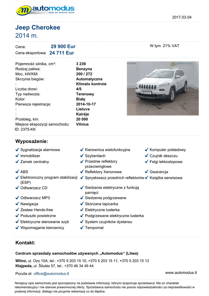 2017.03.04 Jeep Cherokee 2014 m. Cena: Cena eksportowa: W tym 21% VAT 29 900 Eur 24 711 Eur Pojemność silnika, cm³: Rodzaj paliwa: Moc, kW/KM: Skrzynia biegów: : Liczba drzwi: Typ nadwozia: Kolor: Pierwsza rejestracja: : : Przebieg, km: Miejsce ekspozycji samochodu: ID: 2375-KK 3 239 Benzyna 200 / 272 Automatyczna Klimato kontrole 4/5 Terenowy Biały 2014-10-17 Lietuva Kairėje 20 000 Vilnius Wyposażenie: Sygnalizacja alarmowa Kierownica wielofunkcyjna Komputer pokładowy Immobilizer Szyberdach Przednie reflektory przeciwmgłowe Reflektory Xenonowe Czujnik deszczu Spryskiwacz przednich reflektorów Książka serwisowa Zamek centralny ABS Elektroniczny program stabilizacji (ESP) Odtwarzacz CD Odtwarzacz MP3 Siedzenia elektryczne z funkcją pamięci Siedzenia podgrzewane Nawigacja Skórzana tapicerka Zestaw Hands-free Elektryczne lusterka Poduszki powietrzne Podgrzewane elektryczne lusterka Elektryczne sterowanie szyb System czujników dystansu Wspomaganie kierownicy Tempomat Felgi lekkostopowe Gwarancja Kontakt: Centrum sprzedaży samochodów używanych „Automodus“ (Litwa) Wilno, ul. Ozo 10A, tel.: +370 5 203 15 10, +370 5 203 15 11, +370 5 203 15 13 Kłajpeda, ul. Šilutės 57, tel.: +370 46 34 49 44 Poczta el. [email protected] www.automodus.lt Niniejszy opis samochodu jest sporządzony na podstawie informacji, którymi dysponuje sprzedawca. Ma on charakter rekomendacyjny i nie stanowi prawomocnej oferty. Sprzedawca samochodu nie ponosi odpowiedzialności za nieprawidłowości w podanej informacji, dlatego nie przyjmie reklamacji co do błędów.