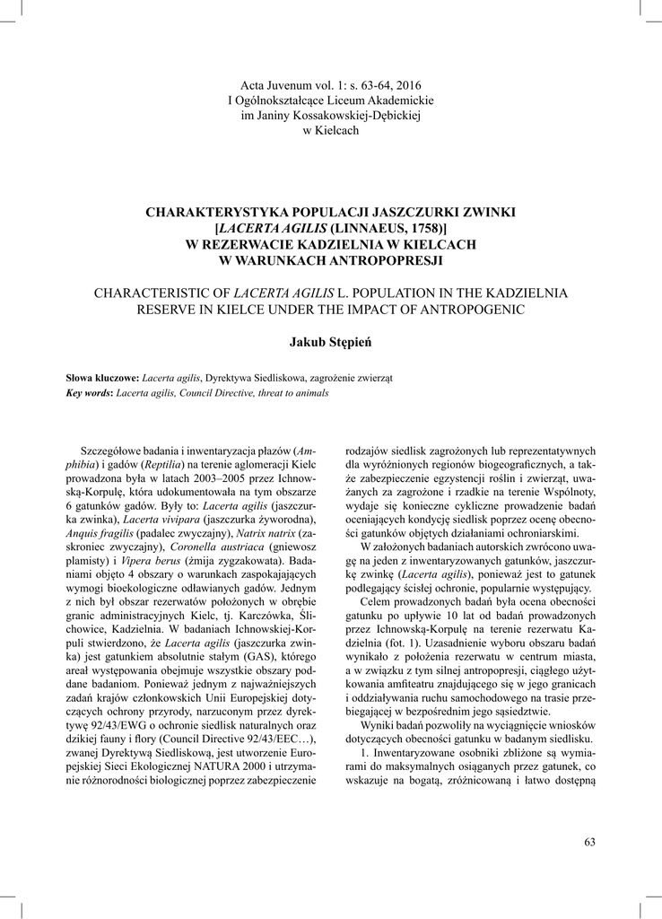 Acta Juvenum vol. 1: s. 63-64, 2016 I Ogólnokształcące Liceum Akademickie im Janiny Kossakowskiej-Dębickiej w Kielcach CHARAKTERYSTYKA POPULACJI JASZCZURKI ZWINKI [LACERTA AGILIS (LINNAEUS, 1758)] W REZERWACIE KADZIELNIA W KIELCACH W WARUNKACH ANTROPOPRESJI CHARACTERISTIC OF LACERTA AGILIS L. POPULATION IN THE KADZIELNIA RESERVE IN KIELCE UNDER THE IMPACT OF ANTROPOGENIC Jakub Stępień Słowa kluczowe: Lacerta agilis, Dyrektywa Siedliskowa, zagrożenie zwierząt Key words: Lacerta agilis, Council Directive, threat to animals Szczegółowe badania i inwentaryzacja płazów (Amphibia) i gadów (Reptilia) na terenie aglomeracji Kielc prowadzona była w latach 2003–2005 przez Ichnowską-Korpulę, która udokumentowała na tym obszarze 6 gatunków gadów. Były to: Lacerta agilis (jaszczurka zwinka), Lacerta vivipara (jaszczurka żyworodna), Anquis fragilis (padalec zwyczajny), Natrix natrix (zaskroniec zwyczajny), Coronella austriaca (gniewosz plamisty) i Vipera berus (żmija zygzakowata). Badaniami objęto 4 obszary o warunkach zaspokajających wymogi bioekologiczne odławianych gadów. Jednym z nich był obszar rezerwatów położonych w obrębie granic administracyjnych Kielc, tj. Karczówka, Ślichowice, Kadzielnia. W badaniach Ichnowskiej-Korpuli stwierdzono, że Lacerta agilis (jaszczurka zwinka) jest gatunkiem absolutnie stałym (GAS), którego areał występowania obejmuje wszystkie obszary poddane badaniom. Ponieważ jednym z najważniejszych zadań krajów członkowskich Unii Europejskiej dotyczących ochrony przyrody, narzuconym przez dyrektywę 92/43/EWG o ochronie siedlisk naturalnych oraz dzikiej fauny i flory (Council Directive 92/43/EEC…), zwanej Dyrektywą Siedliskową, jest utworzenie Europejskiej Sieci Ekologicznej NATURA 2000 i utrzymanie różnorodności biologicznej poprzez zabezpieczenie rodzajów siedlisk zagrożonych lub reprezentatywnych dla wyróżnionych regionów biogeograficznych, a także zabezpieczenie egzystencji roślin i zwierząt, uważanych za zagrożone i rzadkie na terenie Wspólnoty, wydaje się konieczne cykliczne prowadzenie badań oceniających kondycję siedlisk poprzez ocenę obecności gatunków objętych działaniami ochroniarskimi. W założonych badaniach autorskich zwrócono uwagę na jeden z inwentaryzowanych gatunków, jaszczurkę zwinkę (Lacerta agilis), ponieważ jest to gatunek podlegający ścisłej ochronie, popularnie występujący. Celem prowadzonych badań była ocena obecności gatunku po upływie 10 lat od badań prowadzonych przez Ichnowską-Korpulę na terenie rezerwatu Kadzielnia (fot. 1). Uzasadnienie wyboru obszaru badań wynikało z położenia rezerwatu w centrum miasta, a w związku z tym silnej antropopresji, ciągłego użytkowania amfiteatru znajdującego się w jego granicach i oddziaływania ruchu samochodowego na trasie przebiegającej w bezpośrednim jego sąsiedztwie. Wyniki badań pozwoliły na wyciągnięcie wniosków dotyczących obecności gatunku w badanym siedlisku. 1. Inwentaryzowane osobniki zbliżone są wymiarami do maksymalnych osiąganych przez gatunek, co wskazuje na bogatą, zróżnicowaną i łatwo dostępną 63 bazę pokarmową. 2. Przeważającą część populacji stanowią samice (fot. 2). 3. Preferencje siedliskowe jaszczurki to niskie trawy, porastające wystawy południowe, gatunek stwierdzano także na obszarze podmokłym, zacienionym, pod kamieniami, co może świadczyć o bogatej na tym terenie bazie pokarmowej. 4. Gatunek ciągle utrzymuje się w rezerwacie mimo wzmożonego ruchu turystycznego, wykonywanych zabiegów pielęgnacyjnych i remontowych amfiteatru oraz wzmożonego ruchu samochodowego. 5. Populacja jaszczurki zwinki (Lacerta agilis) posiada dużą możliwość tolerancji na zróżnicowane warunki środowiskowe. Fot. 1. Rezerwat Kadzielnia, obszar badań (fot. J. Stępień) Fot. 2. Jaszczurka zwinka [Lacerta agilis (Linnaeus, 1758)] (fot. J. Stępień) 64 Materiał przedstawiony na konferencji: International Conference ”Bioindication as challenge in modern environmental protection” Kielce–Sobków 10–13.09.2013 r.