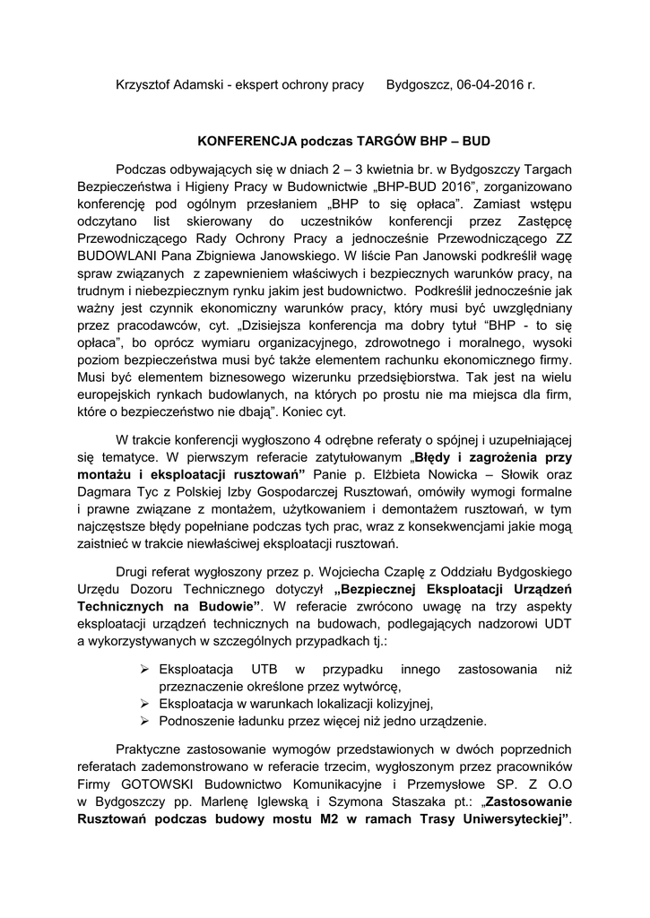 Krzysztof Adamski - ekspert ochrony pracy Bydgoszcz, 06-04-2016 r. KONFERENCJA podczas TARGÓW BHP – BUD Podczas odbywających się w dniach 2 – 3 kwietnia br. w Bydgoszczy Targach Bezpieczeństwa i Higieny Pracy w Budownictwie „BHP-BUD 2016”, zorganizowano konferencję pod ogólnym przesłaniem „BHP to się opłaca”. Zamiast wstępu odczytano list skierowany do uczestników konferencji przez Zastępcę Przewodniczącego Rady Ochrony Pracy a jednocześnie Przewodniczącego ZZ BUDOWLANI Pana Zbigniewa Janowskiego. W liście Pan Janowski podkreślił wagę spraw związanych z zapewnieniem właściwych i bezpiecznych warunków pracy, na trudnym i niebezpiecznym rynku jakim jest budownictwo. Podkreślił jednocześnie jak ważny jest czynnik ekonomiczny warunków pracy, który musi być uwzględniany przez pracodawców, cyt. „Dzisiejsza konferencja ma dobry tytuł “BHP - to się opłaca”, bo oprócz wymiaru organizacyjnego, zdrowotnego i moralnego, wysoki poziom bezpieczeństwa musi być także elementem rachunku ekonomicznego firmy. Musi być elementem biznesowego wizerunku przedsiębiorstwa. Tak jest na wielu europejskich rynkach budowlanych, na których po prostu nie ma miejsca dla firm, które o bezpieczeństwo nie dbają”. Koniec cyt. W trakcie konferencji wygłoszono 4 odrębne referaty o spójnej i uzupełniającej się tematyce. W pierwszym referacie zatytułowanym „Błędy i zagrożenia przy montażu i eksploatacji rusztowań” Panie p. Elżbieta Nowicka – Słowik oraz Dagmara Tyc z Polskiej Izby Gospodarczej Rusztowań, omówiły wymogi formalne i prawne związane z montażem, użytkowaniem i demontażem rusztowań, w tym najczęstsze błędy popełniane podczas tych prac, wraz z konsekwencjami jakie mogą zaistnieć w trakcie niewłaściwej eksploatacji rusztowań. Drugi referat wygłoszony przez p. Wojciecha Czaplę z Oddziału Bydgoskiego Urzędu Dozoru Technicznego dotyczył „Bezpiecznej Eksploatacji Urządzeń Technicznych na Budowie”. W referacie zwrócono uwagę na trzy aspekty eksploatacji urządzeń technicznych na budowach, podlegających nadzorowi UDT a wykorzystywanych w szczególnych przypadkach tj.: Eksploatacja UTB w przypadku innego zastosowania przeznaczenie określone przez wytwórcę, Eksploatacja w warunkach lokalizacji kolizyjnej, Podnoszenie ładunku przez więcej niż jedno urządzenie. niż Praktyczne zastosowanie wymogów przedstawionych w dwóch poprzednich referatach zademonstrowano w referacie trzecim, wygłoszonym przez pracowników Firmy GOTOWSKI Budownictwo Komunikacyjne i Przemysłowe SP. Z O.O w Bydgoszczy pp. Marlenę Iglewską i Szymona Staszaka pt.: „Zastosowanie Rusztowań podczas budowy mostu M2 w ramach Trasy Uniwersyteckiej”. Autorzy wystąpienia skupili się na nowoczesnych rozwiązaniach technicznych i technologicznych realizowanego zadania, omówili zasady wszechstronnego i bezpiecznego wykorzystania sprzętu technicznego na realizowanej budowie oraz przedstawili unikatowy sposób montaży zwieńczenia pylonu na wysokości ok. 70 metrów nad nurtem Brdy. W formie doniesienia przedłożono jeszcze referat dostępny na stronie internetowej Targów tj. „Plan BIOZ na budowie” - miesięcznika ALERT BHP. Skutki i konsekwencje nie stosowania się do wymogów przepisów i zasad bezpiecznej pracy oraz działania prewencyjne podejmowane przez Państwową Inspekcję Pracy w wystąpieniu pt.: „Wypadki przy pracy a ocena ryzyka zawodowego” przedstawił p. Roman Wzorek z Okręgowego Inspektoratu Pracy w Bydgoszczy. Zamiast podsumowania prowadzący Konferencję p. Krzysztof Adamski przedstawił koszty wypadków przy pracy i awarii, ponoszone bezpośrednio przez pracodawców i przedsiębiorców. Zakończył cytując prof. Adama Markowskiego – „Bezpieczeństwo to zysk”.