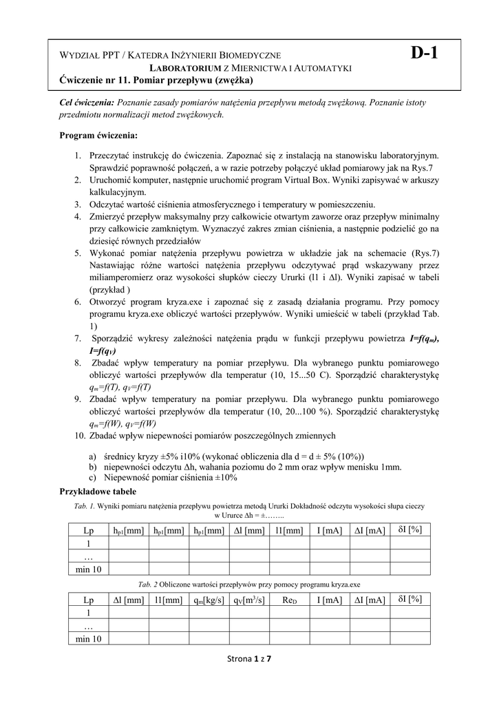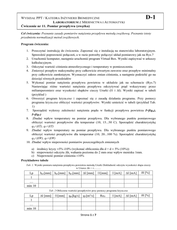 D-1 WYDZIAŁ PPT / KATEDRA INŻYNIERII BIOMEDYCZNE LABORATORIUM Z MIERNICTWA I AUTOMATYKI Ćwiczenie nr 11. Pomiar przepływu (zwężka) Cel ćwiczenia: Poznanie zasady pomiarów natężenia przepływu metodą zwężkową. Poznanie istoty przedmiotu normalizacji metod zwężkowych. Program ćwiczenia: 1. Przeczytać instrukcję do ćwiczenia. Zapoznać się z instalacją na stanowisku laboratoryjnym. Sprawdzić poprawność połączeń, a w razie potrzeby połączyć układ pomiarowy jak na Rys.7 2. Uruchomić komputer, następnie uruchomić program Virtual Box. Wyniki zapisywać w arkuszy kalkulacyjnym. 3. Odczytać wartość ciśnienia atmosferycznego i temperatury w pomieszczeniu. 4. Zmierzyć przepływ maksymalny przy całkowicie otwartym zaworze oraz przepływ minimalny przy całkowicie zamkniętym. Wyznaczyć zakres zmian ciśnienia, a następnie podzielić go na dziesięć równych przedziałów 5. Wykonać pomiar natężenia przepływu powietrza w układzie jak na schemacie (Rys.7) Nastawiając różne wartości natężenia przepływu odczytywać prąd wskazywany przez miliamperomierz oraz wysokości słupków cieczy Ururki (l1 i ∆l). Wyniki zapisać w tabeli (przykład ) 6. Otworzyć program kryza.exe i zapoznać się z zasadą działania programu. Przy pomocy programu kryza.exe obliczyć wartości przepływów. Wyniki umieścić w tabeli (przykład Tab. 1) 7. Sporządzić wykresy zależności natężenia prądu w funkcji przepływu powietrza I=f(qm), I=f(qV) 8. Zbadać wpływ temperatury na pomiar przepływu. Dla wybranego punktu pomiarowego obliczyć wartości przepływów dla temperatur (10, 15...50 C). Sporządzić charakterystykę qm=f(T), qV=f(T) 9. Zbadać wpływ temperatury na pomiar przepływu. Dla wybranego punktu pomiarowego obliczyć wartości przepływów dla temperatur (10, 20...100 %). Sporządzić charakterystykę qm=f(W), qV=f(W) 10. Zbadać wpływ niepewności pomiarów poszczególnych zmiennych a) średnicy kryzy ±5% i10% (wykonać obliczenia dla d = d ± 5% (10%)) b) niepewności odczytu Δh, wahania poziomu do 2 mm oraz wpływ menisku 1mm. c) Niepewność pomiar ciśnienia ±10% Przykładowe tabele Tab. 1. Wyniki pomiaru natężenia przepływu powietrza metodą Ururki Dokładność odczytu wysokości słupa cieczy w Ururce h = ±…….. Lp 1 … min 10 hp1[mm] hp1[mm] hp1[mm] l [mm] l1[mm] I [mA] I [mA] I [%] Tab. 2 Obliczone wartości przepływów przy pomocy programu kryza.exe Lp 1 … min 10 l [mm] l1[mm] qm[kg/s] qV[m3/s] Strona 1 z 7 ReD I [mA] I [mA] I [%] WYDZIAŁ PPT / KATEDRA INŻYNIERII BIOMEDYCZNE LABORATORIUM Z MIERNICTWA I AUTOMATYKI Ćwiczenie nr 11. Pomiar przepływu (zwężka) D-1 Wprowadzenie: Masowym qm oraz objętościowym qv natężeniem przepływu płynu nazywamy odpowiednio ilość masy lub objętość płynu (cieczy lub gazu) przepływającego w jednostce czasu przez dany przekrój rurociągu. Stosowanymi jednostkami dla qm i qv są odpowiednio kg/s i m3/s. Większość stosowanych metod pomiaru natężenia przepływu polega na pomiarze objętościowego natężenia przepływu. Wartość masowego natężenia przepływu wymaga znajomości (lub pomiaru) gęstości płynu. Są to więc pośrednie metody pomiaru masowego natężenia przepływu. Tak jest również w wypadku przedstawionej w ćwiczeniu metody zwężkowej. 1. Metoda zwężkowa Jeśli do przewodu, przez który przepływa ciecz lub gaz (płyn), wstawimy przewężenie Rys.1a), tzw. zwężkę i będziemy mierzyli manometrem różnicowym ciśnienie przed przewężeniem i blisko za przewężeniem, to manometr wykaże różnicę ciśnień. (Zwróć uwagę na analogię występowania różnicy potencjałów na końcach rezystora przy przepływie prądu elektrycznego, Rys.1b) Rys.1. Występowanie różnicy ciśnień na zwężce przy przepływie płynu a) ; występowanie różnicy potencjałów na rezystorze przy przepływie prądu elektrycznego b) Ciśnienie przed zwężką będzie większe niż ciśnienie za zwężką. Różnica ta (∆p) będzie tym większa, im większe będzie natężenie przepływu płynu przez rurociąg. Opisuje to prawo Bernouliego, które mówi, że suma energii potencjalnej i kinetycznej płynu w każdym przekroju przewodu ma wartość stałą (1). 𝒑 𝒒 gdzie: + 𝒗𝟐 𝟐 = 𝒄𝒐𝒏𝒔𝒕. (1) p – ciśnienie płynu, ρ – gęstość płynu, v – prędkość płynu. Zastosowanie powyższego równania dla przekroju przed zwężką i dla przekroju za zwężką, w miejscu największego zwężenia strumienia, umożliwia otrzymanie zależności pomiędzy prędkością przepływu i różnicą ciśnień (2). 𝟐 𝒗 = 𝒄𝒐𝒏𝒔𝒕. √𝒒 (𝒑𝟏 − 𝒑𝟐 ) (2) Tę zależność różnicy ciśnień (przed i za urządzeniem zwężającym strumień płynu) od natężenia przepływu wykorzystuje się do pomiaru natężenia przepływu cieczy i gazów w rurociągach. Przyrządy pomiarowe oparte na tej zasadzie są bardzo szeroko stosowane w praktyce przemysłowej i często są jedynymi przyrządami pozwalającymi na dokonanie pomiaru. Poza tym poważną ich zaletą jest prosta budowa. Stosowane są trzy zasadnicze typy zwężek: kryzy, dysze, i dysze Venturiego. Strona 2 z 7 WYDZIAŁ PPT / KATEDRA INŻYNIERII BIOMEDYCZNE LABORATORIUM Z MIERNICTWA I AUTOMATYKI Ćwiczenie nr 11. Pomiar przepływu (zwężka) D-1 Na Rys.2 przedstawiono kryzę. W przewód między dwoma kołnierzami wstawiona jest cienka tarcza 1 z okrągłym otworem 2 pośrodku. Środek otworu ustawiony jest w osi rury. Z obu stron tarczykryzy wprowadzone są rurki, tzw. rurki impulsowe 3, do których podłącza się manometr różnicowy. Strumień cieczy już w pewnej odległości od kryzy ulega stopniowemu zwężeniu. Jednakże największe zwężenie uzyskuje się nie w otworze kryzy, ale w pewnej odległości za nim, tak że przekrój strumienia w jego najwęższym miejscu jest mniejszy od przekroju otworu kryzy. Następnie strumień stopniowo rozszerza się, wypełniaj