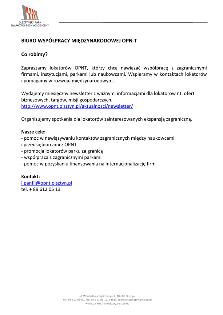 BIURO WSPÓŁPRACY MIĘDZYNARODOWEJ OPN-T Co robimy? Zapraszamy lokatorów OPNT, którzy chcą nawiązać współpracę z zagranicznymi firmami, instytucjami, parkami lub naukowcami. Wspieramy w kontaktach lokatorów i pomagamy w rozwoju międzynarodowym. Wydajemy miesięczny newsletter z ważnymi informacjami dla lokatorów nt. ofert biznesowych, targów, misji gospodarczych. http://www.opnt.olsztyn.pl/aktualnosci/newsletter/ Organizujemy spotkania dla lokatorów zainteresowanych ekspansją zagraniczną. Nasze cele: - pomoc w nawiązywaniu kontaktów zagranicznych między naukowcami i przedsiębiorcami z OPNT - promocja lokatorów parku za granicą - współpraca z zagranicznymi parkami - pomoc w pozyskaniu finansowania na internacjonalizację firm Kontakt: [email protected] tel. + 89 612 05 13 ul. Władysława Trylińskiego 2, 10-683 Olsztyn, tel. 89-612-05-00, fax: 89-612-05-12, e-mail: [email protected] www.parktechnologiczny.olsztyn.eu