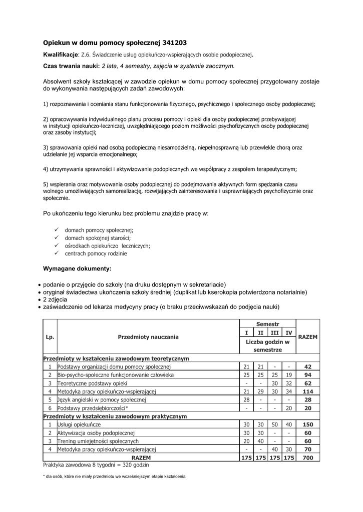 Opiekun w domu pomocy społecznej 341203 Kwalifikacje: Z.6. Świadczenie usług opiekuńczo-wspierających osobie podopiecznej. Czas trwania nauki: 2 lata, 4 semestry, zajęcia w systemie zaocznym. Absolwent szkoły kształcącej w zawodzie opiekun w domu pomocy społecznej przygotowany zostaje do wykonywania następujących zadań zawodowych: 1) rozpoznawania i oceniania stanu funkcjonowania fizycznego, psychicznego i społecznego osoby podopiecznej; 2) opracowywania indywidualnego planu procesu pomocy i opieki dla osoby podopiecznej przebywającej w instytucji opiekuńczo-leczniczej, uwzględniającego poziom możliwości psychofizycznych osoby podopiecznej oraz zasoby instytucji; 3) sprawowania opieki nad osobą podopieczną niesamodzielną, niepełnosprawną lub przewlekle chorą oraz udzielanie jej wsparcia emocjonalnego; 4) utrzymywania sprawności i aktywizowanie podopiecznych we współpracy z zespołem terapeutycznym; 5) wspierania oraz motywowania osoby podopiecznej do podejmowania aktywnych form spędzania czasu wolnego umożliwiających samorealizację, rozwijających zainteresowania i usprawniających psychofizycznie oraz społecznie. Po ukończeniu tego kierunku bez problemu znajdzie pracę w: domach pomocy społecznej; domach spokojnej starości; ośrodkach opiekuńczo leczniczych; centrach pomocy rodzinie Wymagane dokumenty: podanie o przyjęcie do szkoły (na druku dostępnym w sekretariacie) oryginał świadectwa ukończenia szkoły średniej (duplikat lub kserokopia potwierdzona notarialnie) 2 zdjęcia zaświadczenie od lekarza medycyny pracy (o braku przeciwwskazań do podjęcia nauki) Semestr Lp. Przedmioty nauczania I II III IV Liczba godzin w semestrze RAZEM Przedmioty w kształceniu zawodowym teoretycznym 1 Podstawy organizacji domu pomocy społecznej 21 21 - - 42 2 Bio-psycho-społeczne funkcjonowanie człowieka 25 25 25 19 94 3 Teoretyczne podstawy opieki - - 30 32 62 4 Metodyka pracy opiekuńczo-wspierającej 21 29 30 34 114 5 Język angielski w pomocy społecznej 28 - - - 28 6 Podstawy przedsiębiorczości* - - - 20 20 Przedmioty w kształceniu zawodowym praktycznym 1 Usługi opiekuńcze 30 30 50 40 150 2 Aktywizacja osoby podopiecznej 30 30 - - 60 3 Trening umiejętności społecznych 20 40 - - 60 4 Metodyka pracy opiekuńczo-wspierającej - - 40 30 70 RAZEM Praktyka zawodowa 8 tygodni = 320 godzin * dla osób, które nie miały przedmiotu we wcześniejszym etapie kształcenia 175 175 175 175 700