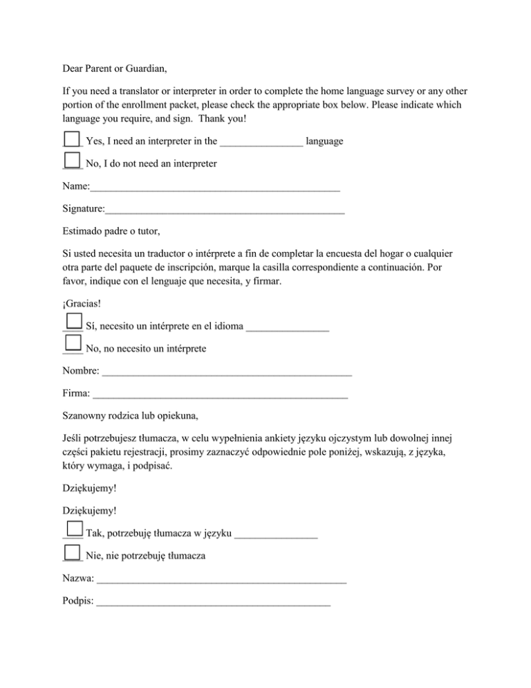 Dear Parent or Guardian, If you need a translator or interpreter in order to complete the home language survey or any other portion of the enrollment packet, please check the appropriate box below. Please indicate which language you require, and sign. Thank you! ____ Yes, I need an interpreter in the ________________ language ____ No, I do not need an interpreter Name:________________________________________________ Signature:______________________________________________ Estimado padre o tutor, Si usted necesita un traductor o intérprete a fin de completar la encuesta del hogar o cualquier otra parte del paquete de inscripción, marque la casilla correspondiente a continuación. Por favor, indique con el lenguaje que necesita, y firmar. ¡Gracias! ____ Sí, necesito un intérprete en el idioma ________________ ____ No, no necesito un intérprete Nombre: ________________________________________________ Firma: _________________________________________________ Szanowny rodzica lub opiekuna, Jeśli potrzebujesz tłumacza, w celu wypełnienia ankiety języku ojczystym lub dowolnej innej części pakietu rejestracji, prosimy zaznaczyć odpowiednie pole poniżej, wskazują, z języka, który wymaga, i podpisać. Dziękujemy! Dziękujemy! ____ Tak, potrzebuję tłumacza w języku ________________ ____ Nie, nie potrzebuję tłumacza Nazwa: ________________________________________________ Podpis: _____________________________________________