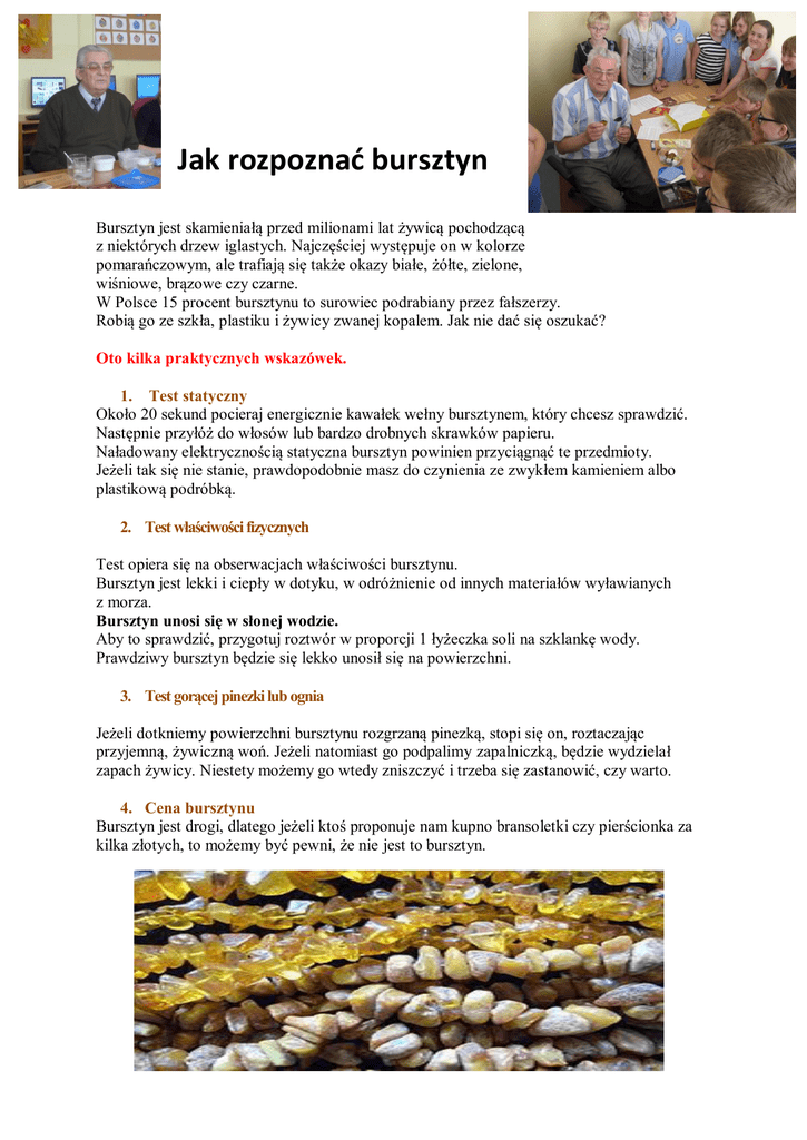 Jak rozpoznać bursztyn Bursztyn jest skamieniałą przed milionami lat żywicą pochodzącą z niektórych drzew iglastych. Najczęściej występuje on w kolorze pomarańczowym, ale trafiają się także okazy białe, żółte, zielone, wiśniowe, brązowe czy czarne. W Polsce 15 procent bursztynu to surowiec podrabiany przez fałszerzy. Robią go ze szkła, plastiku i żywicy zwanej kopalem. Jak nie dać się oszukać? Oto kilka praktycznych wskazówek. 1. Test statyczny Około 20 sekund pocieraj energicznie kawałek wełny bursztynem, który chcesz sprawdzić. Następnie przyłóż do włosów lub bardzo drobnych skrawków papieru. Naładowany elektrycznością statyczna bursztyn powinien przyciągnąć te przedmioty. Jeżeli tak się nie stanie, prawdopodobnie masz do czynienia ze zwykłem kamieniem albo plastikową podróbką. 2. Test właściwości fizycznych Test opiera się na obserwacjach właściwości bursztynu. Bursztyn jest lekki i ciepły w dotyku, w odróżnienie od innych materiałów wyławianych z morza. Bursztyn unosi się w słonej wodzie. Aby to sprawdzić, przygotuj roztwór w proporcji 1 łyżeczka soli na szklankę wody. Prawdziwy bursztyn będzie się lekko unosił się na powierzchni. 3. Test gorącej pinezki lub ognia Jeżeli dotkniemy powierzchni bursztynu rozgrzaną pinezką, stopi się on, roztaczając przyjemną, żywiczną woń. Jeżeli natomiast go podpalimy zapalniczką, będzie wydzielał zapach żywicy. Niestety możemy go wtedy zniszczyć i trzeba się zastanowić, czy warto. 4. Cena bursztynu Bursztyn jest drogi, dlatego jeżeli ktoś proponuje nam kupno bransoletki czy pierścionka za kilka złotych, to możemy być pewni, że nie jest to bursztyn.