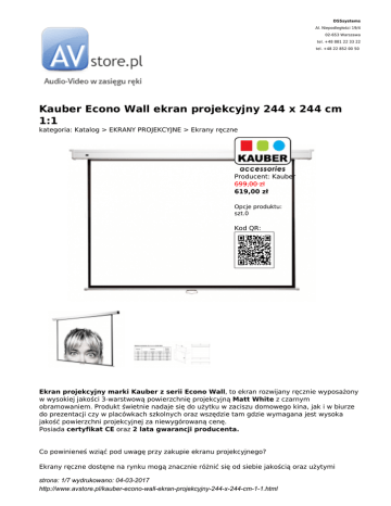 DSSsystems Al. Niepodległości 19/4 02-653 Warszawa tel. +48 881 22 33 22 tel. +48 22 852 00 50 Kauber Econo Wall ekran projekcyjny 244 x 244 cm 1:1 kategoria: Katalog > EKRANY PROJEKCYJNE > Ekrany ręczne Producent: Kauber 699,00 zł 619,00 zł Opcje produktu: szt.0 Kod QR: Ekran projekcyjny marki Kauber z serii Econo Wall, to ekran rozwijany ręcznie wyposażony w wysokiej jakości 3-warstwową powierzchnię projekcyjną Matt White z czarnym obramowaniem. Produkt świetnie nadaje się do użytku w zaciszu domowego kina, jak i w biurze do prezentacji czy w placówkach szkolnych oraz wszędzie tam gdzie wymagana jest wysoka jakość powierzchni projekcyjnej za niewygórowaną cenę. Posiada certyfikat CE oraz 2 lata gwarancji producenta. Co powinieneś wziąć pod uwagę przy zakupie ekranu projekcyjnego? Ekrany ręczne dostęne na rynku mogą znacznie różnić się od siebie jakością oraz użytymi strona: 1/7 wydrukowano: 04-03-2017 http://www.avstore.pl/kauber-econo-wall-ekran-projekcyjny-244-x-244-cm-1-1.html materiałami. Przekłada się to bezpośrednio na odbiór obrazu oraz awaryjność ekranów elektrycznych. Dobrej jakości ekran projekcyjny wykonany jest z grubej (nawet 1 mm) powierzchni projekcyjnej, najczęściej składającej się z trzech lub więcej warstw, trwałego mechanizmu zwijania oraz mocnego metalowego wału nawojowego, zapewniają długą bezawaryjną pracę. Unikaj tanich ekranów projekcyjnych. Najczęściej wykonane są one ze słabych powierzchni projekcyjnych lub nawet zwykłych białych rolet okiennych, które przepuszczają światło, a z czasem marszcza się i zawijają, ostatecznie zniekształcając wyświetlany obraz. W ekranie rozwijanym ręcznie, ważny jest system zwijania ekranu, który w tanich, chińskich produktach ulega częstym awariom. Co zyskasz kupując ekran projekcyjny firmy Kauber? Markowy, trwały i sprawdzony produkt Ekrany projekcyjne marki Kauber to najwyższej jakości sprawdzone produkty. Wieloletnie doświadczenie w branży firmy Kauber oraz minimum dwuletnia gwarancja na produkty, potwierdzają najwyższą jakość oferowanych ekranów projekcyjnych. Matt White - Najwyższej jakości powierzchnia projekcyjna Ekran wyposażony jest w profesjonalną powierzchnię projekcyjną Matt White. Jej 3-warstwowa budowa zapewnia trwałość i sztywność rozwiniętej powierzchni oraz eliminuje ewentualne rozciąganie i falowanie warstwy projekcyjnej. Czarne obramowanie dla lepszego kontrastu Ekrany ręczne z serii Econo marki Kauber są wyposażone w powierzchnie projekcyjne z czarnym obramowaniem, dzięki czemu wyświetlany obraz zyskuje efekt większego kontrastu. Jest to ważne szczególnie przy oglądaniu filmów, gdzie wysoki kontrast jest bardzo pożądany. Wytrzymała metalowa kaseta do ściany i sufitu Obudowa ekranu wykonana została w całości z metalu, dzięki temu skutecznie chroni powierzchnię i mechanizm ekranu, zarówno przed uszkodzeniem mechanicznym, jak i przed zabrudzeniami. System montażu strona: 2/7 wydrukowano: 04-03-2017 http://www.avstore.pl/kauber-econo-wall-ekran-projekcyjny-244-x-244-cm-1-1.html pozwala w łatwy sposób zainstalować ekran zarówno na ścianie, jak i suficie, co czyni ekran wyjątkowo uniwersalnym na tle konkurencji. Nie wiesz jaki ekran wybrać? Napisz do nas! Ekrany projekcyjne dobiera się w zależności od pomieszczenia oraz wielu innych parametrow zewnętrznych. Rozmiar oraz format ekranu może być zależny od posiadanego projektora, a powierzchnia projekcyjna powinna być odpowiednia do stopnia naświetlenia światłem dziennym. Również system sterowania powinien być dobierany w zależności od potrzeb oraz możliwości montażu. Jeśli masz wątpliwości lub nie wiesz jaki ekran wybrać, skontaktuj się z nami. Chętnie odpowiemy na wszystkie pytania. Specyfikacja Kauber Econo Wall 244 x 244 cm 1:1 Model Kauber Econo Wall Powierzchnia projekcyjna Matt White - 3 - warstwowa Format Ekranu 1:1 Wymiary ekranu 244 x 244 cm (z czarną ramą 3cm) strona: 3/7 wydrukowano: 04-03-2017 http://www.avstore.pl/kauber-econo-wall-ekran-projekcyjny-244-x-244-cm-1-1.html Wymiary powierzchni aktywnej Wymiary powierzchni aktywnej 238 x 238 cm (biała powierzchnia) Grubość materiału 0.5 mm Kąt widzenia 150 stopni Odbicie światła Gain 1.0 Mechanizm roziwjania Ręczny Dodatkowe Czarny tył powierzchni nie przepuszczający światła Uniwersalny, prosty system montażu 2 lata gwarancji producenta Solidna metalowa obudowa Certyfikat CE strona: 5/7 wydrukowano: 04-03-2017 http://www.avstore.pl/kauber-econo-wall-ekran-projekcyjny-244-x-244-cm-1-1.html strona: 6/7 wydrukowano: 04-03-2017 http://www.avstore.pl/kauber-econo-wall-ekran-projekcyjny-244-x-244-cm-1-1.html strona: 7/7 wydrukowano: 04-03-2017 http://www.avstore.pl/kauber-econo-wall-ekran-projekcyjny-244-x-244-cm-1-1.html