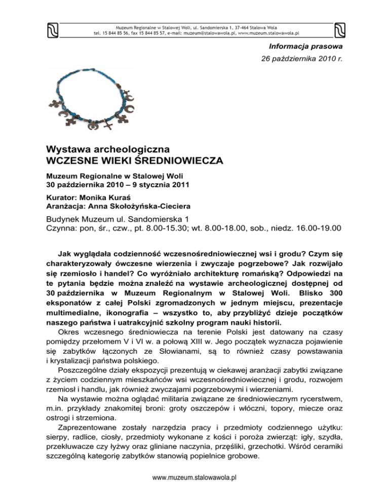 Informacja prasowa 26 października 2010 r. Wystawa archeologiczna WCZESNE WIEKI ŚREDNIOWIECZA Muzeum Regionalne w Stalowej Woli 30 października 2010 – 9 stycznia 2011 Kurator: Monika Kuraś Aranżacja: Anna Skołożyńska-Cieciera Budynek Muzeum ul. Sandomierska 1 Czynna: pon, śr., czw., pt. 8.00-15.30; wt. 8.00-18.00, sob., niedz. 16.00-19.00 Jak wyglądała codzienność wczesnośredniowiecznej wsi i grodu? Czym się charakteryzowały ówczesne wierzenia i zwyczaje pogrzebowe? Jak rozwijało się rzemiosło i handel? Co wyróżniało architekturę romańską? Odpowiedzi na te pytania będzie można znaleźć na wystawie archeologicznej dostępnej od 30 października w Muzeum Regionalnym w Stalowej Woli. Blisko 300 eksponatów z całej Polski zgromadzonych w jednym miejscu, prezentacje multimedialne, ikonografia – wszystko to, aby przybliżyć dzieje początków naszego państwa i uatrakcyjnić szkolny program nauki historii. Okres wczesnego średniowiecza na terenie Polski jest datowany na czasy pomiędzy przełomem V i VI w. a połową XIII w. Jego początek wyznacza pojawienie się zabytków łączonych ze Słowianami, są to również czasy powstawania i krystalizacji państwa polskiego. Poszczególne działy ekspozycji prezentują w ciekawej aranżacji zabytki związane z życiem codziennym mieszkańców wsi wczesnośredniowiecznej i grodu, rozwojem rzemiosł i handlu, jak również zwyczajami pogrzebowymi i wierzeniami. Na wystawie można oglądać militaria związane ze średniowiecznym rycerstwem, m.in. przykłady znakomitej broni: groty oszczepów i włóczni, topory, miecze oraz ostrogi i strzemiona. Zaprezentowane zostały narzędzia pracy i przedmioty codziennego użytku: sierpy, radlice, ciosły, przedmioty wykonane z kości i poroża zwierząt: igły, szydła, przekłuwacze czy łyżwy oraz gliniane naczynia, przęśliki, grzechotki. Wśród ceramiki szczególną kategorię zabytków stanowią popielnice grobowe. www.muzeum.stalowawola.pl Podziwiać można bogatą kolekcję ozdób z metali: srebra, złota oraz brązu, m.in. kabłączki skroniowe, pierścionki, zawieszki, krzyżyki czy kolie z paciorków szklanych oraz ozdoby stroju – zapinki, klamry do pasa. Osobne miejsce przeznaczono na przedstawienie zabytków związanych z handlem, jak wagi, płacidła żelazne i monety. W części poświęconej architekturze wczesnośredniowiecznej główna uwaga skupia się na zagadnieniach dotyczących rozwoju architektury romańskiej w Polsce, znajdują się tu m.in. kamienne romańskie detale architektoniczne z Opactwa Benedyktynów w Tyńcu i Zamku Królewskiego na Wawelu w Krakowie. Wystawa wydaje się niezbędnym uzupełnieniem w nauce dziejów początków naszego państwa i jej odwiedzenie może stanowić atrakcyjny punkt w realizacji szkolnego programu nauki historii. Ekspozycji towarzyszy katalog zawierający kompendium wiedzy dotyczącej archeologii wczesnego średniowiecza, ze szczególnym uwzględnieniem regionu nad dolnym Sanem i Łęgiem, wraz z wykazem zabytków prezentowanych na wystawie. www.muzeum.stalowawola.pl