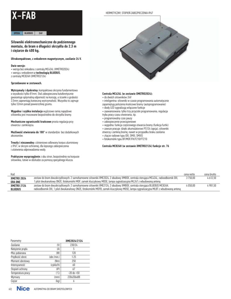 X-FAB OPERA BLUEBUS BLUEBUS 24V HERMETYCZNY, STOPIEÑ ZABEZPIECZENIA IP67 24V Si³owniki elektromechaniczne do podziemnego monta¿u, do bram o d³ugoœci skrzyd³a do 2.3 m i ciê¿arze do 400 kg. Ultrakompaktowe, z enkoderem magnetycznym, zasilanie 24 V. Dwie wersje: • wersja bez enkodera z central¹ MC424L (XMETRO2024) • wersja z enkoderem z technologi¹ BLUEBUS, z central¹ MC824H (XMETRO2124) Sprzedawane w zestawach. Wytrzyma³y i dyskretny: kompaktowa skrzynia fundamentowa o wysokoœci tylko 81mm. Stal zabezpieczona kataforetycznie gwarantuje optymaln¹ odpornoœæ na korozjê, a œcianki o gruboœci 2,5mm zapewniaj¹ konieczn¹ wytrzyma³oœæ. Wszystko to zajmuje tylko 52mm ponad powierzchniê gruntu. Wygodna i szybka instalacja wyjœciowe ramiê napêdowe si³ownika jest mocowane bezpoœrednio do skrzyd³a bramy. Mechaniczne ograniczniki krañcowe prosta regulacja przy otwarciu i zamkniêciu. Mo¿liwoœæ otwierania do 180° w standardzie bez dodatkowych akcesoriów. Trwa³y i niezawodny: ciœnieniowo odlewany korpus aluminiowy z IP67, w skrzyni ochronnej, dla lepszego zabezpieczenia i u³atwienia odprowadzenia wody. Centrala MC424L (w zestawie XMETRO2024): • do dwóch si³owników 24V • inteligentna: si³owniki w czasie programowania automatycznie zapamiêtuj¹ po³o¿enia krañcowe bramy (autoprogramowanie) • diody LED sygnalizuj¹ w³¹czone funkcje • zaawansowana: tylko trzy przyciski programowania, regulacja trybu pracy czasu otwierania, itp. • programowalny czas pauzy • zabezpieczenie przeci¹¿eniowe • wygodna: funkcja czêœciowego otwarcia bramy (funkcja furtki) • zawsze pracuje: dziêki akumulatorowi PS124 (opcja), si³owniki otworz¹ i zamkn¹ bramê, nawet w przypadku braku zasilania • z³¹cze radiowe typu OXI, SMXI, SMXIS • fotokomórki typu BF/MOF/FK/F210/FT210 Centrala MC824H (w zestawie XMETRO2124) funkcje str. 76 Praktyczne wysprzêglenie z obu stron, bezpoœrednio na korpusie si³ownika, ³atwe w obs³udze za pomoc¹ specjalnego klucza. Kod XMETRO 2024 ERA ONE XMETRO 2124 BLUEBUS Parametry Zasilanie Natê¿enie pr¹du Moc pobierana Prêdkoœæ obrot. Moment obrotowy Intensywnoœæ Stopieñ ochrony Temperatura pracy Wymiary Ciê¿ar 62| zestaw do bram dwuskrzyd³owych: 2 samohamowne si³owniki XME2024, 2 obudowy XMBOX, centrala steruj¹ca MC424L, radioodbiornik OXI, 1 pilot dwukana³owy ON2E, fotokomórki MOF, zamek kluczykowy MOSE, lampa sygnalizacyjna ML24T z wbudowan¹ anten¹ zestaw do bram dwuskrzyd³owych: 2 samohamowne si³owniki XME2124, 2 obudowy XMBOX, centrala steruj¹ca BLUEBUS MC824H, radioodbiornik OXI, 1 pilot dwukana³owy ON2E, fotokomórki MOFB, zamek kluczykowy MOSE, lampa sygnalizacyjna MLBT z wbudowan¹ anten¹ (V) (A) (W) (obr./min.) (Nm) (cykle/h) (IP) (°C) (mm) (kg) XME2024/2124 230/24 5 120 1.25 250 60 67 -20 do +50 230x206x88 6 AUTOMATYKA DO BRAM SKRZYD£OWYCH cena netto 3 750,00 cena brutto 4 612,50 4 050,00 4 981,50 AKCESORIA PLA 10 zamek elektromagnetyczny pionowy PLA 11 zamek elektromagnetyczny poziomy PS324 akumulator 24V 2.2 Ah z wbudowan¹ kart¹ ³adowania do centrali MC824H PS124 akumulator 24V 1.2 Ah z wbudowan¹ kart¹ ³adowania SOLEMYO (SYKCE) zestaw zasilania s³onecznego 340,00 418,20 brutto 340,00 418,20 brutto 360,00 442,80 brutto 290,00 356,70 brutto 1 350,00 1 660,50 brutto POZOSTA£E AKCESORIA STR. 96-105 PARAMETRY SKRZYD£A BRAMY 110,00 135,30 brutto 190,00 233,70 brutto BF fotokomórka (para) zasiêg 15-30m 400 max. ciê¿ar skrzyd³a (kg) MLBT MOFB lampa sygnalizacyjna BLUEBUS fotokomórka (para) BLUEBUS 12V z wbudowan¹ anten¹ 433.92 MHz zasiêg 15-30m 160,00 196,80 brutto 300 200 1.5 2 2.3 max. d³ugoœæ skrzyd³a (m) WYMIARY SCHEMAT INSTALACJI 52 X-FAB X-FAB 2024 [legenda] 255 81 [3 x 1.5 mm2] zasilanie [4 x 0.5 mm2] linia foto (RX) 2 [2 x 0.5 mm ] linia foto (TX) [4 x 0.5 mm2] zamek, przycisk [2 x 0.75 mm2] lampa 24V [Rg58] antena [4x1.5 mm2] zasilanie si³owników 320 mm PRZYK£ADOWE ZESTAWY DO U¯YTKU PRZYDOMOWEGO XMETRO2024 2 si³owniki XME2024 2 obudowy XMBOX ON2E 1 pilot dwukana³owy 433.92 MHz MC424L 1 centrala steruj¹ca OXI radioodbiornik wewnêtrzny, 4-kana³owy 433.92 MHz MOF fotokomórki MOSE zamek kluczykowy ML24T lampa sygnalizacyjna 24V z wbudowan¹ anten¹ 433.92 MHz XMETRO2124 BLUEBUS 2 si³owniki XME2124 2 obudowy XMBOX ON2E 1 pilot dwukana³owy 433.92 MHz MC824H 1 centrala steruj¹ca OXI radioodbiornik wewnêtrzny, 4-kana³owy 433.92 MHz MOFB fotokomórki MOSE zamek kluczykowy MLBT lampa sygnalizacyjna BLUEBUS z wbudowan¹ anten¹ 433.92 MHz AUTOMATYKA DO BRAM SKRZYD£OWYCH |63