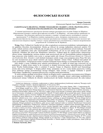 ФІЛОСОФСЬКІ НАУКИ Roman Turowski, (Uniwersytet Papieski Jana Pawła II w Krakowie) ZADZIWIAJĄCE ZBLIŻENIA: PIERRE TEILHARD DE CHARDIN A MYŚL PRAWOSŁAWNA TEOLOGICZNO-FILOZOFICZNA WG JERZEGO KLINGERA1 У статті представлено оригінальне бачення автора християнських поглядів Тейяра де Шардена. Обґрунтовано різницю в оцінках філософських поглядів Т. де Шардена – від категорично критичних до позитивних. Досліджувану проблему розглянуто в статті з позицій аналізу еволюційного монізму, трактування Т. де Шарденом питань первородного гріха, доктрини спокутування, космічного тлумачення Христа та есхатологічного бачення християнських доктрин. Сформульовано висновок про взаємозв’язок творчого доробку вченого з візією християнського еволюціонізму, а також теоретичними розробками В. Соловйова та М. Бердяєва. Wstęp. Pierre Teilhard de Chardin był nie tylko oryginalnym uczonym-przyrodnikiem i paleontologiem, ale też głębokim filozofem chrześcijańskim. Można go zaliczyć do szeregu najbardziej ciekawych autorów XX wieku. Jednak zarówno osoba Teilharda, jak też jego prace, do dziś są przedmiotem ostrych dyskusji. Francuski jezuita jest najbardziej znany jako chrześcijański ewolucjonista, ale nie na tym polega jego znaczenie jako myśliciela. Podobnie jak przed nim Włodzimierz Sołowiow, Teilhard dążył do wypracowania całościowego obrazu świata, obejmującego zarówno dyskurs nauk pozytywnych jak też chrześcijańską tradycję teologiczną. Jego mistyczne wizje znalazły swój wyraz w szeregu esejów jak Liturgia Wszechświata (Hymne de l’Univers) czy Środowisko Boże. Zawarte w tych dziełach koncepcje zostały swego czasu potępione przez Piusa XII, były też ostro krytykowane przez takich tomistów jak Jacques Maritain i Etiene Gilson. Teilhard miał jednak też wielu zwolenników, wśród których można wymienić kardynała Franza Königa czy kardynała Henri de Lubaca. Jeśli chodzi o ocenę Teilharda przez autorów prawosławnych, to zdania na temat jego twórczości też są podzielone. Z jednej strony mamy tu do czynienia ze skrajnie krytyczną oceną, reprezentowaną na przykład przez Wasilia Zieńkowskiego, który w artykule О трудах Тейярa де Шарденa określił myśl francuskiego jezuity jako nową mitologię.2 Z drugiej jednak strony, spotykamy się też z oceną bardzo pozytywną wydaną przez polskiego teologa prawosławnego Jerzego Klingera3, który uważał, iż poglądy Teilharda w sposób zadziwiający współbrzmią z egzegezą patrystyczną i rosyjską myślą prawosławną. W moim artykule spróbuję się przyjrzeć właśnie tej drugiej ocenie i argumentom stosowanym przez Klingera na jej poparcie. Chciałbym też, podążając w ślad za polskim teologiem, ukazać zadziwiające podobieństwa mistycznych intuicji Teilharda do obrazów metafizycznych tak bardzo charakterystycznych dla całej tradycji 1 Artykuł jest identyczny z referatem wygłoszonym w trakcie miedzynarodowej konferencji naukowej ''Recepcja myśli rosyjskiej w Europie'', Kraków, Akademia Ignatianum, 27-28 czerwca 2013. 2 Зеньковский В., О трудах Тейярa де Шарденa., [w:] Основы христ. философии, Париж, 1964, т. 2 (приложение II) 3 Jerzy Klinger urodził się w 1918 r. w Smoleńsku. Był jedynym synem Rosjanki Raisy Bakalińskiej i Polaka Witolda Klingera. Ojciec był profesorem filologii klasycznej na Uniwersytecie Kijowskim. Jerzy wychował się w rodzinie mieszanej, w atmosferze dwóch kultur i duchowości. W 1924 wraz z matką i ojcem on już mieszka w Poznaniu, gdzie kończy szkołę i dostaje się na Uniwersytet, równolegle na wydział polonistyki i filozofii. W latach studiów dał się poznać jako poeta i tłumacz poezji rosyjskiej, osobiście znał się z Tuwima i Staffem. Po wybuchu wojny przedostał się do Warszawy, gdzie ukrywał się jego ojciec, poszukiwany przez hitlerowców w ramach likwidacji naukowców polskich. W stolicy pracował jako sprzedawca żelaznych piecyków, udzielał się też, wraz z ojcem, jako nauczyciel łaciny i polskiego na tajnych kompletach. Wówczas Klinger brał też aktywny udział w życiu liturgicznym prawosławnej katedry pełniąc tam funkcję subdiakona. Tamtejszy metropolita Dionizy wprowadził Klingera do Prawosławnego Seminarium Duchownego w Warszawie. Po powstaniu warszawskim, w ślad za rodzicami, Klinger przedostał się do Krakowa, gdzie już po wojnie ukończył studia na wydziale filozoficznym Uniwersytetu Jagiellońskiego u Władysława Tatarkiewicza. Znajomość z Romanem Ingardenem, zainteresowanie fenomenologią, której ten był wybitnym przedstawicielem, ale bardziej jeszcze estetyką Ingardena legły u podstaw ogłoszonej przez Klingera pracy O strukturze dzieła poetyckiego. Studiował też w prawosławnym Instytucie św. Sergiusza w Paryżu. W 1952 Klinger otrzymał święcenia kapłańskie, po czym pracował jako proboszcz w Kętrzynie i w Warszawie, od 1968 - w parafii prawosławnej w Poznaniu. Napisał szereg artykułów o filozofii rosyjskiej oraz przetłumaczył na język polski Prawosławie Paula Evdokimova, jako pierwszy przywiózł z Paryża książki ważnych myślicieli rosyjskich. W 1962 Klinger uzyskał stopień doktora na podstawie rozprawy Eschatologiczny aspekt Eucharystii na tle genezy dwóch form konsekracyjnych w kanonie pierwszych wieków. W 1966 otrzymał nominację na docenta i objął 