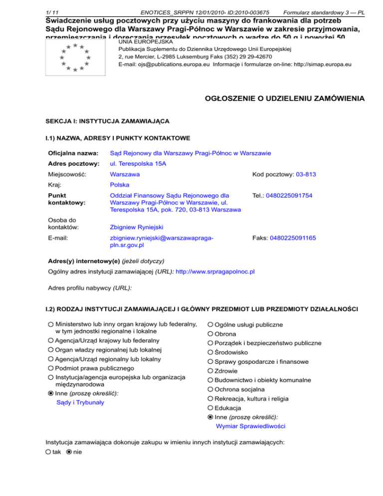 1/ 11 ENOTICES_SRPPN 12/01/2010- ID:2010-003675 Formularz standardowy 3 — PL Świadczenie usług pocztowych przy użyciu maszyny do frankowania dla potrzeb Sądu Rejonowego dla Warszawy Pragi-Północ w Warszawie w zakresie przyjmowania, przemieszczania i doręczania przesyłek pocztowych o wadze do 50 g i powyżej 50 UNIA EUROPEJSKA g oraz ich ewentualnych zwrotów, w do obrocie zagranicznym (do każdego Publikacja Suplementu Dziennikakrajowym Urzędowego iUnii Europejskiej miejsca w kraju i za 2, granicą) - świadczenie powszechnych usług pocztowych w rue Mercier, L-2985 Luksemburg Faks (352) 29 29-42670 rozumieniu ustawy zE-mail: [email protected] 12 czerwca 2003 r. Prawo pocztowe Dz. U. z 2008 r. Nr Informacje i formularze (t.j. on-line: http://simap.europa.eu 189, poz. 1159 z późn. zm.). Zgodnie z art. 46 ust. 1 ustawy Prawo pocztowe obowiązek wykonywania zadań operatora publicznego określonych w ustawie powierzony został "Poczcie Polskiej", a ponadto warunki wykonywania powszechnych usług pocztowych dotyczące między innymi liczby i sposobu rozmieszczenia operatora OGŁOSZENIE Oplacówek UDZIELENIU ZAMÓWIENIA spełnia w obecnej chwili tylko "Poczta Polska" zgodnie z rozporządzeniem Ministra Infrastruktury z dnia 9 stycznia 2004 r. (Dz. U. z 2004 r. Nr 5, poz. 34 z późn. zm.) - ZP/ SEKCJA F/7/09 I: INSTYTUCJA ZAMAWIAJĄCA I.1) NAZWA, ADRESY I PUNKTY KONTAKTOWE Oficjalna nazwa: Sąd Rejonowy dla Warszawy Pragi-Północ w Warszawie Adres pocztowy: ul. Terespolska 15A Miejscowość: Warszawa Kraj: Polska Punkt kontaktowy: Oddział Finansowy Sądu Rejonowego dla Warszawy Pragi-Północ w Warszawie, ul. Terespolska 15A, pok. 720, 03-813 Warszawa Osoba do kontaktów: E-mail: Kod pocztowy: 03-813 Tel.: 0480225091754 Zbigniew Ryniejski [email protected] Faks: 0480225091165 Adres(y) internetowy(e) (jeżeli dotyczy) Ogólny adres instytucji zamawiającej (URL): http://www.srpragapolnoc.pl Adres profilu nabywcy (URL): ________________________________________ I.2) RODZAJ INSTYTUCJI ZAMAWIAJĄCEJ I GŁÓWNY PRZEDMIOT LUB PRZEDMIOTY DZIAŁALNOŚCI Ministerstwo lub inny organ krajowy lub federalny, w tym jednostki regionalne i lokalne Ogólne usługi publiczne Agencja/Urząd krajowy lub federalny Porządek i bezpieczeństwo publiczne Organ władzy regionalnej lub lokalnej Agencja/Urząd regionalny lub lokalny Podmiot prawa publicznego Instytucja/agencja europejska lub organizacja międzynarodowa Inne (proszę określić): Sądy i Trybunały Obrona Środowisko Sprawy gospodarcze i finansowe Zdrowie Budownictwo i obiekty komunalne Ochrona socjalna Rekreacja, kultura i religia Edukacja Inne (proszę określić): Wymiar Sprawiedliwości Instytucja zamawiająca dokonuje zakupu w imieniu innych instytucji zamawiających: tak nie 2/ 11 ENOTICES_SRPPN 12/01/2010- ID:2010-003675 Formularz standardowy 3 — PL Świadczenie usług pocztowych przy użyciu maszyny do frankowania dla potrzeb Sądu Rejonowego dla Warszawy Pragi-Północ w Warszawie w zakresie przyjmowania, przemieszczania i doręczania przesyłek pocztowych o wadze do 50 g i powyżej 50 g oraz ich ewentualnych zwrotów, w obrocie krajowym i zagranicznym (do każdego SEKCJA II: PRZEDMIOT ZAMÓWIENIA miejsca w kraju i za granicą) - świadczenie powszechnych usług pocztowych w rozumieniu ustawy z dnia 12 czerwca 2003 r. Prawo pocztowe (t.j. Dz. U. z 2008 r. Nr II.1) OPIS 189, poz. 1159 z późn. zm.). Zgodnie z art. 46 ust. 1 ustawy Prawo pocztowe obowiązek II.1.1) Nazwa nadana zamówieniu przez instytucję zamawiającą wykonywania zadań operatora publicznego określonych w ustawie powierzony został Świadczenie usług pocztowych przy użyciu maszyny do frankowania dla potrzeb Sądu Rejonowego dla "Poczcie Polskiej", wa Warszawie ponadto wwarunki wykonywania powszechnych usługprzesyłek pocztowych Warszawy Pragi-Północ zakresie przyjmowania, przemieszczania i doręczania dotycząceo między liczby50i gsposobu rozmieszczenia operatora pocztowych wadze doinnymi 50 g i powyżej oraz ich ewentualnych zwrotów,placówek w obrocie krajowym i zagranicznym (do każdego miejsca w kraju i za granicą) - świadczenie usług pocztowych w spełnia w obecnej chwili tylko "Poczta Polska" zgodniepowszechnych z rozporządzeniem Ministra rozumieniu ustawy z dnia 12 czerwca 2003 r. Prawo pocztowe (t.j. Dz. U. z 2008 r. Nr 189, poz. 1159 z późn. Infrastruktury z dnia 9 stycznia 2004 r. (Dz. U. z 2004 r. Nr 5, poz. 34 z późn. zm.) - ZP/ zm.). Zgodnie z art. 46 ust. 1 ustawy Prawo pocztowe obowiązek wykonywania zadań operatora publicznego F/7/09 określonych w ustawie powierzony został "Poczcie Polskiej", a ponadto warunki wykonywania powszechnych usług pocztowych dotyczące między innymi liczby i sposobu rozmieszczenia placówek operatora spełnia w obecnej chwili tylko "Poczta Polska" zgodnie z rozporządzeniem Ministra Infrastruktury z dnia 9 stycznia 2004 r. (Dz. U. z 2004 r. Nr 5, poz. 34 z późn. zm.) - ZP/F/7/09 II.1.2) Rodzaj zamówienia oraz lokalizacja robót budowlanych, miejsce realizacji dostawy lub świadczenia usług (Wybrać wyłącznie jedną kategorię – roboty budowlane, dostawy lub usługi – która najbardziej odpowiada konkretnemu przedmiotowi zamówienia lub zakupu) a) Roboty budowlane b) Dostawy Wykonanie Kupno Zaprojektowanie i wykonanie Wykonanie, za pomocą dowolnych środków, obiektu budowlanego, odpowiadającego wymogom określonym przez instytucję zamawiającą Dzierżawa c) Usługi Najem Leasing Połączenie powyższych form Kategoria usługi: nr 27 W przypadku zamówień na usługi kategorii 17-27 (zob. załącznik C), czy zgadzają się Państwo na publikację niniejszego ogłoszenia? tak nie Lokalizacja robót budowlanych, miejsce realizacji dostaw lub świadczenia usług Siedziba Sądu Rejonowego dla Warszawy Pragi-Północ w Warszawie Kod NUTS Â PL127 II.1.3) Ogłoszenie dotyczy (jeżeli dotyczy) Zawarcia umowy ramowej Zamówień w ramach Dynamicznego Systemu Zakupów (DSZ) II.1.4) Krótki opis